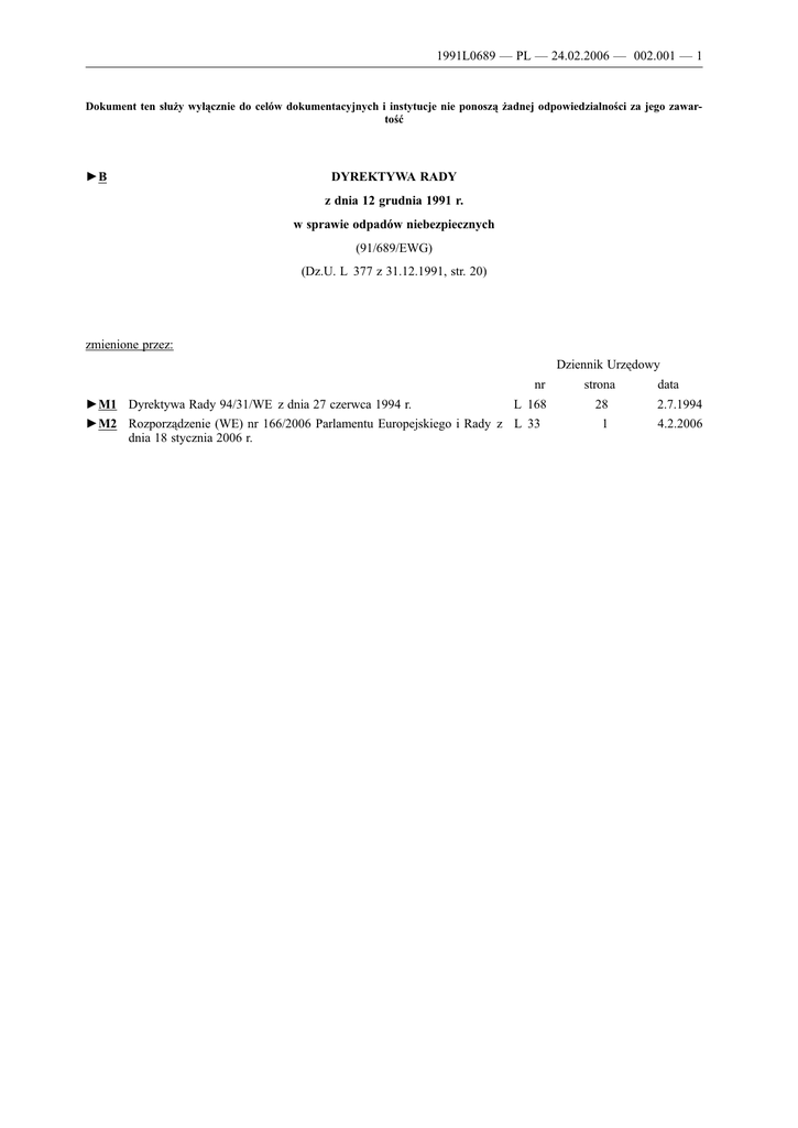 1991L0689 — PL — 24.02.2006 — 002.001 — 1 Dokument ten służy wyłącznie do celów dokumentacyjnych i instytucje nie ponoszą żadnej odpowiedzialności za jego zawartość ►B DYREKTYWA RADY z dnia 12 grudnia 1991 r. w sprawie odpadów niebezpiecznych (91/689/EWG) (Dz.U. L 377 z 31.12.1991, str. 20) zmienione przez: Dziennik Urzędowy nr ►M1 Dyrektywa Rady 94/31/WE z dnia 27 czerwca 1994 r. L 168 ►M2 Rozporządzenie (WE) nr 166/2006 Parlamentu Europejskiego i Rady z L 33 dnia 18 stycznia 2006 r. strona data 28 2.7.1994 1 4.2.2006 1991L0689 — PL — 24.02.2006 — 002.001 — 2 ▼B DYREKTYWA RADY z dnia 12 grudnia 1991 r. w sprawie odpadów niebezpiecznych (91/689/EWG) RADA WSPÓLNOT EUROPEJSKICH, uwzględniając Traktat ustanawiający Europejską Wspólnotę Gospodarczą, w szczególności jego art. 130s, uwzględniając wniosek Komisji (1), uwzględniając opinię Parlamentu Europejskiego (2), uwzględniając opinię Komitetu Ekonomiczno-Społecznego (3), a także mając na uwadze, co następuje: dyrektywa Rady 78/319/EWG z dnia 20 marca 1978 r. w sprawie odpadów toksycznych i niebezpiecznych (4) ustanowiła zasady wspólnotowe w sprawie unieszkodliwiania odpadów niebezpiecznych; w celu uwzględnienia doświadczenia zyskanego przy wykonywaniu tej dyrektywy przez Państwa Członkowskie konieczna jest zmiana zasad i zastąpienie dyrektywy 78/319/EWG niniejszą dyrektywą; rezolucja Rady z dnia 7 maja 1990 r. w sprawie polityki gospodarowania odpadami (5) i program działań Wspólnot Europejskich w zakresie środowiska, który był przedmiotem rezolucji Rady Wspólnot Europejskich i przedstawicieli rządów Państw Członkowskich zebranych w Radzie z dnia 19 października 1987 r. w sprawie kontynuacji i wprowadzania w życie polityki i programu działań Wspólnoty Europejskiej w zakresie środowiska (na lata 1987—1992) (6) przewidują środki wspólnotowe mające na celu poprawę warunków, w jakich odpady niebezpieczne są unieszkodliwiane i zagospodarowywane; ogólne zasady stosujące się do gospodarowania odpadami, które są przewidziane w dyrektywie Rady 75/442/EWG z dnia 15 lipca 1975 r. w sprawie odpadów (7), zmienionej dyrektywą Rady 91/156/EWG (8), także znajdują zastosowanie do gospodarowania odpadami niebezpiecznymi; prawidłowe gospodarowanie odpadami niebezpiecznymi wymaga dodatkowych, bardziej rygorystycznych zasad, aby uwzględnić szczególny charakter takich odpadów; konieczne jest, w celu poprawy skuteczności gospodarowania odpadami niebezpiecznymi we Wspólnocie, używanie precyzyjnej i jednolitej definicji odpadów niebezpiecznych, opartej na doświadczeniu; konieczne jest zapewnienie, by unieszkodliwianie i odzysk odpadów niebezpiecznych były kontrolowane w możliwie najpełniejszy sposób; dostosowanie przepisów niniejszej dyrektywy do postępu naukowego i technicznego musi nastąpić możliwie szybko; Komitet ustanowiony dyrektywą 75/442/EWG musi być także upoważniony do dostosowania przepisów niniejszej dyrektywy do takiego postępu, PRZYJMUJE NINIEJSZĄ DYREKTYWĘ: Artykuł 1 1. Celem niniejszej dyrektywy, przyjętej na mocy art. 2 ust. 2 dyrektywy 75/442/EWG, jest zbliżenie ustawodawstw Państw Członkowskich w sprawie kontrolowanego gospodarowania odpadami niebezpiecznymi. (1) (2) (3) (4) (5) (6) (7) (8) Dz.U. C 295 z 19.11.1988, str. 8 orazDz.U. C 42 z 22.2.1990, str. 19. Dz.U. C 158 z 26.6.1989, str. 238. Dz.U. C 56 z 6.3.1989, str. 2. Dz.U. L 84 z 31.3.1978, str. 43. Dz.U. C 122 z 18.5.1990, str. 2. Dz.U. C 328 z 7.12.1987, str. 1. Dz.U. L 194 z 25.7 1975, str. 39. Dz.U. L 78 z 26.3 1991, str. 32. 1991L0689 — PL — 24.02.2006 — 002.001 — 3 ▼B 2. Z zastrzeżeniem przepisów niniejszej dyrektywy, dyrektywa 75/442/EWG stosuje się do odpadów niebezpiecznych. 3. Definicja „odpadów” i inne terminy użyte w niniejszej dyrektywie są definicjami z dyrektywy 75/442/EWG. 4. Do celów niniejszej dyrektywy „odpady niebezpieczne” oznaczają: — odpady znajdujące się w wykazie, który ma być przygotowany zgodnie z procedurą przewidzianą w art. 18 dyrektywy 75/442/EWG na podstawie załączników I i II do niniejszej dyrektywy, nie później niż sześć miesięcy przed datą wprowadzenia w życie niniejszej dyrektywy. Odpady te muszą mieć co najmniej jedną z właściwości wymienionych w załączniku III. W wykazie tym uwzględnia się pochodzenie i skład odpadów oraz, w miarę potrzeby, dopuszczalne wartościstężenia. Wykaz ten jest poddawany okresowemu przeglądowi i, w razie konieczności, w drodze takiej samej procedury zmieniany, — wszelkie inne odpady, uznawane przez Państwo Członkowskie za wykazujące którąkolwiek z właściwości wymienionych w załączniku III. O takich przypadkach informuje się Komisję, przy czym są one poddawane przeglądowi zgodnie z procedurą ustanowioną w art. 18 dyrektywy 75/442/EWG w celu dostosowania tego wykazu. 5. Odpady z gospodarstw domowych są wyłączone z przepisów niniejszej dyrektywy. Rada ustanawia, na wniosek Komisji, szczegółowe zasady uwzględniające szczególny charakter odpadów z gospodarstw domowych nie później niż do końca 1992 r. Artykuł 2 1. Państwa Członkowskie podejmują konieczne działania w celu zapewnienia, aby odpady były rejestrowane i identyfikowane w każdym miejscu, gdzie odbywa się zwałowanie (zrzut) odpadów niebezpiecznych. 2. Państwa Członkowskie podejmują konieczne działania w celu zapewnienia, aby zakład lub przedsiębiorstwo, które unieszkodliwia, odzyskuje, gromadzi lub transportuje niebezpieczne odpady, nie mieszały różnych kategorii odpadów niebezpiecznych lub by nie mieszały odpadów niebezpiecznych z odpadami innymi niż niebezpieczne. 3. Na zasadzie odstępstwa od ust. 2, mieszanie odpadów niebezpiecznych z innymi odpadami niebezpiecznymi lub innymi odpadami, substancjami i materiałami może być dozwolone tylko w takich przypadkach, gdzie są przestrzegane warunki ustanowione w art. 4 d