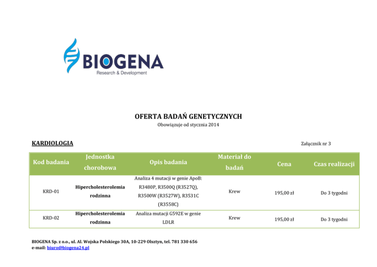 OFERTA BADAŃ GENETYCZNYCH Obowiązuje od stycznia 2014 KARDIOLOGIA Kod badania Załącznik nr 3 Jednostka chorobowa Opis badania Materiał do Cena Czas realizacji Krew 195,00 zł Do 3 tygodni Krew 195,00 zł Do 3 tygodni badań Analiza 4 mutacji w genie ApoB: KRD-01 Hipercholesterolemia R3480P, R3500Q (R3527Q), rodzinna R3500W (R3527W), R3531C (R3558C) KRD-02 Hipercholesterolemia Analiza mutacji G592E w genie rodzinna LDLR BIOGENA Sp. z o.o., ul. Al. Wojska Polskiego 30A, 10-229 Olsztyn, tel. 781 330 656 e-mail: [email protected] Panel: Analiza 4 mutacji w genie KRD-03 Hipercholesterolemia rodzinna ApoB: R3480P, R3500Q (R3527Q), R3500W (R3527W), R3531C Krew 370,00 zł Do 3 tygodni Krew 195,00 zł Do 2 tygodni Krew 195,00 zł Do 2 tygodni Krew 195,00 zł Do 2 tygodni Krew 450,00 zł Do 2 tygodni (R3558C), Analiza mutacji G592E w genie LDLR KRD-04 Zakrzepica żył Analiza mutacji Leiden genu F5, c.1601G>A (p.R534Q) Analiza mutacji c.*97G>A (stara KRD-05 Zakrzepica żył nazwa: 20210G>A) w genie protrombiny (F2, czynnik II krzepnięcia krwi) Analiza mutacji 677C>T oraz KRD-06 Zakrzepica żył A1298A>C w genie MTHFR (reduktaza 5,10 – metylenotetrahydrofolianu) Panel: analiza mutacji Leiden w genie F5, analiza mutacji 20210G>A w genie protrombiny KRD-07 Zakrzepica żył (czynnik II krzepnięcia krwi), analiza mutacji 677C>T oraz A1298A>C w genie MTHFR (reduktaza 5,10 – metylenotetrahydrofolianu) BIOGENA Sp. z o.o., ul. Al. Wojska Polskiego 30A, 10-229 Olsztyn, tel. 781 330 656 e-mail: [email protected] KRD-08 Kardiomiopatia przerostowa KRD-09 Zespół Marfana KRD-10 Zespół Marfana KRD-11 KRD-12 Zespół hipoplazji lewego serca Kardiomiopatia przerostowa Badanie 132 najczęstszych mutacji w genie MYH7 (eksony od 13 do 24) Krew 875,00 zł Do 3 tygodni Krew 810,00 zł Do 2 tygodni Krew 2680,00 zł Do 4 tygodni Krew 430,00 zł Do 2 tygodni Krew 810,00 zł Do 3 tygodni Krew 810,00 zł Do 3 tygodni Krew 625,00 zł Do 3 tygodni Krew 335,00 zł Do 2 tygodni - I etap diagnostyki Analiza mutacji w genie FBN1 (eksony 24-32) Analiza mutacji w eksonach od 1 do 23 genu FBN1 – II etap diagnostyki Analiza mutacji w genie GJA1 Analiza najczęstszych mutacji w genie MYBPC3 - II etap diagnostyki Analiza najczęstszych mutacji KRD-13 Kardiomiopatia w genie TNNT2 (eksony przerostowa 8,9,10,11,12,13,14,15) - III etap diagnostyki KRD-14 KRD-15 Kardiomiopatia przerostowa Predyspozycja do zawału serca Analiza najczęstszych mutacji w genie LMNA (eksony3,4,5,6,7,8,9,10) - IV etap diagnostyki Analiza mutacji R952Q w genie LRP8 oraz wariantu CYP1A2*1F BIOGENA Sp. z o.o., ul. Al. Wojska Polskiego 30A, 10-229 Olsztyn, tel. 781 330 656 e-mail: [email protected] Analiza mutacji w eksonach 2, 3, 4, KRD-16 Zespół Noonan 7, 8, 9, 12 i 13 genu PTPN11 Krew 625,00 zł Do 2 tygodni Krew 1230,00 zł Do 3 tygodni Krew 1750,00 zł Do 3 tygodni Krew 1375,00 zł Do 4 tygodni Krew 1500,00 zł Do 4 tygodni Krew 690,00 zł Do 3 tygodni Krew 370,00 zł Do 3 tygodni - I etap diagnostyki Analiza mutacji w genie SOS1 KRD-17 Zespół Noonan (eksony 4, 5, 7, 8, 9, 11, 12, 13, 14, 15, 17) - II etap diagnostyki Analiza mutacji w genie SOS1 KRD-18 Zespół Noonan (eksony 2, 3, 6, 10, 16, 18-24) – III etap diagnostyki Analiza mutacji w genie PTPN11 KRD-19 Zespół Noonan (eksony 1,5,6,10,11,14,15) orazw genie RAF1 (eksony 7,12,14,17) - IV etap diagnostyki KRD-20 Zespół Noonan KRD-21 Zespół Noonan Analiza mutacji w genie RAF1 (eksony 1-6, 8-11,13,15,16) Analiza mutacji w genie KRAS (eksony 1-6) Analiza mutacji Glu167Asp w genie MASTL oraz c.1-116C>T, KRD-22 Trombocytopenia c.-118C>T, c.1-125T>G, c.1-127A>T, (małopłytkowość) c.1-128G>A, c.1-134G>A w genie ANKRD26 BIOGENA Sp. z o.o., ul. Al. Wojska Polskiego 30A, 10-229 Olsztyn, tel. 781 330 656 e-mail: [email protected] Candersartan, Irbesartan, Losartan, KRD-23 Warfaryna - ocena aktywności Identyfikacja wariantów CYP2C9*2, *3 Krew 580,00 zł Do 3 tygodni Krew 340,00 zł Do 3 tygodni Krew 480,00 zł Do 3 tygodni Krew 1785,00 zł Do 4 tygodni Krew 400,00 zł Do 3 tygodni cytochromu CYP2C9 Carvedilol, Metoprolol, KRD-24 Propranolol i Timolol Identyfikacja wariantu CYP2D6*4 – ocena aktywności cytochromu CYP2D6 KRD-25 Tętniaki Badanie mutacji R179H, R258H, i rozwarstwienia R258C w genie ACTA2 (inne nazwy aorty piersiowej MYMY5, AAT6)- I etap procedury (TAAD) diagnostycznej Tętniaki KRD-26 i rozwarstwienia aorty piersiowej (TAAD) Badanie regionu kodującego genu ACTA2 (inne nazwy genu: MYMY5, AAT6) Tętniaki i rozwarstwienia KRD-27 aorty piersiowej (TAAD) Badanie mutacji R460C i R460H w genie TGFBR2 BIOGENA Sp. z o.o., ul. Al. Wojska Polskiego 30A, 10-229 Olsztyn, tel. 781 330 656 e-mail: [email protected] Tętniaki KRD-28 i rozwarstwienia Badanie regionu kodujacego genu aorty piersiowej TGFBR2 Krew 1900,00 zł Do 4 tygodni Krew 2000,00 zł Do 4 tygodni Krew 650,00 zł Do 3 tygodni Krew 350,00 zł Do 2 tygodni Krew 580,00 zł Do 3 tygodni (TAAD) Tętniaki KRD-29 i rozwarstwienia Badanie wybranych regionów genu aorty piersiowej TGFBR1 (TAAD) Tętniaki KRD-30 i rozwarstwienia Badanie mutacji L1264P, L1275L aorty piersiowej i R712Q w genie MYH11 (TAAD) Warfaryna identyfikacja KRD-31 genotypu związanego z aktywnością Identyfikacja wariantu 1173C>T w genie VKORC1 enzymu VKOR Candersartan, Irbesartan, Losartan, KRD-32 Warfaryna – ocena aktywności Identyfikacja wariantów CYP2C9*2, *3 cytochromu CYP2C9 BIOGENA Sp. z o.o., ul. Al. Wojska Polskiego 30A, 10-229 Olsztyn, tel. 781 330 656 e-mail: [email protected]