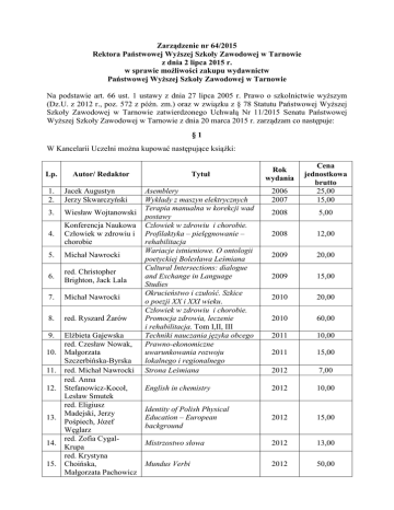 Zarządzenie nr 64/2015 Rektora Państwowej Wyższej Szkoły Zawodowej w Tarnowie z dnia 2 lipca 2015 r. w sprawie możliwości zakupu wydawnictw Państwowej Wyższej Szkoły Zawodowej w Tarnowie Na podstawie art. 66 ust. 1 ustawy z dnia 27 lipca 2005 r. Prawo o szkolnictwie wyższym (Dz.U. z 2012 r., poz. 572 z późn. zm.) oraz w związku z § 78 Statutu Państwowej Wyższej Szkoły Zawodowej w Tarnowie zatwierdzonego Uchwałą Nr 11/2015 Senatu Państwowej Wyższej Szkoły Zawodowej w Tarnowie z dnia 20 marca 2015 r. zarządzam co następuje: §1 W Kancelarii Uczelni można kupować następujące książki: Lp. 1. 2. Jacek Augustyn Jerzy Skwarczyński 3. Wiesław Wojtanowski 4. Konferencja Naukowa Człowiek w zdrowiu i chorobie 5. Michał Nawrocki 6. red. Christopher Brighton, Jack Lala 7. Michał Nawrocki 8. red. Ryszard Żarów 9. Elżbieta Gajewska red. Czesław Nowak, Małgorzata Szczerbińska-Byrska red. Michał Nawrocki red. Anna Stefanowicz-Kocoł, Lesław Smutek red. Eligiusz Madejski, Jerzy Pośpiech, Józef Węglarz red. Zofia CygalKrupa red. Krystyna Choińska, Małgorzata Pachowicz 10. 11. 12. 13. 14. 15. 2006 2007 Cena jednostkowa brutto 25,00 15,00 2008 5,00 2008 12,00 2009 20,00 2009 15,00 2010 20,00 2010 60,00 2011 10,00 2011 15,00 2012 7,00 English in chemistry 2012 10,00 Identity of Polish Physical Education – European background 2012 15,00 Mistrzostwo słowa 2012 13,00 Mundus Verbi 2012 50,00 Autor/ Redaktor Tytuł Asemblery Wykłady z maszyn elektrycznych Terapia manualna w korekcji wad postawy Człowiek w zdrowiu i chorobie. Profilaktyka – pielęgnowanie – rehabilitacja Wariacje istnieniowe. O ontologii poetyckiej Bolesława Leśmiana Cultural Intersections: dialogue and Exchange in Language Studies Okrucieństwo i czułość. Szkice o poezji XX i XXI wieku. Człowiek w zdrowiu i chorobie. Promocja zdrowia, leczenie i rehabilitacja. Tom I,II, III Techniki nauczania języka obcego Prawno-ekonomiczne uwarunkowania rozwoju lokalnego i regionalnego Strona Leśmiana Rok wydania 16. red. Jan Tylka, Beata Ogórek-Tęcza 17. Michał Nawrocki 18. Adam Juszkiewicz 23. red. Eliza KrzyńskaNawrocka red. Anna Grabowska, Joanna Graca, Leszek Smutek red. Eliza KrzyńskaNawrocka, Michał Nawrocki Krystyna Choińska, Jadwiga Kowalikowa, Małgorzata Pachowicz Stanisław Jaworski 24. red. Ryszard Żarow 25. red. Małgorzata Pachowicz 26 red. Krzysztof Firlej, Dariusz Żmija 19. 20. 21. 22. Propozycje oddziaływań psychoprofilaktycznych dla osób z chorobami układu krążenia ustalone w oparciu o badania kliniczne Wspomnienia o rzeczach, które nie istniały. Eseje na czas niepokoju PWSZ w Tarnowie. Projekt mojego życia 15 lat Państwowej Wyższej Szkoły Zawodowej w Tarnowie 2012 12,00 2013 15,00 2013 12,00 2013 25,00 Problemy współczesnej neofilologii. Wybrane zagadnienia 2013 35,00 Wyobraźnia, pamięć, tożsamość. Studia – szkice - interpretacje 2014 10,00 Warsztat pisarski autora pierwszej polonistycznej pracy dyplomowej 2014 15,00 Maski, gesty, słowa 2014 20,00 2014 47,00 2015 10,00 2015 12,00 Człowiek w zdrowiu i chorobie. Promocja zdrowia. Leczenie i rehabilitacja Żywa gwara. Rozważania o gwarach polskich na początku XXI wieku Konsument XXI wieku – myślę i kupuję §2 Traci moc Zarządzenie nr 4/2015 Rektora Państwowej Wyższej Szkoły Zawodowej w Tarnowie z dnia 23 stycznia 2015 roku w sprawie możliwości zakupu wydawnictw Państwowej Wyższej Szkoły Zawodowej w Tarnowie. §3 Zarządzenie wchodzi w życie z dniem podpisania. REKTOR prof. dr hab. Stanisław Komornicki