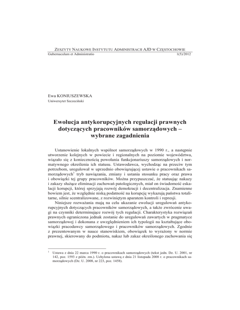 ZESZYTY NAUKOWE INSTYTUTU ADMINISTRACJI AJD W CZĉSTOCHOWIE Gubernaculum et Administratio 1(5)/2012 Ewa KONIUSZEWSKA Uniwersytet SzczeciĔski Ewolucja antykorupcyjnych regulacji prawnych dotyczących pracowników samorządowych – wybrane zagadnienia Ustanowienie lokalnych wspólnot samorządowych w 1990 r., a nastĊpnie utworzenie kolejnych w powiecie i regionalnych na poziomie województwa, wiązaáo siĊ z koniecznoĞcią powoáania funkcjonariuszy samorządowych i normatywnego okreĞlenia ich statusu. Ustawodawca, wychodząc na przeciw tym potrzebom, uregulowaá w uprzednio obowiązującej ustawie o pracownikach samorządowych1 tryb nawiązania, zmiany i ustania stosunku pracy oraz prawa i obowiązki tej grupy pracowników. MoĪna przypuszczaü, Īe statuując nakazy i zakazy sáuĪące eliminacji zachowaĔ patologicznych, miaá on ĞwiadomoĞü eskalacji korupcji, której sprzyjają rozwój demokracji i decentralizacja. Znamienne bowiem jest, Īe wzglĊdnie niską podatnoĞü na korupcjĊ wykazują paĔstwa totalitarne, silnie scentralizowane, z rozwiniĊtym aparatem kontroli i represji. Niniejsze rozwaĪania mają na celu ukazanie ewolucji uregulowaĔ antykorupcyjnych dotyczących pracowników samorządowych, a takĪe zwrócenie uwagi na czynniki determinujące rozwój tych regulacji. Charakterystyka rozwiązaĔ prawnych ograniczona jednak zostanie do uregulowaĔ zawartych w pragmatyce samorządowej i dokonana z uwzglĊdnieniem ich typologii na ksztaátujące obowiązki pracodawcy samorządowego i pracowników samorządowych. Zgodnie z prezentowanym w nauce stanowiskiem, obowiązek to wyraĪony w normie prawnej, skierowany do podmiotu, nakaz lub zakaz okreĞlonego zachowania siĊ 1 Ustawa z dnia 22 marca 1990 r. o pracownikach samorządowych (tekst jedn. Dz. U. 2001, nr 142, poz. 1593 z póĨn. zm.). Uchylona ustawą z dnia 21 listopada 2008 r. o pracownikach samorządowych (Dz. U. 2008, nr 223, poz. 1458). 108 Ewa KONIUSZEWSKA w danej sytuacji2. Obowiązek moĪe mieü charakter pozytywny (obowiązek do dziaáania) lub negatywny (obowiązek zaniechania)3. Obowiązek o charakterze negatywnym, mający na celu eliminacjĊ podejrzeĔ o nepotyzm i stronniczoĞü powodowaną powiązaniami rodzinnymi, sformuáowany zostaá w art. 6 uprzednio obowiązującej ustawy o pracownikach samorządowych. Warto jednak podkreĞliü, Īe obciąĪaá on pracodawcĊ samorządowego, a nie pracownika. Ustawodawca ustanowiá bowiem zakaz zatrudniania w urzĊdzie gminy oraz w jednostkach wyszczególnionych w przepisach ustawy maáĪonków, osób pozostających ze sobą w stosunku pokrewieĔstwa do drugiego stopnia wáącznie lub powinowactwa pierwszego stopnia, jeĪeli powstaáby miĊdzy tymi osobami stosunek bezpoĞredniej podlegáoĞci sáuĪbowej. NastĊpnie nowelą z dnia 29 grudnia 1998 r.4 zakazem tym objĊto takĪe osoby poáączone z pracownikiem samorządowym wĊzáem prawnym (stosunkiem przysposobienia, opieki lub kurateli). W doktrynie akcentuje siĊ, Īe stosunek bezpoĞredniej podlegáoĞci sáuĪbowej zachodzi zazwyczaj wówczas, gdy jeden z krewnych lub powinowatych jest bezpoĞrednim przeáoĪonym drugiego5. Godzi siĊ zauwaĪyü, Īe mimo ustanowienia zakazu nie zostaáy okreĞlone skutki prawne jego naruszenia. Braku tego nie usunĊáy takĪe postanowienia nowo uchwalonej ustawy o pracownikach samorządowych6. Wobec milczenia ustawodawcy naleĪy podzieliü pogląd prezentowany w piĞmiennictwie, zgodnie z którym pracodawca ma obowiązek zapewnienia stanu zgodnego z prawem. JeĪeli wiĊc stosunek bezpoĞredniej podlegáoĞci powstaá miĊdzy pracownikami zatrudnionymi na podstawie umowy o pracĊ, naleĪy dokonaü koniecznych zmian w drodze porozumienia stron lub wypowiedzenia zmieniającego7. Kolejny obowiązek spoczywający na pracodawcy samorządowym, którego urzeczywistnienie wydaje siĊ sprzyjaü ograniczaniu zjawiska nepotyzmu w administracji samorządowej, wiąĪe siĊ z koniecznoĞcią przestrzegania okreĞlonej ustawowo procedury naboru. Do 2005 r. nie obowiązywaáy regulacje prawne normujące sposób obsadzania wakujących stanowisk w administracji samorządowej. Ustawodawca, nowelizując uprzednio obowiązującą pragmatykĊ samo- 2 3 4 5 6 7 A. Redelbach, S. Wronkowska, Z. ZiembiĔski, Zarys teorii paĔstwa i prawa, Warszawa 1992, s. 144 i nn. W. Lang, J. Wróblewski, S. Zawadzki, Teoria paĔstwa i prawa, Warszawa 1980, s. 324 i nn. Ustawa z dnia 29 grudnia 1998 r. o zmianie niektórych ustaw w związku z wdroĪeniem reformy ustrojowej paĔstwa (Dz. U. 1998, nr 162, poz. 1126 z póĨn. zm.). H. Szewczyk, Ograniczenia prawa do pracy w samorządzie po wejĞciu w Īycie reformy administracji publicznej, „Samorząd Terytorialny” 2000, nr 11, s. 54. Ustawa z dnia 21 listopada 2008 r. o pracownikach samorządowych (Dz. U. 2008, nr 223, poz. 1458). B. Cudowski, Ograniczenia swobody zatrudnienia pracowników samorządowych i czáonków korpusu sáuĪby cywilnej, [w:] Stosunki pracy w sáuĪbie cywilnej i samorządzie terytorialnym, red. W. Sanetra, Biaáystok 2001, s. 78. Ewolucja antykorupcyjnych regulacji prawnych… 109 rządową8, uczyniá nabór na wolne stanowiska urzĊdnicze lub kierownicze stanowiska urzĊdnicze w samorządowym urzĊdzie lub jednostce organizacyjnej otwartym i konkurencyjnym. Zobligowaá on bowiem pracodawcĊ samorządowego do ogáaszania o wolnym stanowisku oraz o organizowanym na nie naborze kandydatów w Biuletynie Informacji Publicznej, jak równieĪ na tablicy informacyjnej w jednostce, w której prowadzony jest nabór. Sprecyzowaá warunki formalne, jakim powinno odpowiadaü ogáoszenie o naborze i zakreĞliá termin skáadania dokumentów. Ustanowiony zostaá teĪ nakaz upowszechnienia listy kandydatów speániających wymagania wskazane w ogáoszeniu oraz sporządzenia protokoáu z przeprowadzonego naboru. Na pracodawcĊ naáoĪono takĪe obowiązek ujawnienia wyniku naboru poprzez umieszczenie stosownej informacji w Biuletynie i na tablicy inform