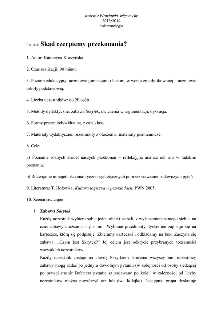 Jestem z Wrocławia, więc myślę 2013/2014 epistemologia Temat: Skąd czerpiemy przekonania? 1. Autor: Katarzyna Kuczyńska 2. Czas realizacji: 90 minut. 3. Poziom edukacyjny: uczniowie gimnazjum i liceum, w wersji zmodyfikowanej – uczniowie szkoły podstawowej. 4. Liczba uczestników: do 20 osób. 5. Metody dydaktyczne: zabawa Skrytek, ćwiczenia w argumentacji, dyskusja. 6. Formy pracy: indywidualna, z całą klasą. 7. Materiały dydaktyczne: przedmioty z otoczenia, materiały piśmiennicze. 8. Cele: a) Poznanie różnych źródeł naszych przekonań – refleksyjna analiza ich roli w ludzkim poznaniu. b) Rozwijanie umiejętności analityczno-syntetycznych poprzez stawianie badawczych pytań. 9. Literatura: T. Hołówka, Kultura logiczna w przykładach, PWN 2005. 10. Scenariusz zajęć 1. Zabawa Skrytek: Każdy uczestnik wybiera sobie jeden obiekt na sali, z wyłączeniem samego siebie, na czas zabawy utożsamia się z nim. Wybrane przedmioty dyskretnie zapisuje się na karteczce, którą się podpisuje. Zbieramy karteczki i odkładamy na bok. Zaczyna się zabawa: „Czym jest Skrytek?” Jej celem jest odkrycie przybranych tożsamości wszystkich uczestników. Każdy uczestnik zostaje na chwilę Skrytkiem, któremu wszyscy inni uczestnicy zabawy mogą zadać po jednym dowolnym pytaniu (w kolejności od osoby siedzącej po prawej stronie Bohatera pytanie są zadawane po kolei, w zależności od liczby uczestników można powtórzyć raz lub dwa kolejkę). Następnie grupa dyskutuje Jestem z Wrocławia, więc myślę 2013/2014 epistemologia między sobą i wybiera trzy propozycje odpowiedzi na pytanie, czym jest Skrytkiem. Skrytek nie może kłamać, odpowiadając na pytania, ale powinien starać się udzielić odpowiedzi możliwie skąpych informacyjnie. Jeśli jego tożsamość nie zostanie odkryta, Skrytek zyskuje tytuł Sprytka. Uwaga techniczna - uczestnicy mają za zadnie wybrać konkretny obiekt z sali, ale potem mają tendencję do traktowania go w sensie ogólnym (np. choć wybrana firanka jest seledynowa i w motyle, to Skrytek odpowiada, że kolor zależy od tego, kto jak go zafarbuje) - wierności konkretowi należy pilnować. 2. Ćwiczenie w argumentacji: Po zakończeniu zabawy wszyscy uczestnicy mają zapisać 3 argumenty na rzecz tezy, że nie są obiektem, z którym w trakcie zabawy się utożsamili. Następnie do tych argumentów dopisują, skąd je wzięli, czyli źródła danego przekonania (np.: „Nie jestem haczykiem, ponieważ żyję, a haczyk jest nieżywy”; źródła: doświadczenie wewnętrzne/poczucie „żyję”; wiedza przyrodnicza). 3. Analizowanie argumentów - rozpoznawanie źródeł poznania: [14 min] Uczestnicy zajęć odczytują swoje wypowiedzi. Wspólnie je uzupełniamy (zazwyczaj pojedynczej osobie przychodzi do głowy tylko jedno źródło). Podane odpowiedzi dzielimy na rodzaje: spostrzeżenie/obserwacja; a) b) własne doświadczenie: autorytet osób, zewnętrzne, zbiorowości wewnętrzne; (intersubiektywne doświadczenie), instytucji, tutaj np. wiedza naukowa, religijna, obyczajowa – pewną tezę naukową możemy czerpać z nauki jako takiej i jej autorytetu, albo możemy ją uznać na podstawie zaufania do osoby, która deklaruje, że reprezentują naukę; c) rozumowania, w których do uznania czegoś za prawdę skłania nas to, że uznaliśmy już za prawdę coś innego, w oparciu o przesłanki. Komentarz do omówienia/podsumowania ćwiczenia przez nauczyciela: Z przekonaniem mamy do czynienia wtedy, gdy jesteśmy mniej/bardziej pewni, że zaszedł, zachodzi albo zajdzie jakiś stan rzeczy. Coś orzekamy i jesteśmy przekonani, że to jest prawda. Nasze przekonania to takie zdania, które wygłaszamy w poczuciu, że mówimy prawdę. Niektóre z nich rodzą się spontanicznie, inne są nam wpajane, a do jeszcze innych sami dochodzimy – część potrafimy uzasadnić, innych nie. Jestem z Wrocławia, więc myślę 2013/2014 epistemologia W oparciu o nasze przekonania myślimy i działamy. Lepiej, by były one sensowne, rozsądne i uzasadnione. Sprawdzamy ich sensowność poprzez wykrywanie ich powodów. Uzasadnianie przekonań jest istotne, gdyż na nich się opiera nasze widzenie świata i nasz sposób bycia w świecie. Warto znać swoje przekonania, poziom pewności, bo na nich się opiera nasze działanie. Badanie zasadności swoich przekonań oznacza otwartość na lepsze przekonania, bardziej uzasadnione. Źródła przekonań: a) Własne doświadczenie: zewnętrzne, wewnętrzne. Spostrzeżenie/obserwacja. b) Autorytet osób, zbiorowości (intersubiektywne doświadczenie), instytucji, tutaj np. wiedza naukowa, religijna, obyczajowa – pewną tezę naukową możemy czerpać z nauki jako takiej i jej autorytetu, albo możemy ją uznać na podstawie zaufania do osoby, która deklaruje, że reprezentują naukę; c) Rozumowania, w których do uznania czegoś za prawdę skłania nas to, że uznaliśmy już za prawdę coś innego, w oparciu o przesłanki. Poszczególne źródła mogą być rozmaicie oceniane pod względem wiarygodności/pewności --- warto z uczniami przedyskutować, które źródła uważają za najbardziej pewne, co oznacza dla nich “pewność”; próbować wspólnie ustalić, jakie rodzaje sądów można czerpać z poszczególnych źródeł (np. Czy pewność, że moja narzeczona jest piękna, pochodzi z rozumowań? Czy poznawczo wiarygodne jest opieranie się tylko na doświadczeniu wewnętrznym przy ocenie innych osób?) Propozycja modyfikacji zajęć na rzecz pracy z dziećmi ze szkoły podstawowej. Zabawa w Skrytka: dzieci wybierają sobie jeden obiekt i go udają [scenka, mini drama] - pozostałe dzieci próbują zgadnąć, o jaki przedmiot chodzi. Po wykonaniu ćwiczenia przez wszystkie dzieci mają one zadanie przekonać pozostałe osoby, że na pewno nie są tym samym, co udawały - zadajemy pytania, skąd to wiedzą. Po "zebraniu" różnych źródeł dziecięcej wiedzy, i ewentualnym uzupełnieniu ich spisu