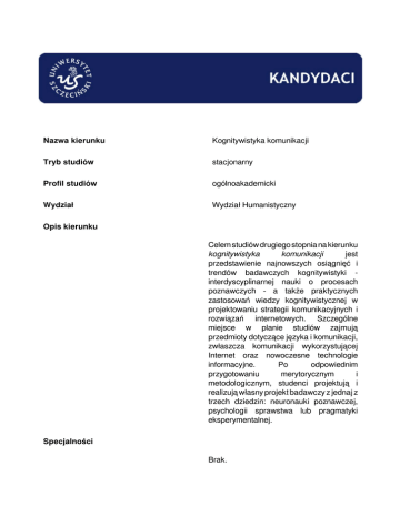 Nazwa kierunku Kognitywistyka komunikacji Tryb studiów stacjonarny Profil studiów ogólnoakademicki Wydział Wydział Humanistyczny Opis kierunku Celem studiów drugiego stopnia na kierunku kognitywistyka komunikacji jest przedstawienie najnowszych osiągnięć i trendów badawczych kognitywistyki interdyscyplinarnej nauki o procesach poznawczych - a także praktycznych zastosowań wiedzy kognitywistycznej w projektowaniu strategii komunikacyjnych i rozwiązań internetowych. Szczególne miejsce w planie studiów zajmują przedmioty dotyczące języka i komunikacji, zwłaszcza komunikacji wykorzystującej Internet oraz nowoczesne technologie informacyjne. Po odpowiednim przygotowaniu merytorycznym i metodologicznym, studenci projektują i realizują własny projekt badawczy z jednaj z trzech dziedzin: neuronauki poznawczej, psychologii sprawstwa lub pragmatyki eksperymentalnej. Specjalności Brak. Kryteria kwalifikacji Do postepowania kwalifikacyjnego mogą przystąpićosobylegitymującesiędyplomem ukończenia studiów co najmniej pierwszego stopnia. Kryterium kwalifikacji jest ocena na dyplomie. Przykładowe przedmioty Językoznawstwo kognitywne Wprowadzenie do neuronauki poznawczej Człowiek jako podmiot własnych działań Projektowanie rozwiązań internetowych Dostępność i użyteczność interfejsów Techniki komputerowej analizy danych Możliwości zatrudnienia W instytucjach badawczych, firmach świadczącychusługiinternetowe,agencjach reklamowych, mediach, instytucjach kulturalnych, w interdyscyplinarnych zespołach projektowych oraz wszelkich zawodach wymagających efektywnego zarządzania informacją oraz komunikacją. Kontynuacja nauki Studia doktoranckie w zakresie dyscyplin nauk społecznych i nauk humanistycznych. Terminy Terminy postępowania rekrutacjnego na studia stacjonarne i niestacjonarne rozpoczynające się od roku akademickiego 2016/2017. Dokumenty Powered by TCPDF (www.tcpdf.org)