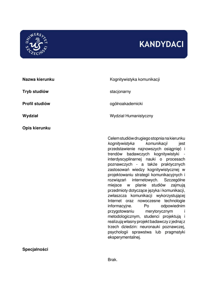 Nazwa kierunku Kognitywistyka komunikacji Tryb