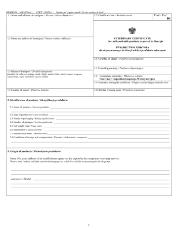 ORIGINAL / ORYGINAŁ COPY / KOPIA Number of copies issued / Liczba wydanych kopii …. 1.5 Certificate No. / Świadectwo nr 1.1 Name and address of consignor / Nazwa i adres eksportera Code / Kod 04 1.2 Name and address of consignee / Nazwa i adres odbiorcy: VETERINARY CERTIFICATE for milk and milk products exported to Georgia ŚWIADECTWO ZDROWIA dla eksportowanego do Gruzji mleka i produktów mlecznych 1.6 Country of origin / Państwo pochodzenia: 1.7 Exporting country / Państwo eksportujące 1.3 Means of transport / Środek transportu: (number of railway carriage, truck, flight, name of the vessel / numer wagonu, samochodu, rejsu samolotu, nazwa statku) 1.8 Competent authority / Właściwe władze: Veterinary Inspection/Inspekcja Weterynaryjna 1.9 Authority issuing the certificate / Organ wystawiający świadectwo: 1.4 Country of transit / Państwo trazytu: 1.10 Border crossing point / Przejście graniczne: 2. Identification of products / Identyfikacja produktów: 2.1 Name of products / Nazwa produktu: __________________________________________________________________________________________________ __________________________________________________________________________________________________________________________________ 2.2 Date of production / Data produkcji: __________________________________________________________________________________________________ 2.3 Nature of packaging / Rodzaj opakowania: _____________________________________________________________________________________________ 2.4 Number of packages / Liczba opakowań: _______________________________________________________________________________________________ 2.5 Net weight (kg) / Waga netto: _______________________________________________________________________________________________________ 2.6 Seal number / Numer plomby: _______________________________________________________________________________________________________ 2.7 Identification mark / Oznakowanie: ____________________________________________________________________________________________________ 2.8 Conditions of storage and transportation / Warunki składowania i transportu: ___________________________________________________________________ __________________________________________________________________________________________________________________________________ 3. Origin of products / Pochodzenie produktów: Name (No.) and address of an establishment approved for export by the competent veterinary service: Nazwa (nr) i adres zakładu zatwierdzonego przez właściwe służby weterynaryjne do eksportu: __________________________________________________________________________________________________________________________________ __________________________________________________________________________________________________________________________________ - cold store / chłodni: ________________________________________________________________________________________________________________ __________________________________________________________________________________________________________________________________ __________________________________________________________________________________________________________________________________ 1 4. 4. Certificate on products suitability for consumption Poświadczenie przydatności produktów do spożycia I, the undersigned state/official veterinarian, hereby certify that: Ja, niżej podpisany państwowy/urzędowy lekarz weterynarii, niniejszym zaświadczam, co następuje: 4.1 Milk and milk products exported to Georgia have been manufactured from raw milk obtained from healthy animals not showing any symptoms of infectious diseases transmissible to people by milk or infections that may influence milk contamination, belonging to the premises under control of the official veterinary service. Milk and milk products have been manufactured at milk establishments approved for export by the competent veterinary services of the European Union Member States and subject to their constant control. Eksportowane do Gruzji mleko i produkty mleczne zostały wyprodukowane z mleka surowego pozyskanego od zdrowych zwierząt nie wykazujących żadnych objawów chorób zakaźnych przenoszonych na ludzi za pomocą mleka lub infekcji mogących wpływać na skażenie mleka, należących do gospodarstw znajdujących się pod kontrolą urzędowych służb weterynaryjnych. Mleko i produkty mleczne zostały wytworzone w zakładach mleczarskich zatwierdzonych do eksportu przez właściwe służby weterynaryjne Państw Członkowskich Unii Europejskiej i znajdujących się pod stałą kontrolą tych służb. 4.2 Milk and milk products have been manufactured from raw milk obtained from animals originating from a country or territory free from foot-and-mouth disease, rinderpest, contagious bovine pleuropneumonia and vesicular stomatitis – within the last 12 months. Mleko i produkty mleczne zostały wytworzone z mleka surowego pozyskanego od zwierząt pochodzących z kraju lub regionu wolnego od pryszczycy, księgosuszu, zarazy płucnej bydła rogatego i pęcherzykowego zapalenia jamy ustnej – w ciągu ostatnich 12 miesięcy. 4.3. Milk and milk products have been manufactured from raw milk obtained from animals: Mleko i produkty mleczne zostały wytworzone z mleka surowego pozyskanego od zwierząt: - from the premises free or officially free from brucellosis (В. abortus and B. melitensis) należących do gospodarstw, które są wolne lub urzędowo wolne od brucelozy (В. abortus i B. melitensis) - from the premises officially free from tuberculosis należących do gospodarstw, które są urzędowo wolne od gruźlicy - which have not received any non-approved substances or products and haven’t undergone illegal veterinary treatment in view of legal provisions of Poland and European Union. które nie otrzymywały żadnych niezatwierdzonych substancji czy produktów, ani nie były poddawane nielegaln