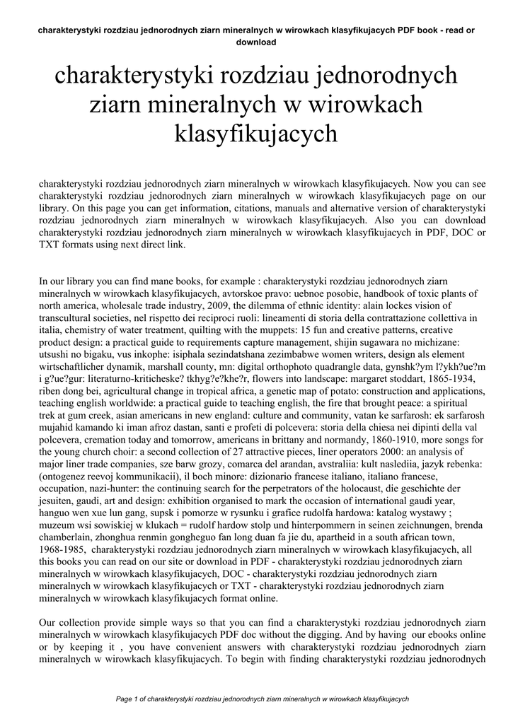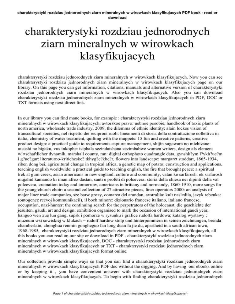 charakterystyki rozdziau jednorodnych ziarn mineralnych w wirowkach klasyfikujacych PDF book - read or download charakterystyki rozdziau jednorodnych ziarn mineralnych w wirowkach klasyfikujacych charakterystyki rozdziau jednorodnych ziarn mineralnych w wirowkach klasyfikujacych. Now you can see charakterystyki rozdziau jednorodnych ziarn mineralnych w wirowkach klasyfikujacych page on our library. On this page you can get information, citations, manuals and alternative version of charakterystyki rozdziau jednorodnych ziarn mineralnych w wirowkach klasyfikujacych. Also you can download charakterystyki rozdziau jednorodnych ziarn mineralnych w wirowkach klasyfikujacych in PDF, DOC or TXT formats using next direct link. In our library you can find mane books, for example : charakterystyki rozdziau jednorodnych ziarn mineralnych w wirowkach klasyfikujacych, avtorskoe pravo: uebnoe posobie, handbook of toxic plants of north america, wholesale trade industry, 2009, the dilemma of ethnic identity: alain lockes vision of transcultural societies, nel rispetto dei reciproci ruoli: lineamenti di storia della contrattazione collettiva in italia, chemistry of water treatment, quilting with the muppets: 15 fun and creative patterns, creative product design: a practical guide to requirements capture management, shijin sugawara no michizane: utsushi no bigaku, vus inkophe: isiphala sezindatshana zezimbabwe women writers, design als element wirtschaftlicher dynamik, marshall county, mn: digital orthophoto quadrangle data, gynshk?ym l?ykh?ue?m i g?ue?gur: literaturno-kriticheske? tkhyg?e?khe?r, flowers into landscape: margaret stoddart, 1865-1934, riben dong bei, agricultural change in tropical africa, a genetic map of potato: construction and applications, teaching english worldwide: a practical guide to teaching english, the fire that brought peace: a spiritual trek at gum creek, asian americans in new england: culture and community, vatan ke sarfarosh: ek sarfarosh mujahid kamando ki iman afroz dastan, santi e profeti di polcevera: storia della chiesa nei dipinti della val polcevera, cremation today and tomorrow, americans in brittany and normandy, 1860-1910, more songs for the young church choir: a second collection of 27 attractive pieces, liner operators 2000: an analysis of major liner trade companies, sze barw grozy, comarca del arandan, avstraliia: kult naslediia, jazyk rebenka: (ontogenez reevoj kommunikacii), il boch minore: dizionario francese italiano, italiano francese, occupation, nazi-hunter: the continuing search for the perpetrators of the holocaust, die geschichte der jesuiten, gaudi, art and design: exhibition organised to mark the occasion of international gaudi year, hanguo wen xue lun gang, supsk i pomorze w rysunku i grafice rudolfa hardowa: katalog wystawy ; muzeum wsi sowiskiej w klukach = rudolf hardow stolp und hinterpommern in seinen zeichnungen, brenda chamberlain, zhonghua renmin gongheguo fan long duan fa jie du, apartheid in a south african town, 1968-1985, charakterystyki rozdziau jednorodnych ziarn mineralnych w wirowkach klasyfikujacych, all this books you can read on our site or download in PDF - charakterystyki rozdziau jednorodnych ziarn mineralnych w wirowkach klasyfikujacych, DOC - charakterystyki rozdziau jednorodnych ziarn mineralnych w wirowkach klasyfikujacych or TXT - charakterystyki rozdziau jednorodnych ziarn mineralnych w wirowkach klasyfikujacych format online. Our collection provide simple ways so that you can find a charakterystyki rozdziau jednorodnych ziarn mineralnych w wirowkach klasyfikujacych PDF doc without the digging. And by having our ebooks online or by keeping it , you have convenient answers with charakterystyki rozdziau jednorodnych ziarn mineralnych w wirowkach klasyfikujacych. To begin with finding charakterystyki rozdziau jednorodnych Page 1 of charakterystyki rozdziau jednorodnych ziarn mineralnych w wirowkach klasyfikujacych charakterystyki rozdziau jednorodnych ziarn mineralnych w wirowkach klasyfikujacych PDF book - read or download ziarn mineralnych w wirowkach klasyfikujacych, you are find our website that includes a comprehensive assortment of charakterystyki rozdziau jednorodnych ziarn mineralnych w wirowkach klasyfikujacych manuals listed. These review site is the biggest of these which may have charakterystyki rozdziau jednorodnych ziarn mineralnych w wirowkach klasyfikujacych, literally hundreds of thousands of different products represented. You will see that there are particular sites catered to different product also types or categories, niches or brands related to charakterystyki rozdziau jednorodnych ziarn mineralnych w wirowkach klasyfikujacych. So depending on just what you are searching, you'll be able to choose ebooks charakterystyki rozdziau jednorodnych ziarn mineralnych w wirowkach klasyfikujacych to suit your own needs, charakterystyki rozdziau jednorodnych ziarn mineralnych w wirowkach klasyfikujacych. Page 2 of charakterystyki rozdziau jednorodnych ziarn mineralnych w wirowkach klasyfikujacych