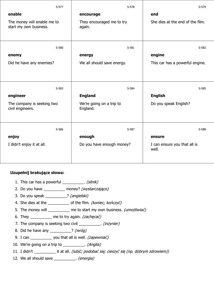 S-577 S-578 S-579 enable encourage end The money will enable me to start my own business. They encouraged me to try again. She dies at the end of the film. S-580 S-581 S-582 enemy energy engine Did he have any enemies? We all should save energy. This car has a powerful engine. S-583 S-584 S-585 engineer England English The company is seeking two civil engineers. We’re going on a trip to England. Do you speak English? S-586 S-587 S-588 enjoy enough ensure I didn’t enjoy it at all. Do you have enough money? I can ensure you that all is well. Uzupełnij brakujące słowa: 1. This car has a powerful __________. (silnik) 2. Do you have __________ money? (wystarczająco) 3. Do you speak __________? (angielski) 4. She dies at the __________ of the film. (koniec; kończyć) 5. The money will __________ me to start my own business. (umożliwiać) 6. They __________ me to try again. (zachęcać) 7. The company is seeking two civil __________. (inżynier) 8. Did he have any __________? (wróg) 9. I can __________ you that all is well. (zapewniać) 10. We’re going on a trip to __________. (Anglia) 11. I didn’t __________ it at all. (lubić; podobać się; cieszyć się (np. dobrym zdrowiem)) 12. We all should save __________. (energia) S-579 S-578 S-577 koniec; kończyć zachęcać umożliwiać Ona umiera na końcu filmu. Zachęcili mnie, bym znowu spróbował. Pieniądze umożliwią mi założenie własnej firmy. www.isel.edu.pl www.isel.edu.pl www.isel.edu.pl S-582 S-581 S-580 silnik energia wróg Ten samochód ma mocny silnik. Wszyscy powinniśmy oszczędzać energię. Czy on miał jakichś wrogów? www.isel.edu.pl www.isel.edu.pl www.isel.edu.pl S-585 S-584 S-583 angielski Anglia inżynier Mówisz po angielsku? Jedziemy na wycieczkę do Anglii. Firma poszukuje dwóch inżynierów budownictwa. www.isel.edu.pl www.isel.edu.pl www.isel.edu.pl S-588 S-587 S-586 zapewniać wystarczająco Mogę cię zapewnić, że wszystko jest dobrze. Masz wystarczająco pieniędzy? W ogóle mi się to nie podobało. www.isel.edu.pl Odpowiedzi: 1. engine 2. enough 3. English 4. end 5. enable 6. encouraged 7. engineers 8. enemies 9. ensure 10. England 11. enjoy 12. energy lubić; podobać się; cieszyć się (np. dobrym zdrowiem) www.isel.edu.pl www.isel.edu.pl