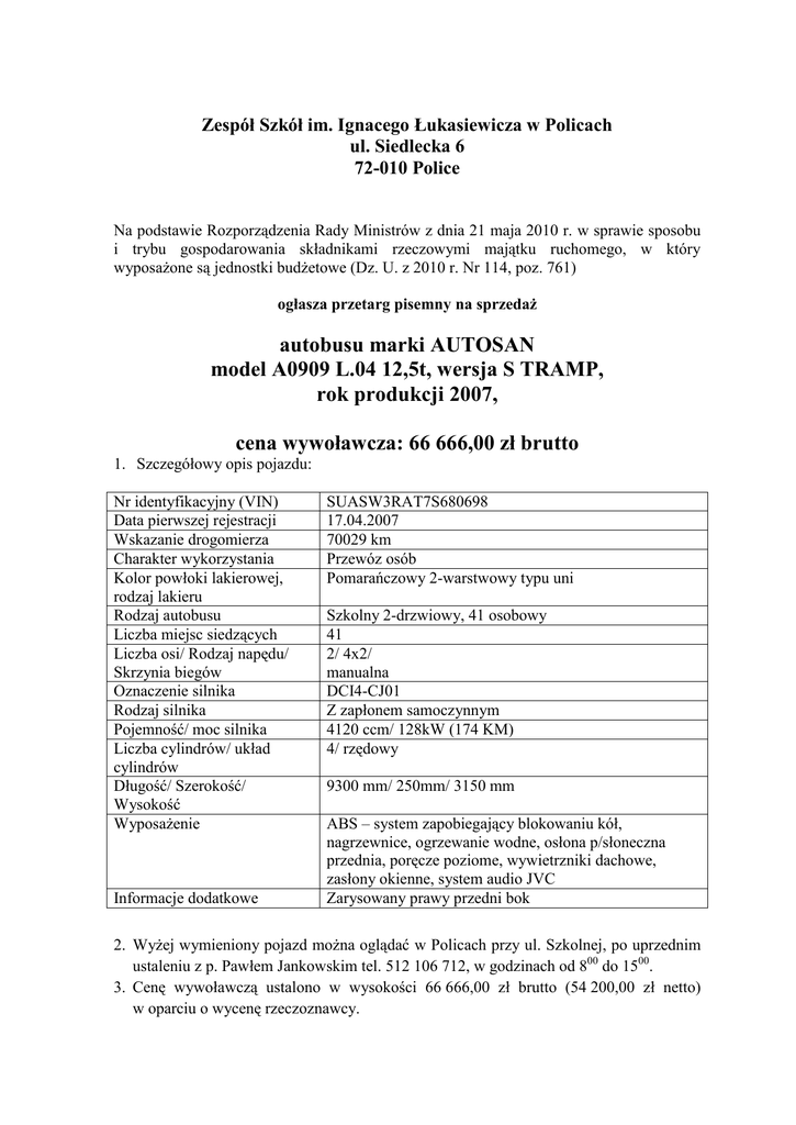 Zespół Szkół im. Ignacego Łukasiewicza w Policach ul. Siedlecka 6 72-010 Police Na podstawie Rozporządzenia Rady Ministrów z dnia 21 maja 2010 r. w sprawie sposobu i trybu gospodarowania składnikami rzeczowymi majątku ruchomego, w który wyposażone są jednostki budżetowe (Dz. U. z 2010 r. Nr 114, poz. 761) ogłasza przetarg pisemny na sprzedaż autobusu marki AUTOSAN model A0909 L.04 12,5t, wersja S TRAMP, rok produkcji 2007, cena wywoławcza: 66 666,00 zł brutto 1. Szczegółowy opis pojazdu: Nr identyfikacyjny (VIN) Data pierwszej rejestracji Wskazanie drogomierza Charakter wykorzystania Kolor powłoki lakierowej, rodzaj lakieru Rodzaj autobusu Liczba miejsc siedzących Liczba osi/ Rodzaj napędu/ Skrzynia biegów Oznaczenie silnika Rodzaj silnika Pojemność/ moc silnika Liczba cylindrów/ układ cylindrów Długość/ Szerokość/ Wysokość Wyposażenie Informacje dodatkowe SUASW3RAT7S680698 17.04.2007 70029 km Przewóz osób Pomarańczowy 2-warstwowy typu uni Szkolny 2-drzwiowy, 41 osobowy 41 2/ 4x2/ manualna DCI4-CJ01 Z zapłonem samoczynnym 4120 ccm/ 128kW (174 KM) 4/ rzędowy 9300 mm/ 250mm/ 3150 mm ABS – system zapobiegający blokowaniu kół, nagrzewnice, ogrzewanie wodne, osłona p/słoneczna przednia, poręcze poziome, wywietrzniki dachowe, zasłony okienne, system audio JVC Zarysowany prawy przedni bok 2. Wyżej wymieniony pojazd można oglądać w Policach przy ul. Szkolnej, po uprzednim ustaleniu z p. Pawłem Jankowskim tel. 512 106 712, w godzinach od 800 do 1500. 3. Cenę wywoławczą ustalono w wysokości 66 666,00 zł brutto (54 200,00 zł netto) w oparciu o wycenę rzeczoznawcy. 4. Wadium w kwocie 4 000,00 zł należy wpłacać w terminie do dnia 27 października 2016 r. do godz. 1000 przelewem na rachunek bankowy Zespołu Szkół im. Ignacego Łukasiewicza w Policach nr 46124039431111000041319387 w Banku PEKAO SA Oddział Police. 5. Wadium wnosi się wyłącznie w pieniądzu. 6. Wygrywającemu przetarg, wadium zalicza się na poczet ceny nabycia, pozostałym uczestnikom, jest ono zwracane w terminie 7 dni od dnia dokonania wyboru lub odrzucenia oferty. 7. W przypadku odstąpienia od zawarcia umowy przez osobę, której oferta została wybrana jako najkorzystniejsza, wpłacone wadium nie będzie podlegało zwrotowi. 8. Oferta musi być złożona w formie pisemnej. 9. Oferta powinna zawierać: a. imię, nazwisko i adres oferenta lub nazwę albo firmę oraz siedzibę, jeżeli oferentem jest osoba prawna lub nie posiadająca osobowości prawnej spółka handlowa, b. datę sporządzenia oferty, c. oświadczenie, że oferent zapoznał się z warunkami przetargu i przyjmuje te warunki bez zastrzeżeń, d. oświadczenie, iż oferent zapoznał się ze stanem przedmiotu przetargu i nie wnosi zastrzeżeń, e. oferowaną cenę brutto i warunki jej zapłaty. 10. Komisja przetargowa odrzuca ofertę, jeżeli: 1) została złożona po wyznaczonym terminie, w niewłaściwym miejscu lub przez oferenta, który nie wniósł wadium; 2) nie zawiera danych, o których mowa w pkt 9 lub są one niekompletne, nieczytelne lub budzą inną wątpliwość, zaś złożenie wyjaśnień mogłoby prowadzić do uznania jej za nową ofertę. O odrzuceniu oferty komisja przetargowa zawiadamia niezwłocznie oferenta. 11. Termin i miejsce złożenia oferty: 1) Oferty należy składać w sekretariacie Zespołu Szkół im. Ignacego Łukasiewicza w Policach w terminie do dnia 27 października 2016 r., do godz. 1000 w zamkniętej kopercie. 2) Koperta musi zawierać opis: „Przetarg pisemny – autobus AUTOSAN”. 3) Otwarcie ofert odbędzie się dnia 27 października 2016 r. o godz. 1030 w siedzibie Zespołu Szkół im. Ignacego Łukasiewicza w Policach, przy ul. Siedleckiej 6 w Policach. 4) Oferenci mogą być obecni podczas otwarcia ofert. 5) Termin związania ofertą wynosi 21 dni licząc od dnia otwarcia ofert. 6) Wyniki przetargu zostaną opublikowane na stronach internetowych Zespołu Szkół im. Ignacego Łukasiewicza w Policach. 7) Protokół z postępowania będzie jawny. 12. Wszelkich informacji związanych z przetargiem udziela pan Paweł Jankowski tel. 512 106 712, mail: [email protected] 13. Organizatorowi przetargu przysługuje prawo zamknięcia przetargu bez wybrania którejkolwiek z ofert, bez podania przyczyn Police, dnia 13 października 2016 r. Na oryginale podpis Dyrektora Zespołu Szkół im. Ignacego Łukasiewicza w Policach Agaty Jarymowicz