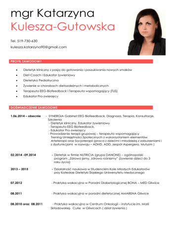 mgr Katarzyna Kulesza-Gutowska Tel. 519-730-630 [email protected] PROFIL ZAWODOWY Dietetyk kliniczny z pasją do gotowania i poszukiwania nowych smaków Diet-Coach i Edukator żywieniowy Dietetyka Pediatryczna Żywienie w chorobach dietozależnych i metabolicznych Terapeuta EEG-Biofeedback i Terapeuta wspomagający (TUS) Edukator Pro-zwierzęcy DOŚWIADCZENIE ZAWODOWE 1.06.2014 – obecnie - SYNERGIA Gabinet EEG Biofeedback. Diagnoza, Terapia, Konsultacje, Szkolenia - Dietetyk kliniczny, Edukator żywieniowy - Terapeuta EEG Biofeedback, - Edukator Pro-zwierzęcy - Prowadzenie terapii grupowej – terapeuta wspomagający Trening Umiejętności Społecznych z wykorzystaniem elementów Arteterapii oraz Socjoterapii (praca z dziećmi i młodzieżą z zaburzeniami i z dysfunkcjami w rozwoju – ADHD, ADD, zespół Aspergera, Mutyzm ) 02.2014 -09.2014 - Dietetyk w firmie NUTRICIA (grupa DANONE) – ogólnopolski program „Zdrowo jemy, zdrowo rośniemy” (żywienie dzieci do 3 roku życia) 2013 – 2015 - Działalność naukowa w Studenckim Kole Młodych Edukatorów przy Katedrze Dietetyki Śląskiego Uniwersytetu Medycznego 07.2012 - Praktyka wakacyjna w Poradni Diabetologicznej BONA – MED Gliwice 08.2011 - Praktyka wakacyjna w poradni dietetycznej AMARENA Gliwice 08.2010 oraz 08.2011 - Praktyka wakacyjna w Centrum Onkologii – instytucie im. Marii Skłodowskiej- Curie w Gliwicach ( dział żywienia ) WYKSZTAŁCENIE: 2013 – 2015 2012 – 2013 2012 – 2013 2009 – 2013 - Śląski Uniwersytet Medyczny w Katowicach, kierunek Dietetyka, studia magisterskie - Roczny kurs Psychologii Żywienia – Szkoła Policealna ‘Copernicus’ - Roczny kurs Psychologii Ogólnej – Szkoła Policealna ‘Copernicus’ - Śląski Uniwersytet Medyczny w Katowicach, kierunek Dietetyka kliniczna, studia licencjackie DODATKOWE KWALIFIKACJE: 12.2015 Certyfikowany terapeuta Biofeedback (BioMed. Neurotechnologie w diagnostyce i terapii) 09.2015 Ukończony kurs socjoterapii z wyszczególnieniem całościowych zaburzeń zachowania u dzieci i młodzieży, autyzmu i ADHD 11.2014 Kurs Dietetyki Sportowej, organizowany przez Poradnię Zdrowego Odżywiania Dietetycznie Poprawni 11.2014 Kurs Coachingu Dietetycznego, organizowany przez Poradnię Zdrowego Odżywiania Dietetycznie Poprawni 06.2013 Opiekun kolonijny Od 2012 Kurs Kwalifikowanej Pierwszej Pomocy wraz z recertyfikacjami Od 2007 Ratownik Wodnego Ochotniczego Pogotowia Ratunkowego – czynny ZAINTERESOWANIA Ratownictwo wodne; Wszelakie wariacje na temat gotowania; Fizjologia człowieka; Psychologia; Fotografia; Taniec nowoczesny, zajęcia fitness. Wyrażam zgodę na przetwarzanie moich danych osobowych dla potrzeb niezbędnych do realizacji procesu rekrutacyjnego, w celu pośrednictwa pracy (posiadania i przetwarzania przekazanych danych osobowych oraz ich udostępniania klientom w ramach prowadzonych projektów rekrutacyjnych) zgodnie z Ustawą z dnia 29.08.1997 roku o Ochronie Danych Osobowych; tekst jednolity: Dz. U. z 2002r. Nr 101, poz. 926 ze zm.