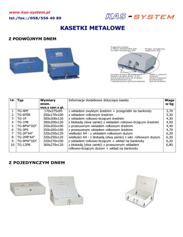 www.kas-system.pl tel./fax.:/058/556 40 89 KASETKI METALOWE Z PODWÓJNYM DNEM Lp. Typ Wymiary zewn. Informacje dodatkowe dotyczące kasety wys.x szer.x gł. 1 2 3 4 5 6 7 8 9 10 TG-4PP TG-6PŚR TG-1P TG-1PB TG-8PW"IID" TG-3PS TG-2P"A4" TG-2PB"A4" TG-9PW"IID" TG-12PB 170x275x95 250x170x100 300x200x120 300x200x120 250x265x100 250x265x100 320x250x120 320x250x120 320x270x100 360x270x120 Z POJEDYNCZYM DNEM z wkładem zwykłym średnim + przegródki na banknoty z wkładem rolkowym średnim z wkładem rolkowo-liczącym średnim z blokadą (dwa zamki) z wkładem rolkowo-liczącym średnim z przesuwnym wkładem rolkowym średnim z przesuwnym wkładem rolkowym średnim wielkości A4 - z wkładem rolkowym dużym wielkości A4 - z blokadą (dwa zamki) z wkł. rolkowym dużym z wkładem rolkowo-liczącym + wkład na banknoty z blokadą (dwa zamki) z przesuwnym wkładem rolkowo-liczącym dużym + wkład na banknoty Waga w kg 3,70 3,30 4,30 4,50 4,40 4,70 6,20 6,30 6,20 6,80 Lp. Typ Wymiary zewn. Informacje dodatkowe dotyczące kasety Waga w kg wys.x szer.x gł. 1 2 3 4 5 TG-10WL TG-11WL TG-14BL TG-5PN TG-8PW"ID" TG-9PW"ID" 250x180x60 250x180x70 360x210x65 300x200x100 250x265x100 360x270x100 Kaseta z przesuwnym wkładem rolkowym średnim Kaseta z wkładem rolkowym średnim Kaseta z przesuwnym wkładem rolkowym-liczącym dużym Kaseta z wkładem zwykłym dużym Kaseta z przesuwnym wkładem rolkowym średnim Kaseta z przesuwnym wkładem rolkowym-liczącym dużym + wkład na banknoty KASETY BANKOWE Konstrukcje kaset bankowych zbliżone są do kaset metalowych z pojedynczym dnem. Oferujemy kasety: Z pięcioma zamykanymi na zamki przegrodami (na stemple) Z przesuwanym wkładem rolkowo-liczącym, oraz wkładem na banknoty O stosunkowo dużych gabarytach Kaseta bankowa Spawana wzmocniona konstrukcja stalowa, Korpus z blachy grubości 2 mm, Pokrywa grubości 3 mm, Zawiasy wewnętrzne - kryte, Zamek kluczowy z dwoma kluczami dwuzabierakowymi IMP kl. A, Możliwość mocowania do podłoża, Pojedyncze dno - wyklejone materiałem dekoracyjnym, Lp. Typ Wymiary zewnętrzne wys. x szer. x gł. 1. TG-13PBS 320x250x120 2. TG-25PBK-"T" 360x270x130 3. TG-26PBU-"T" 420x300x160 4. TG-3ZB-"W" 320x250x150 Informacje dodatkowe Kaseta na stemple - 5 przegródek z zamkami patentowymi Kaseta z blokadą, z przesuwnym wkładem rolkowo-liczącym dużym + wkład na banknoty Kaseta uniwersalna z blokadą Kaseta uniwersalna o podwyższonej wytrzymałości (zamek atest IMP kl. A) Waga w kg 7,50 6,00 6,40 7,00 1,90 2,20 2,50 2,60 3,00 4,40