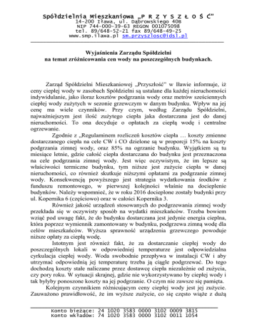 Spółdzielnia Mieszkaniowa „P R Z Y S Z Ł O Ś Ć” 14-200 Iława, ul. Dąbrowskiego 40B NIP 744-000-39-63 REGON 001075098 tel. 89/648-52-21 fax 89/648-49-25 www.smp.ilawa.pl [email protected] ______________________________________________________________ Wyjaśnienia Zarządu Spółdzielni na temat zróżnicowania cen wody na poszczególnych budynkach. Zarząd Spółdzielni Mieszkaniowej „Przyszłość” w Iławie informuje, iż ceny ciepłej wody w zasobach Spółdzielni są ustalane dla każdej nieruchomości indywidulanie, jako iloraz kosztów podgrzania wody oraz metrów sześciennych ciepłej wody zużytych w sezonie grzewczym w danym budynku. Wpływ na jej cenę ma wiele czynników. Przy czym, według Zarządu Spółdzielni, najważniejszym jest ilość zużytego ciepła jaka dostarczana jest do danej nieruchomości. To ona decyduje o opłatach za ciepłą wodę i centralne ogrzewanie. Zgodnie z „Regulaminem rozliczeń kosztów ciepła … koszty zmienne dostarczanego ciepła na cele CW i CO dzielone są w proporcji 15% na koszty podgrzania zimnej wody, oraz 85% na ogrzanie budynku. Wyjątkiem są tu miesiące letnie, gdzie całość ciepła dostarczana do budynku jest przeznaczona na cele podgrzania zimnej wody. Jest więc oczywistym, że im lepsze są właściwości termiczne budynku, tym niższe jest zużycie ciepła w danej nieruchomości, co również skutkuje niższymi opłatami za podgrzanie zimnej wody. Konsekwencją powyższego jest strategia wydatkowania środków z funduszu remontowego, w pierwszej kolejności właśnie na docieplenie budynków. Należy wspomnieć, że w roku 2016 docieplone zostały budynki przy ul. Kopernika 6 (częściowo) oraz w całości Kopernika 3. Również jakość urządzeń stosowanych do podgrzewania zimnej wody przekłada się w oczywisty sposób na wydatki mieszkańców. Trzeba bowiem wziąć pod uwagę fakt, że do budynku dostarczana jest jedynie energia cieplna, która poprzez wymiennik zamontowany w budynku, podgrzewa zimną wodę dla celów mieszkańców. Wyższa sprawność urządzenia grzewczego powoduje niższe opłaty za ciepłą wodę. Istotnym jest również fakt, że za dostarczanie ciepłej wody do poszczególnych lokali w odpowiedniej temperaturze jest odpowiedzialna cyrkulacja ciepłej wody. Woda swobodnie przepływa w instalacji CW i aby utrzymać odpowiednią jej temperaturę trzeba ją ciągle podgrzewać. Do tego dochodzą koszty stałe naliczane przez dostawcę ciepła niezależnie od zużycia, czy pory roku. W sytuacji skrajnej, gdzie nie wykorzystywano by ciepłej wody i tak byłyby ponoszone koszty na jej podgrzanie. O czym nie zawsze się pamięta. Kolejnym czynnikiem różnicującym ceny ciepłej wody jest jej zużycie. Zauważono prawidłowość, że im wyższe zużycie, co się często wiąże z dużą ____________________________________________________________ Konto bieżące: 24 1020 3583 0000 3102 0009 3815 Konto wkładów: 74 1020 3583 0000 3102 0011 1054 Spółdzielnia Mieszkaniowa „P R Z Y S Z Ł O Ś Ć” 14-200 Iława, ul. Dąbrowskiego 40B NIP 744-000-39-63 REGON 001075098 tel. 89/648-52-21 fax 89/648-49-25 www.smp.ilawa.pl [email protected] ______________________________________________________________ ilością mieszkańców budynku (jak np. Ostródzka 48F), tym niższe koszty podgrzewania wody i automatycznie niższa cena ciepłej wody. Pamiętać też należy, iż ceny podgrzania zimnej wody są zależne od stosowanych grup taryfowych za ciepło dostarczone przez Energetykę Cieplną sp. z o.o. Nie jest bowiem tak, że do wszystkich nieruchomości dostarczana jest energia cieplna w tej samej cenie. W wydanej przez Prezesa URE decyzji wyszczególniono osiem grup taryfowych uzależnionych m.in. od miejsca wytwarzania ciepła, własności sieci ciepłowniczych, czy wreszcie własności wymiennikowni. W tym miejscu trzeba wskazać, że wymiennikownia budynku przy ul. Ostródzkiej 48F jest własnością Spółdzielni, natomiast w budynku przy ul. Kopernika 6 należy do EC Sp. z o. o. Decyduje to o ponoszonych kosztach na ich naprawę, remonty, czy bieżące utrzymanie, które ponosi jej właściciel. Ma też to inny wymiar finansowy, gdyż taryfę z niższą ceną ciepła stosuje się dla pierwszej z wymienionych nieruchomości, a wyższą dla drugiej. To z oczywistych względów przekłada się na cenę dostarczanego ciepła. Nie są to oczywiście wszystkie czynniki wpływające na cenę podgrzania zimnej wody i w efekcie skutkujące różnymi cenami. Odpowiedź nie wyczerpuje również wszystkich kwestii związanych z podgrzaniem zimnej wody w innych zasobach należących do Spółdzielni Mieszkaniowej „PRZYSZŁOŚĆ” w Iławie. Jednakże, z punktu widzenia zadanego pytania, zaprezentowano najważniejsze aspekty wpływające na różnicowanie cen ciepłej wody na poszczególnych nieruchomościach. Z poważaniem ____________________________________________________________ Konto bieżące: 24 1020 3583 0000 3102 0009 3815 Konto wkładów: 74 1020 3583 0000 3102 0011 1054