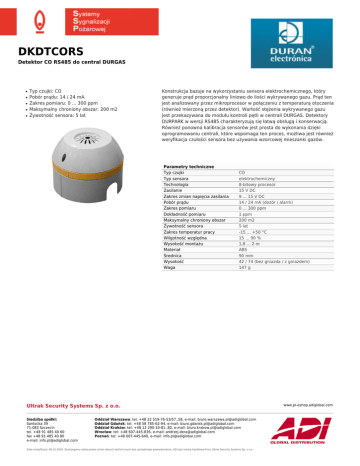 DKDTCORS Detektor CO RS485 do central DURGAS ● ● ● ● ● Typ czujki: CO Pobór prądu: 14 / 24 mA Zakres pomiaru: 0 ... 300 ppm Maksymalny chroniony obszar: 200 m2 Żywotność sensora: 5 lat Konstrukcja bazuje na wykorzystaniu sensora elektrochemicznego, który generuje prąd proporcjonalny liniowo do ilości wykrywanego gazu. Prąd ten jest analizowany przez mikroprocesor w połączeniu z temperaturą otoczenia (również mierzoną przez detektor). Wartość stężenia wykrywanego gazu jest przekazywana do modułu kontroli pętli w centrali DURGAS. Detektory DURPARK w wersji RS485 charakteryzują się łatwą obsługą i konserwacją. Również ponowna kalibracja sensorów jest prosta do wykonania dzięki oprogramowaniu centrali, które wspomaga ten proces, możliwa jest również weryfikacja czułości sensora bez używania wzorcowej mieszanki gazów. Parametry techniczne Typ czujki Typ sensora Technologia Zasilanie Zakres zmian napięcia zasilania Pobór prądu Zakres pomiaru Dokładność pomiaru Maksymalny chroniony obszar Żywotność sensora Zakres temperatur pracy Wilgotność względna Wysokość montażu Materiał Średnica Wysokość Waga CO elektrochemiczny 8-bitowy procesor 15 V DC 9 ... 15 V DC 14 / 24 mA (dozór / alarm) 0 ... 300 ppm 1 ppm 200 m2 5 lat -15 ... +50 °C 15 ... 90 % 1,8 ... 2 m ABS 90 mm 42 / 74 (bez gniazda / z gniazdem) 147 g Ultrak Security Systems Sp. z o.o. Siedziba spółki: Santocka 39 71-083 Szczecin tel. +48 91 485 40 60 fax +48 91 485 40 80 e-mail: [email protected] Oddział Warszawa: tel. +48 22 519-76-53/57..58, e-mail: [email protected] Oddział Gdańsk: tel. +48 58 785-62-94, e-mail: [email protected] Oddział Kraków: tel: +48 12 290-10-81..82, e-mail: [email protected] Wrocław: tel: +48 607-445-836, e-mail: [email protected] Poznań: tel: +48 607-445-640, e-mail: [email protected] Data modyfikacji: 09.12.2016. Zastrzegamy sobie prawo zmian danych technicznych bez uprzedniego powiadomienia. ADI jest marką handlową firmy Ultrak Security Systems Sp. z o.o. www.pl-eshop.adiglobal.com
