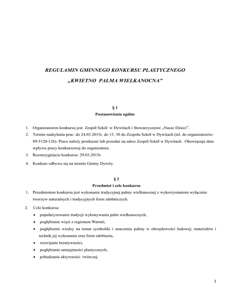 REGULAMIN GMINNEGO KONKURSU PLASTYCZNEGO „KWIETNO PALMA WIELKANOCNA” §1 Postanowienia ogólne 1. Organizatorem konkursu jest Zespół Szkół w Dywitach i Stowarzyszenie „Nasze Dzieci”. 2. Termin nadsyłania prac: do 24.03.2015r. do 15. 30 do Zespołu Szkół w Dywitach (tel. do organizatorów: 89-5120-126). Prace należy przekazać lub przesłać na adres Zespół Szkół w Dywitach . Obowiązuje data wpływu pracy konkursowej do organizatora. 3. Rozstrzygnięcie konkursu: 29.03.2015r. 4. Konkurs odbywa się na terenie Gminy Dywity. §2 Przedmiot i cele konkursu 1. Przedmiotem konkursu jest wykonanie tradycyjnej palmy wielkanocnej z wykorzystaniem wyłącznie tworzyw naturalnych i tradycyjnych form zdobniczych. 2. Cele konkursu: popularyzowanie tradycji wykonywania palm wielkanocnych, pogłębianie więzi z regionem Warmii, pogłębienie wiedzy na temat symboliki i znaczenia palmy w obrzędowości ludowej; materiałów i technik jej wykonania oraz form zdobienia, rozwijanie kreatywności, pogłębianie umiejętności plastycznych, pobudzanie aktywności twórczej. 1 §3 Uczestnicy 1. Konkurs adresowany jest do dzieci i młodzieży szkolnej mieszkającej i/lub uczącej się na terenie gminy Dywity. §4 Warunki udziału 1 Akceptacja Regulaminu Konkursu. 2 Wykonanie tradycyjnej palmy wielkanocnej zgodnej z Regulaminem. 3 Przytwierdzenie kartki zawierającej następujące informacje: -Nazwa szkoły, adres szkoły, imię i nazwisko autora lub klasa (praca indywidualna) i imię i nazwisko opiekuna. 4 Ogłoszenie wyników 29.03.2015 r. §5 Ocena prac oraz zasady przyznawania nagród 1. Zgłoszone prace zostaną zarejestrowane i poddane selekcji przez Komisję Konkursową powołaną przez Dyrektora Zespołu Szkół w Dywitach- 20.03. Do konkursu nie zostaną dopuszczone prace zawierające elementy niezgodne z regulaminem (wszelkie elementy z tworzyw sztucznych). Pozostałe prace zostaną oznaczone numerami i wyeksponowane w kościele p.w. Świętych Apostołów Szymona i Judy Tadeusza w Dywitach w dniu 29.03.2015r. . 2. Prace ocenione zostaną w 3 kategoriach wiekowych: dzieci z oddziałów 0-III SP, IV- VI SP i uczniowie klas I- III gimnazjum. 3. W każdej z kategorii zostaną przyznane trzy miejsca (od I do III). 4. Ponadto, w dniu 29 marca 2015r. Komisja Konkursowa wybierze jedną tradycyjną palmę wielkanocną, która otrzyma Nagrodę Specjalną (Nagroda Sołtysa Gminy Dywity). 5. Przy wyborze tradycyjnej palmy wielkanocnej Komisja zastosuje następujące kryteria oceny: dobór odpowiednich materiałów i elementów zdobniczych związanych z regionem estetyka wykonania walory artystyczne pracy 6. Laureaci konkursu otrzymają dyplomy pamiątkowe oraz nagrody rzeczowe w dniu rozstrzygnięcia konkursu (29. 03. 2015). 7. Decyzje Komisji są ostateczne i nieodwołalne. 2 §7 Ogłoszenie wyników 1. Rozstrzygnięcie konkursu, ogłoszenie wyników i rozdanie nagród nastąpi w dniu 29.03.2015r. po Mszy św. w kościele świętych Apostołów Szymona i Judy Tadeusza w Dywitach ok. godz. 12:30 . Laureaci konkursu nieobecni w dniu 29.03.2015r. o jego wynikach zostaną poinformowani pocztą elektroniczną bądź telefonicznie. 2. Laureaci są zobowiązani do odbioru nagrody osobiście lub przez opiekuna oraz dokonania potwierdzenia odbioru nagrody. 3. Komisja Konkursowa sporządzi protokół konkursu, a jego wyniki zostaną podane do wiadomości na stronie www.spdywity.edu.pl w terminie do 7 dni od rozstrzygnięcia konkursu. §8 Postanowienia końcowe 1. Zgłoszenie prac do konkursu jest równoznaczne z przekazaniem praw autorskich do nich na rzecz Organizatora, o których mowa w art. 50 ustawy z dnia 4 lutego 1994r. o prawach autorskich i prawach pokrewnych (Dz. U. z 1994r., Nr 24, poz. 83) oraz do publikacji w wydawnictwach wszelkiego typu, wydawanych przez Organizatora oraz w internecie. 2. Prace przechodzą na rzecz Zespołu Szkół w Dywitach i Stowarzyszenia „Nasze Dzieci” i mogą zostać wykorzystane na cele charytatywne (licytacja, aukcja, sprzedaż). 3. Uczestnik konkursu oświadcza, że wyraża zgodę na wykorzystanie swoich danych osobowych przez Organizatora w celu wyłonienia zwycięzcy i przyznania nagrody; umieszczenia danych w materiałach publikowanych przez Organizatora i na stronie internetowej Organizatora; promocji konkursu lub idei konkursu. 4. Uczestnik konkursu ma prawo wglądu do swoich danych osobowych oraz ich weryfikacji. 5. Wystawa palem będzie w kościele parafialnym w Dywitach. 6. Organizatorzy zastrzegają sobie możliwość zmian w regulaminie. Od decyzji organizatora nie przysługuje odwołanie 7. Osoby odpowiedzialne ze strony Organizatora: Joanna Żach, Agnieszka Bednarczyk, Mariola Grzegorczyk. Dodatkowe pytania proszę kierować na adres mailowy: [email protected] 8. Organizator nie ponosi odpowiedzialności za uszkodzenia prac powstałe podczas transportu. . 3 Bibliografia 1. Hanna Szymanderska, Polskie tradycje świąteczne, Świat Książki, Warszawa 2003 2. Studia Warmińskie XLIII (2000), Jan Chłosta, Wielki Post i Wielkanoc w zwyczajach Warmiaków. Organizatorzy konkursu. 4 ZAŁĄCZNIK nr 1 KARTA ZGŁOSZENIA UCZESTNIKÓW BIORĄCYCH UDZIAŁ W KONKURSIE PLASTYCZNYM NA „KWIETNĄ PALMA WIELKANOCNA” L.P. Imię i nazwisko ucznia wiek klasa Imię i nazwisko opiekuna, pod kierunkiem którego wykonano pracę; adres mail, tel. Nazwa szkoły ……………………………………………………………….. Adres do korespondencji ……………………………………………………. Prosimy wypełnić drukowanymi literami. 5 ZAŁĄCZNIK NR 2 METRYCZKA PRACY ...................................... IMIĘ I NAZWISKO AUTORA PRACY ...................................... IMIĘ I NAZWISKO AUTORA PRACY .................................... WIEK /KLASA ................................... WIEK /KLASA ................................... .................................... .................................... DOKŁADNY ADRES SZKOŁY (do korespond