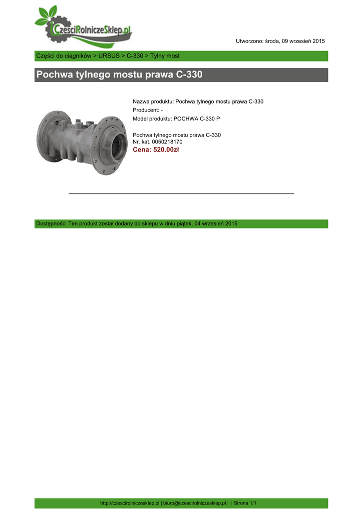 Utworzono: środa, 09 wrzesień 2015 Części do ciągników > URSUS > C-330 > Tylny most Pochwa tylnego mostu prawa C-330 Nazwa produktu: Pochwa tylnego mostu prawa C-330 Producent: Model produktu: POCHWA C-330 P Pochwa tylnego mostu prawa C-330 Nr. kat. 0050218170 Cena: 520.00zł Dostępność: Ten produkt został dodany do sklepu w dniu piątek, 04 wrzesień 2015 http://czescirolniczesklep.pl | [email protected] | | Strona 1/1