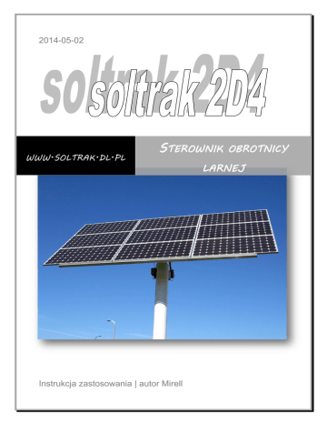 2014-05-02 WWW.SOLTRAK.DL.PL STEROWNIK Instrukcja zastosowania | autor Mirell OBROTNICY LARNEJ Sterownik SolTrak 2D4 www.soltrak.dl.pl Spis treści CHARAKTERYSTYKA STEROWNIKA SOLTRAK 2D4 ......................................... 3 O RÓŻNYCH RODZAJACH UKŁADÓW ŚLEDZĄCYCH ........................................ 4 UKŁAD RÓŻNICOWY – ZASADA DZIAŁANIA ....................................................... 5 CZUJKA RÓŻNICOWA – UKŁAD PRAKTYCZNY .................................................. 6 OPROGRAMOWANIE STEROWNIKA .................................................................... 8 PARAMETRY STEROWNIKA ............................................................................... 10 WYGLĄD STEROWNIKA ....................................................................................... 11 SCHEMAT MONTAŻOWY ....................................................................................... 12 SCHEMAT IDEOWY ............................................................................................... 14 WSPÓŁPRACA Z RADIOLINIĄ ............................................................................. 15 KONFIGURACJE PRACY – PRZECZYTAJ UWAŻNIE! ....................................... 16 - 2 - Sterownik SolTrak 2D4 www.soltrak.dl.pl Charakterystyka sterownika Soltrak 2D4 Soltrak 2D jest uniwersalnym sterownikiem do obrotnic solarnych. Umożliwia on pracę z różnymi typami siłowników pod warunkiem wyposażenia tych urządzeń w wyłączniki krańcowe. Zmiana kierunku obrotu realizowana jest przez zmianę polaryzacji napięcia zasilania urządzenia wykonawczego. Elementem przełączającym są przekaźniki elektromagnetyczne pracujące w mostku H. Sterownik zapewnia kontrolę położenia śledzącego obiektu zarówno w poziomie (azymut) jak i w pionie (elewacja). Po zapadnieciu zmierzchu sterownik generuje sygnał powrotu na pozycję East (w azymucie) oraz – w elewacji - sygnał położenia się solara równolegle do powierzchni ziemi (ogniwami do góry), co zabezpiecza przed silnymi podmuchami wiatru. Pozycja końcowa zależy od parametrów siłowników (działania wyłączników krańcowych) i budowy trackera. Strerownik może współpracować z siłownikami o maksymalnym prądzie 4A, przy potrzebie pracy z większym pradem należy zastosować dodatkowe styczniki (lub przekaźniki samochodowe). Normalna praca trakera bez osiągania stanów końcowych East i West. Wyłączniki krańcowe zwarte, umożliwiają sterowanie silnika w obie strony przez zmianę polaryzacji napięcia (diody nie działają zbocznikowane wyłącznikami). Przyjmujemy założenie, iż zasilanie elementu wykonawczego jest: - E, +W. Osiągnięto stan krańcowy dla East, wyłącznik East rozwarty, dioda przy E spolaryzowana zaporowo, prąd nie płynie, siłownik wyłączony. Zmiana polaryzacji napięcia umożliwia ruch jedynie w kierunku West, po zwarciu wyłącznika East ruch możliwy jest w obie strony. Przyjmujemy założenie, iż zasilanie elementu wykonawczego jest: +E, -W. Osiągnięto stan krańcowy dla West, wyłącznik West rozwarty, dioda przy W spolaryzowana zaporowo, prąd nie płynie, układ wykonawczy wyłączony. Zmiana polaryzacji napiecia umożliwia jedynie ruch w kierunku East, po zwarciu wyłącznika West ruch możliwy w obie strony. - 3 - Sterownik SolTrak 2D4 www.soltrak.dl.pl O różnych rodzajach układów śledzących Układy naprowadzania na słońce mają za zadanie optymalne ustawienie płaszczyzny paneli fotowoltaicznych w stosunku do padających jego promieni, czyli pod kątem prostym. Wtedy to właśnie następuje największe wykorzystanie energii świetlnej, co skutkuje maksymalną sprawnością konwersji energii świetlnej na elektryczną. Można zastosować kilka rodzajów układów naprowadzania, różniących się od siebie sposobem działania, stopniem skomplikowania, a co za tym idzie, ceną. Najprostszym jest sterowanie przez załączanie na określony czas przez układ zegarowy elementów wykonawczych (siłowników, silników). Prostota wykonania daje wynikowo małą elastyczność oraz dużą niedokładność działania. Należy pamiętać, iż czas przesuwu o określony kąt jest inny dla trackerów o różnych wykonaniach, zatem należy go indywidualnie dopasowywać do posiadanego egzemplarza urządzenia śledzącego, w przypadku innych rozwiązań mechanicznych, taki sterownik będzie działał nieprawidłowo. Innym rozwiązaniem to układ oparty o czujnik w układzie różnicowym. Elementy fotoelektryczne umieszczone są o obu stronach nieprzeźroczystej przesłony i reagują na różnicę ich oświetlenia. Taki układ nadaje się do zastosowania w każdym trackerze, reagując zawsze na różnicę w oświetleniu i włączając elementy wykonawcze przez czas potrzebny do uzyskania równowagi oświetlenia czujek. Zastosowanie mikroprocesora umożliwia dużą elastyczność całego systemu, poprzez możliwość modyfikacji istotnych dla jego działania, parametrów. Korzystna jest relacja pomiędzy ceną urządzenia, a jego możliwościami. Takie rozwiązanie zostanie opisane poniżej. Sterowniki oparte o GPS są najbardziej zaawansowanymi urządzeniami do sterowania trackerów. Umożliwiają one naprowadzanie na aktualną pozycję słońca bez względu na występujące warunki atmosferyczne. Ich złożoność i stopień skomplikowania okupione są jednak wysoką ceną. - 4 - Sterownik SolTrak 2D4 www.soltrak.dl.pl Układ różnicowy – zasada działania Zasadę działania czujnika różnicowego ilustruje poniższy rysunek. Rozpatrywać będziemy jeden z czujników, domyślnie będzie to czujnik pracujący w azymucie (wschód-zachód), czyli o pionowej osi działania. Sensor zbudowany jest od strony mechanicznej z płytki drukowanej z przylutowanymi diodami LED (LD1, LD2) oraz przesłony z materiału nieprzepuszczającego światła. Przymocowany jest do płaszczyzny ogniw fotowoltaicznych, a jego obrotu jest osią obrotu trackera. Dla upr