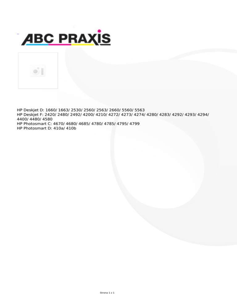 HP Deskjet D: 1660/ 1663/ 2530/ 2560/ 2563/ 2660/ 5560/ 5563 HP Deskjet F: 2420/ 2480/ 2492/ 4200/ 4210/ 4272/ 4273/ 4274/ 4280/ 4283/ 4292/ 4293/ 4294/ 4400/ 4480/ 4580 HP Photosmart C: 4670/ 4680/ 4685/ 4780/ 4785/ 4795/ 4799 HP Photosmart D: 410a/ 410b Strona 1 z 1