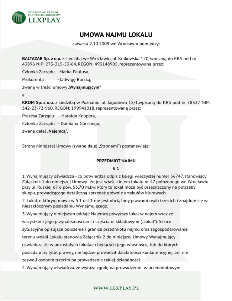 UMOWA NAJMU LOKALU zawarta 2.10.2009 we Wrocławiu pomiędzy: BALTAZAR Sp. z o.o. z siedzibą we Wrocławiu, ul. Krakowska 120, wpisaną do KRS pod nr 43896 NIP: 273-315-53-64, REGON: 493148905, reprezentowaną przez: Członka Zarządu - Marka Paulusa, Prokurenta - Jadwigę Burską, zwaną w treści umowy „Wynajmującym” a KROM Sp. z o.o. z siedzibą w Poznaniu, ul. Jagodowa 12/1,wpisaną do KRS pod nr 78327, NIP: 342-23-72-960, REGON: 199941018, reprezentowaną przez: Prezesa Zarządu - Harolda Koopera, Członka Zarządu - Damiana Górskiego, zwaną dalej „Najemcą”. Strony niniejszej Umowy (zwane dalej „Stronami”) postanawiają: PRZEDMIOT NAJMU §1 1. Wynajmujący oświadcza - co potwierdza odpis z księgi wieczystej numer 56747, stanowiący Załącznik 1 do niniejszej Umowy - że jest właścicielem lokalu nr 47 położonego we Wrocławiu przy ul. Ruskiej 67 o pow. 53,70 m.kw, który to lokal może być przeznaczony na potrzeby sklepu, prowadzącego detaliczną sprzedaż głównie artykułów biurowych. 2. Lokal, o którym mowa w § 1 ust.1 nie jest obciążony prawami osób trzecich i znajduje się w niezakłóconym posiadaniu Wynajmującego. 3. Wynajmujący niniejszym oddaje Najemcy powyższy lokal w najem wraz ze wszystkimi jego przynależnościami i częściami składowymi („Lokal”). Szkice sytuacyjne opisujące położenie i granice przedmiotu najmu oraz zagospodarowanie terenu wokół Lokalu stanowią Załącznik 2 do niniejszej Umowy. Wynajmujący oświadcza, że w pozostałych lokalach będących jego własnością lub do których posiada inny tytuł prawny, nie będzie prowadził działalności konkurencyjnej, ani nie zezwoli osobom trzecim na prowadzenie takiej działalności. 4. Wynajmujący oświadcza, że wyraża zgodę na prowadzenie w przedmiotowym lokalu usług głównie w zakresie handlu detalicznego przez Najemcę lub Podnajemcę i oświadcza, że w okresie trwania niniejszej umowy zgody swej nie cofnie. 5. Przedmiot najmu przekazany zostanie protokołem zdawczo-odbiorczym, stanowiącym Załącznik 3 do niniejszej Umowy, najpóźniej do dnia 01.11.2009 r. 6. Wynajmujący oświadcza, że ogół właścicieli budynku, w którym znajduje się przedmiotowy lokal, tworzy wspólnotę mieszkaniową oraz że zarząd nieruchomością wspólną został powierzony „Kierownik” Sp. z o.o. z siedzibą we Wrocławiu. CZYNSZ NAJMU §2 1. Z tytułu umowy Najemca płacić będzie miesięcznie na rzecz Wynajmującego czynsz najmu w kwocie netto: 5000,00zł (słownie: pięć tysięcy złotych) za całą powierzchnię przekazaną Najemcy do używania, przy czym obowiązek uiszczania czynszu powstaje po przekazaniu Najemcy przedmiotu najmu protokołem zdawczo-odbiorczym, o którym mowa w § 1 ust. 5. 2. Podstawą waloryzacji czynszu co kwartał będzie wskaźnik wzrostu cen na towary i usługi konsumpcyjne ogłoszony przez Prezesa GUS w Monitorze Polskim za poprzedni kwartał. Waloryzacja czynszu nie stanowi zmiany niniejszej Umowy i nie wymaga sporządzania aneksu. Waloryzacja następuje od pierwszego dnia kwartału następującego po kwartale, w którym przekazano przedmiot najmu do używania. W związku z uzgodnieniem klauzuli waloryzacyjnej, art. 6851 kodeksu cywilnego nie ma zastosowania. 3. Najemca będzie wpłacał Czynsz wraz z należną kwotą podatku od towarów i usług (VAT) na rachunek Wynajmującego nr 80 1020 8473 0000 8888 2832 1198 w banku X co miesiąc z góry, w ciągu czternastu dni od doręczenia rachunku / faktury VAT wystawionej przez Wynajmującego. Za dzień płatności uznawany będzie dzień uznania rachunku Wynajmującego przez bank Najemcy. OBOWIĄZKI WYNAJMUJĄCEGO §3 1. Wynajmujący zobowiąże wspólnotę mieszkaniową do świadczenia na rzecz Najemcy remontów i napraw głównych budynku i jego podstawowych urządzeń w tym naprawy dachów i elewacji i zewnętrznych przyłączy. W przypadku konieczności niezwłocznego wykonania napraw, Najemca zastrzega sobie prawo wykonania ich własnym staraniem na koszt Wynajmującego. Kwota poniesionych wydatków zostanie potrącona z bieżących należności Wynajmującego. 2. Wynajmujący oświadcza, że zapewnia Najemcy, Podnajemcy i ich klientom stały, swobodny i niezakłócony dostęp do lokalu i dojazd dla samochodów dostawczych bezpośrednio do budynku, w którym znajduje się lokal. 3. Wynajmujący niniejszym oświadcza, że udostępni Najemcy posiadaną dokumentację techniczną dotyczącą urządzeń znajdujących się w Lokalu. OBOWIĄZKI NAJEMCY §4 1. Wynajmujący oświadcza, że przedmiotowy Lokal posiada odrębne przyłącze energetyczne, o mocy 80 KW i o zabezpieczeniu przelicznikowym 120 A, które zostanie przekazane Najemcy, i oświadcza, że wyraża zgodę na przepisanie licznika prądu o nr RP RPT 002542 na Najemcę, a także na zwiększenie mocy prądu, wykonanie modernizacji wewnętrznej linii zasilającej (WLZ) oraz na rozbudowę istniejącego przyłącza, gdyby okazało się to niezbędne do prowadzenia działalności określonej niniejszą Umową. Najemca zawrze odrębną umowę bezpośrednio z zakładem energetycznym na dostawę energii elektrycznej. 2. Najemca będzie uiszczał Wynajmującemu w terminie 14 dni od dnia doręczenia Najemcy faktury lub rachunku wystawionego przez Wynajmującego, na konto wskazane na fakturze lub rachunku następujące opłaty: a) z tytułu dostawy zimnej i ciepłej wody, b) z tytułu wywozu nieczystości, lub Najemca bezpośrednio zawrze umowy z dostawcami tych usług. 3. Najemca zobowiązany jest: a) używać Lokal w sposób zgodny z jego przeznaczeniem i przestrzegać przepisów sanitarnych , przepisów dotyczących bezpieczeństwa i przepisów przeciwpożarowych, b) pokrywać koszty drobnych napraw i prac konserwacyjnych Lokalu, które z mocy prawa obciążają najemców, c) utrzymywać w Lokalu porządek. PRACE ADAPTACYJNE §5 1. Najemca na własny koszt może wykonywać w Lokalu wszelkie prace adaptacyjne i wprowadzać do Lokalu ulep