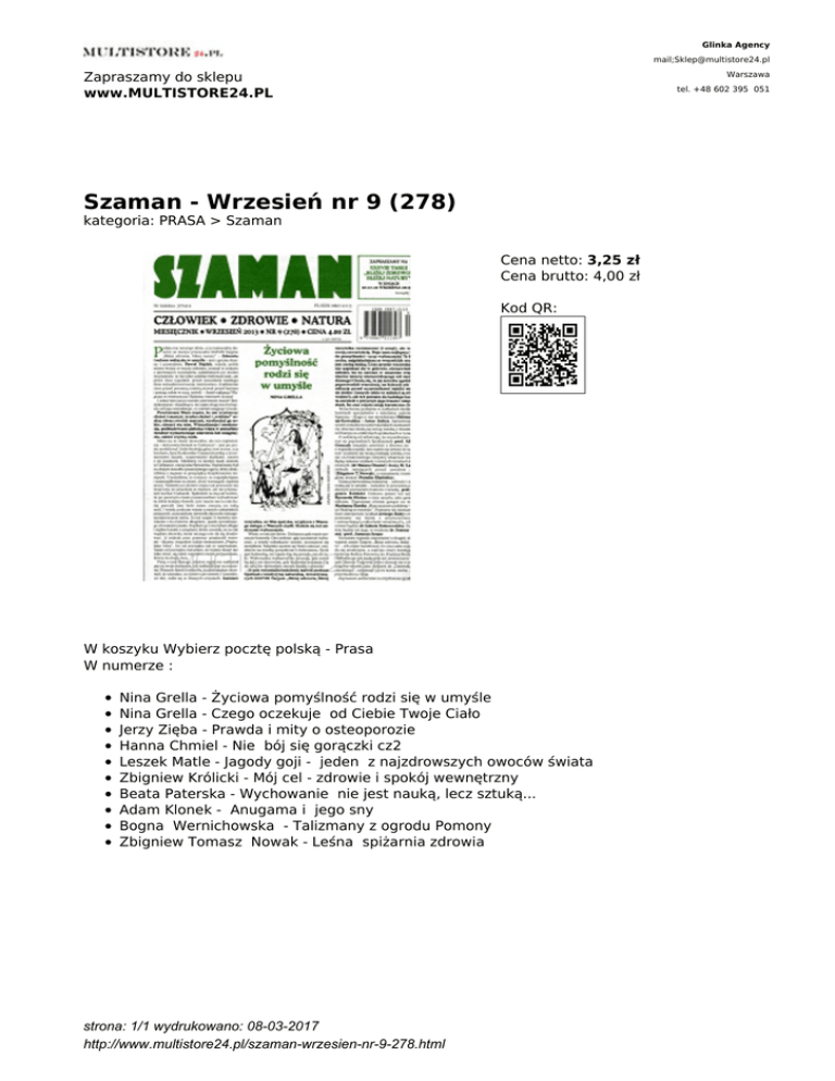 Glinka Agency mail;[email protected] Zapraszamy do sklepu www.MULTISTORE24.PL Warszawa tel. +48 602 395 051 Szaman - Wrzesień nr 9 (278) kategoria: PRASA > Szaman Cena netto: 3,25 zł Cena brutto: 4,00 zł Kod QR: W koszyku Wybierz pocztę polską - Prasa W numerze : Nina Grella - Życiowa pomyślność rodzi się w umyśle Nina Grella - Czego oczekuje od Ciebie Twoje Ciało Jerzy Zięba - Prawda i mity o osteoporozie Hanna Chmiel - Nie bój się gorączki cz2 Leszek Matle - Jagody goji - jeden z najzdrowszych owoców świata Zbigniew Królicki - Mój cel - zdrowie i spokój wewnętrzny Beata Paterska - Wychowanie nie jest nauką, lecz sztuką... Adam Klonek - Anugama i jego sny Bogna Wernichowska - Talizmany z ogrodu Pomony Zbigniew Tomasz Nowak - Leśna spiżarnia zdrowia strona: 1/1 wydrukowano: 08-03-2017 http://www.multistore24.pl/szaman-wrzesien-nr-9-278.html