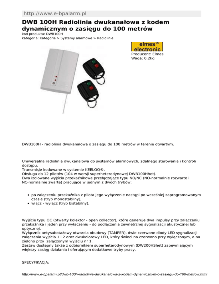 http://www.e-bpalarm.pl DWB 100H Radiolinia dwukanałowa z kodem dynamicznym o zasięgu do 100 metrów kod produktu: DWB100H kategoria: Kategorie > Systemy alarmowe > Radiolinie Producent: Elmes Waga: 0.2kg DWB100H - radiolinia dwukanałowa o zasięgu do 100 metrów w terenie otwartym. Uniwersalna radiolinia dwukanałowa do systemów alarmowych, zdalnego sterowania i kontroli dostępu. Transmisje kodowane w systemie KEELOQ®. Obsługa do 12 pilotów (104 w wersji superheterodynowej DWB100Hhet). Dwa izolowane wyjścia przekaźnikowe przełączające typu NO/NC (NO-normalnie rozwarte i NC-normalnie zwarte) pracujące w jednym z dwóch trybów: po załączeniu przekaźnika z pilota jego wyłączenie nastąpi po wcześniej zaprogramowanym czasie (tryb monostabilny), włącz - wyłącz (tryb bistabilny). Wyjście typu OC (otwarty kolektor - open collector), które generuje dwa impulsy przy załączeniu przekaźnika i jeden przy wyłączeniu - do podłączenia zewnętrznej sygnalizacji akustycznej lub optycznej. Wyłącznik antysabotażowy otwarcia obudowy (TAMPER), dwie czerwone diody LED sygnalizacji załączenia wyjścia 1 i 2 oraz dwukolorowy LED, który świeci na czerwono przy wyłączonym, a na zielono przy załączonym wyjściu nr 1. Zestaw dostępny także z odbiornikiem superheterodynowym (DW200HShet) zapewniającym większy zasięg działania i oferującym dodatkowe tryby pracy. SPECYFIKACJA: http://www.e-bpalarm.pl/dwb-100h-radiolinia-dwukanalowa-z-kodem-dynamicznym-o-zasiegu-do-100-metrow.html pilot nadajnik 433,92MHz zgodny z wymaganiami europejskich norm CE; zasilanie baterią 12V typu GP23A(DWB100H); wymiary obudowy (dł./szer./wys. w mm): 50/39/14. odbiornik superreakcyjny lub superheterodynowy (DW200Hhet) zasilanie napięciem stałym 12V z tolerancją ±15%; pobór prądu <20> 2 x wyjście przekaźnikowe (trzy styki) NO/NC (60VA, max 128V, 1A); czas podtrzymania wyjść przekaźn. w trybie monostabilnym: od 0,5s. do 4h; sygnalizacja przełączenia przekaźnika na dwukolorowej diodzie LED; wyjście S(1A/60VDC), "otwarty kolektor" dające impulsy zwarcia do masy; wyłącznik sygnalizujący otwarcie obudowy TAMPER; wymiary obudowy (dł./szer./wys.): 96/63/28mm; temperatura pracy od 0 do + 40oC (-20 do +40oC dla DW200Hhet). Odbiornik dwukanałowy produkowany jest także w wersji miniaturowej (DW200HM) o wym. 19/58/32 mm, który posiada podobne funkcje jak odbiornik DW200H. PRODUKCJA ZAKOŃCZONA http://www.e-bpalarm.pl/dwb-100h-radiolinia-dwukanalowa-z-kodem-dynamicznym-o-zasiegu-do-100-metrow.html