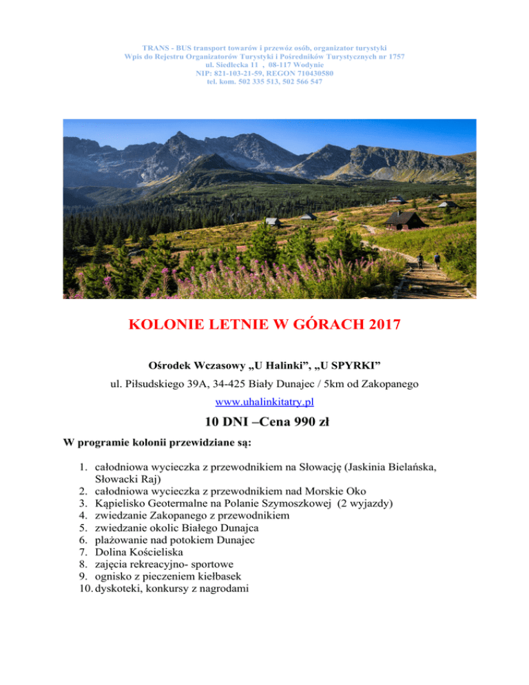 TRANS - BUS transport towarów i przewóz osób, organizator turystyki Wpis do Rejestru Organizatorów Turystyki i Pośredników Turystycznych nr 1757 ul. Siedlecka 11 , 08-117 Wodynie NIP: 821-103-21-59, REGON 710430580 tel. kom. 502 335 513, 502 566 547 KOLONIE LETNIE W GÓRACH 2017 Ośrodek Wczasowy „U Halinki”, „U SPYRKI” ul. Piłsudskiego 39A, 34-425 Biały Dunajec / 5km od Zakopanego www.uhalinkitatry.pl 10 DNI –Cena 990 zł W programie kolonii przewidziane są: 1. całodniowa wycieczka z przewodnikiem na Słowację (Jaskinia Bielańska, Słowacki Raj) 2. całodniowa wycieczka z przewodnikiem nad Morskie Oko 3. Kąpielisko Geotermalne na Polanie Szymoszkowej (2 wyjazdy) 4. zwiedzanie Zakopanego z przewodnikiem 5. zwiedzanie okolic Białego Dunajca 6. plażowanie nad potokiem Dunajec 7. Dolina Kościeliska 8. zajęcia rekreacyjno- sportowe 9. ognisko z pieczeniem kiełbasek 10. dyskoteki, konkursy z nagrodami Cena obejmuje: Dojazd autokarem i ubezpieczenie na koloniach Pobyt dziesięciodniowy i profesjonalna opieka pedagogiczna Noclegi w pokojach 2,3,4 i 5 osobowych z pełnym węzłem sanitarnym i TV Całodzienne wyżywienie Bilety wstępu na wymienione atrakcje Usługę przewodników (zgodnie z programem) Dostęp do boisk i urządzeń rekreacyjno-sportowych Opieka lekarza i pielęgniarki na wezwanie TERMINY TURNUSÓW 1. 08.07 – 17.07.2017 2. 02.08 – 11.08.2017 KONTAKT Milena Makarska Kom. 502 335 513 Mail: [email protected] *** Każdy z uczestników powinien posiadać paszport lub dowód osobisty*** *** Możliwość dofinansowania z zakładu pracy***
