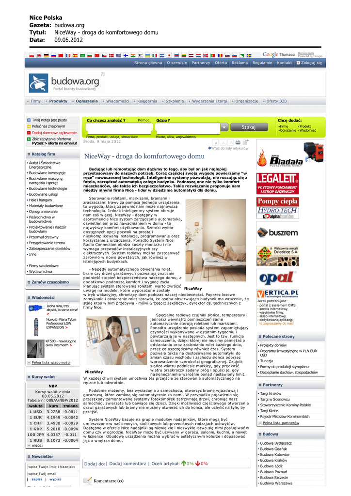 Nice Polska Gazeta: budowa.org Tytu³: NiceWay droga do komfortowego domu Data: 09.05.2012 Rozszerzenia Powered by Google Strona główna Firmy Produkty Ogłoszenia Twój notes jest pusty Wiadomości Księgarnia Co chcesz znaleźć ? Pomoc O serwisie Szkolenia Partnerzy Oferta Wydarzenia i targi Reklama Regulamin Organizacje Kontakt Oferty B2B Gdzie ? Chcę dodać: Poleć nas znajomym Firmę Ogłoszenie Dodaj darmowe ogłoszenie Złóż zapytanie ofertowe Pytasz > oferta na emailu! Katalog firm Firma, produkt, usługa, słowo klucz Zaloguj się Produkt Wiadomość Miasto, ulica, województwo Środa, 9 maja 2012 A A A Wróć do listy artykułów NiceWay - droga do komfortowego domu Audyt i Świadectwa Energetyczne Budowlane inwestycje Budowlane maszyny, narzędzia i sprzęt Budowlane technologie Budując lub remontując dom dążymy to tego, aby był on jak najlepiej przystosowany do naszych potrzeb. Coraz częściej swoją wygodę powierzamy "w ręce" nowoczesnej technologii. Inteligentne systemy pozwalają, nie ruszając się z fotela, zarządzać automatyką całego budynku. Podnoszą one nie tylko komfort mieszkańców, ale także ich bezpieczeństwo. Takie rozwiązanie proponuje nam między innymi firma Nice - lider w dziedzinie automatyki dla domu. Budowlane usługi Hale i hangary Materiały budowlane Oprogramowanie Pośrednictwo w budownictwie Projektowanie i nadzór budowlany Przemysł drzewny Przygotowanie terenu Zabezpieczanie obiektów Inne Sterowanie roletami, markizami, bramami i zraszaczami trawy za pomocą jednego urządzenia to wygoda, którą zapewnić nam może najnowsza technologia. Jednak inteligentny system oferuje nam coś więcej. NiceWay - dostępny w asortymencie Nice system zarządzania automatyką, oświetleniem oraz nawadnianiem w domu - to najwyższy komfort użytkowania. Szeroki wybór dostępnych opcji pozwoli na prostą i nieskomplikowaną instalacje, programowanie oraz korzystanie z urządzenia. Ponadto System Nice Radio Connection obniża koszty montażu i nie wymaga przewodów instalacyjnych czy elektrycznych. System radiowy można zastosować zarówno w nowo powstałych, jak również w istniejących budynkach. Firmy szkoleniowe Wydawnictwa Zamów czasopismo Wiadomości Jedna rura, trzy złączki, ta sama cena! > Nowość! Piana Tytan Professional LOW EXPANSION > KF 500 - rewolucyjne okno Internorm > Pełna lista wiadomości Kursy walut NBP Kursy walut z dnia 08.05.2012 Tabela nr 088/A/NBP/2012 waluta kurs zmiana 1 USD 3.2238 -0.0041 1 EUR 4.1949 -0.0042 1 CHF 3.4930 -0.0029 1 GBP 5.2010 -0.0094 100 JPY 4.0357 1 RUB -0.011 0.1073 -0.0004 - Napędy automatycznego otwierania rolet, bram czy drzwi garażowych pozwalają znacznie podnieść stopień bezpieczeństwa naszego domu, a dodatkowo podnoszą komfort i wygodę życia. Planując system sterowania roletami warto zwrócić NiceWay uwagę na modele, które wyposażone zostały w tryb wakacyjny, chroniący dom podczas naszej nieobecności. Poprzez losowe zamykanie i otwieranie rolet sprawia, że osoba obserwująca budynek ma wrażenie, że stale ktoś w nim przebywa - mówi Grzegorz Jakóbczyk, dyrektor ds. technicznych z firmy Nice. Specjalne radiowe czujniki słońca, temperatury i jasności wewnątrz pomieszczeń same automatycznie sterują roletami lub markizami. Ponadto urządzenie posiada system zapamiętujący czynności wykonywane w ostatnim tygodniu i powtarzają je w następnych. Jest to tzw. funkcja samouczenia, dzięki której nie musimy pamiętać o odsłanianiu oraz zasłanianiu rolet każdego dnia, przez co oszczędzamy również czas. System pozwala także na dostosowanie automatyki do zmian czasu wschodu i zachodu słońca poprzez wprowadzenie szerokości geograficznej. Czujnik słońca-wiatru podniesie markizy, gdy prędkość wiatru przekroczy zadany próg i opuści je, gdy NiceWay nasłonecznienie wzrośnie ponad nastawiony limit. W każdej chwili system umożliwia też przejście ze sterowania automatycznego na ręczne lub odwrotnie. Podobnie możemy, bez wysiadania z samochodu, otworzyć bramę wjazdową i garażo wą, które zamkną się automatycznie za nami. W przypadku pojawienia się przeszkody zamontowane systemy fotokomórek zatrzymają drzwi, chroniąc nasz samochód, zwierzęta lub bawiące się dzieci. Dzięki możliwości czę ściowego otworzenia drzwi garażowych lub bramy nie musimy otwierać ich do końca, ale uchylić na tyle, by przejść. System NiceWay bazuje na grupie modułów nadajników, które mogą być umieszczone w naściennych, stolikowych lub przenośnych rodzajach uchwytów. Dostępne w ofercie Nice nadajniki są niewielkie i niezwykle łatwo się nimi posługiwać w domu czy w ogrodzie. NiceWay może być używany w garażu, salonie, kuchni, a nawet w łazience. Obudowę urządzenia można wybrać w estetycznym kolorze i dopasować ją do wnętrza domu. więcej Polecane strony Projekty domów Programy Inwestycyjne w PLN EUR USD Tunezja Formy do produkcji styropianu Docieplanie dachów, stropodachów Partnerzy Targi Kraków Targi w Sosnowcu Stowarzyszenie Kominy Polskie Targi Kielce Rejestr Mistrzów Kominiarskich Pełna lista partnerów Budowa Budowa Bydgoszcz Budowa Gdańsk Budowa Katowice Newsletter wpisz Twoje Imię i Nazwisko Dodaj do:| Dodaj komentarz | Oceń artykuł: 0% Budowa Kraków Budowa Łódź Budowa Poznań wpisz Twój email i zapisz n j k l m n j wypisz k l m 0% Komentarze (0) Budowa Szczecin Budowa Warszawa Nice Polska Gazeta: budowa.org Tytu³: NiceWay droga do komfortowego domu Data: 09.05.2012 Budowa Wrocław OK Podobne artykuły > > > > > > > > > > ZENDOW - system profili PCW do produkcji okien i drzwi Jak wspiąć się na most do Mostostalu? Orły Polskiego Budownictwa 2007 dla MOSTOSTAL CHOJNICE SA Więcej sklepów Dobre Dla Domu BirdSystem pierwszym klientem Good One PR w 2010 Jak zabezpieczyć budynek przed gołębiami? Zabezpiecz dach od wewnątrz - membrany dachowe Roof System firmy Den Braven Innowacyjny BirdSystem na gołęb