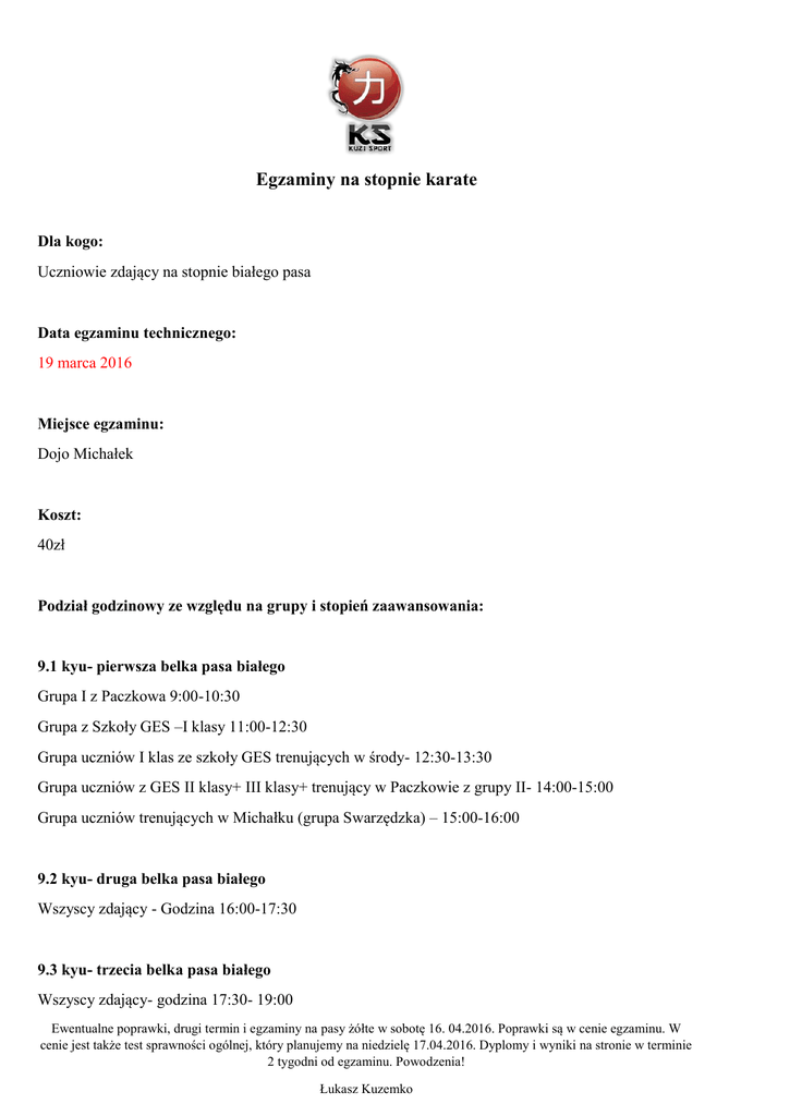Egzaminy na stopnie karate Dla kogo: Uczniowie zdający na stopnie białego pasa Data egzaminu technicznego: 19 marca 2016 Miejsce egzaminu: Dojo Michałek Koszt: 40zł Podział godzinowy ze względu na grupy i stopień zaawansowania: 9.1 kyu- pierwsza belka pasa białego Grupa I z Paczkowa 9:00-10:30 Grupa z Szkoły GES –I klasy 11:00-12:30 Grupa uczniów I klas ze szkoły GES trenujących w środy- 12:30-13:30 Grupa uczniów z GES II klasy+ III klasy+ trenujący w Paczkowie z grupy II- 14:00-15:00 Grupa uczniów trenujących w Michałku (grupa Swarzędzka) – 15:00-16:00 9.2 kyu- druga belka pasa białego Wszyscy zdający - Godzina 16:00-17:30 9.3 kyu- trzecia belka pasa białego Wszyscy zdający- godzina 17:30- 19:00 Ewentualne poprawki, drugi termin i egzaminy na pasy żółte w sobotę 16. 04.2016. Poprawki są w cenie egzaminu. W cenie jest także test sprawności ogólnej, który planujemy na niedzielę 17.04.2016. Dyplomy i wyniki na stronie w terminie 2 tygodni od egzaminu. Powodzenia! Łukasz Kuzemko