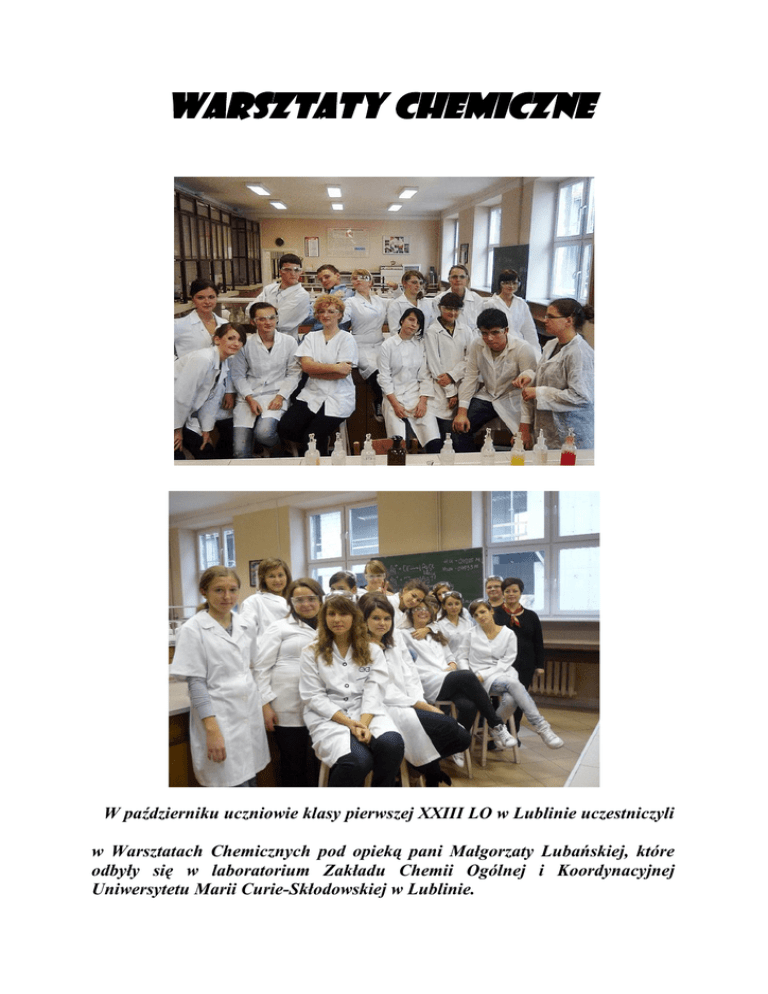 Warsztaty Chemiczne W październiku uczniowie klasy pierwszej XXIII LO w Lublinie uczestniczyli w Warsztatach Chemicznych pod opieką pani Małgorzaty Lubańskiej, które odbyły się w laboratorium Zakładu Chemii Ogólnej i Koordynacyjnej Uniwersytetu Marii Curie-Skłodowskiej w Lublinie. Zajęcia odbywały się w laboratorium chemicznym Zakładu Chemii Ogólnej i Koordynacyjnej na Wydziale Chemii UMCS w Lublinie. Dla niektórych z nas była to interesująca możliwość eksperymentowania. Ponieważ nie na co dzień możemy przebywać w tego rodzaju miejscach i wykonywać tyle ciekawych doświadczeń. Pierwszy element prac laboratoryjnych stanowiło zapoznanie się z przepisami BHP i zasadami panującymi w laboratorium chemicznym. Następnie każda z grup przystąpiła do przeprowadzenia cyklu doświadczeń chemicznych. Polegały one m. in. na odważeniu i odmierzeniu określonych ilości substancji chemicznych, co wymagało koncentracji i dużej precyzji. Oczywiście poradziliśmy sobie z tym zadaniem bez problemów. Po sporządzeniu wodnych roztworów kwasów i zasad o określonym stężeniu rozpoczęliśmy oznaczanie stężenia kwasu za pomocą mianowanego roztworu zasady metodą miareczkowania alkacymetrycznego. Jak dobrze wiemy w roztworze zasad fenoloftaleina barwi się na kolor malinowy. * Obserwacja zabarwienia płomienia tzw. próby płomieniowe wybranych kationów metali, np. sodu, potasu, baru oraz litu do złudzenia przypominała „sztuczne ognie”, które przybierały różne kolory. Wyglądało to bajecznie. Kolejnym zadaniem z jakim musieliśmy się zmierzyć oraz wykazać umiejętnościami pracy eksperymentalnej było badanie odczynu pH roztworów kwasów i zasad. Temu zadaniu także podołaliśmy bez przeszkód. W nagrodę za bardzo dobrze wykonane doświadczenia mogliśmy przystąpić do obserwacji reakcji mikroskopowych badania kryształów sodu, potasu, magnezu i kobaltu. Reakcje strąceniowe jakie wykonaliśmy dla niektórych barwnych soli zainteresowały wszystkich najbardziej. Poznaliśmy wiele ciekawych nazw związków chemicznych. Tylko kto je wszystkie zapamięta? Jedna utkwiła zapewne wszystkim dobrze w pamięci „smocza krew”to osad związku kompleksowego żelaza o bardzo intensywnym czerwonym zabarwieniu. * Dwie godziny. Cieszą. Uczą. Zajęcia bardzo nam się podobały, pragniemy jeszcze nie raz zagościć na Wydziale Chemii UMCS w Lublinie. Polecamy wszystkim uczestnictwo w takich zajęciach. Klasa 1f Wykonali Łukasz Kamiński oraz Paula Szacoń