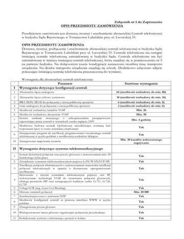 Załącznik nr 1 do Zaproszenia OPIS PRZEDMIOTU ZAMÓWIENIA Przedmiotem zamówienia jest dostawa, montaż i uruchomienie abonenckiej Centrali telefonicznej w budynku Sądu Rejonowego w Tomaszowie Lubelskim przy ul. Lwowskiej 55. OPIS PRZEDMIOTU ZAMÓWIENIA Dostawa, montaż, podłączenie i uruchomienie abonenckiej centrali telefonicznej w budynku Sądu Rejonowego w Tomaszowie Lubelskim przy ul. Lwowskiej 55. Centrala telefoniczna ma zastąpić istniejącą centrale telefoniczną zainstalowaną w budynku Sądu. Centrala telefoniczna ma być zainstalowana w miejscu istniejącej centrali telefonicznej, która znajduje się w pomieszczeniu nr 5 na parterze budynku. Na dołączonym rzucie kondygnacji zaznaczono możliwą trasę transportu urządzenia. Na drodze transportu urządzenia znajdują się schody. Dodatkowo załączono zdjęcie pokazujące istniejącą centralę telefoniczną przeznaczoną do wymiany. ` I Wymagania dla abonenckiej centrali telefonicznej: Parametr Wymagania dotyczące konfiguracji centrali 1 Abonenckie łącza analogowe 64 (możliwość rozbudowy do min. 80) 2 Abonenckie łącza cyfrowe systemowe 10 (możliwość rozbudowy do min. 16) 3 4 5 BRA ISDN 2B+D do połączenia z siecią publiczną operatora Linie analogowe do połączenia z siecią publiczną operatora Możliwość rozbudowy kanałów VOiP 6 Możliwość rozbudowy abonentów VOiP System zasilania awaryjnego z zabezpieczeniem przepięciowym zapewniający pracę centrali w warunkach zaniku napięcia 230V 7 Stawiane wymagania 6 (możliwość rozbudowy do min. 8) 2 (możliwość rozbudowy do min. 6) Min. 26 Min. 50 Min. 4 godziny 8 Modułowa budowa centrali telefonicznej umożliwiająca wymianę kart wyposażeni łączy w czasie normalnej eksploatacji Tak 9 Zintegrowany program do taryfikacji, programowania i monitoringu centrali telefonicznej w języku polskim z możliwością wydruków bilingów. Tak 10 Zintegrowane nagrywanie rozmów Min. 10 kanałów jednoczesnego nagrywania II Wymagania dotyczące systemu telekomunikacyjnego 1 2 3 4 5 6 7 System dystrybucji połączeń oraz poczty głosowej z zastosowaniem min. 20 kanałowego trybu pracy Zarządzanie systemem telekomunikacyjnym poprzez LAN/WAN(TCP/IP) Taryfikacja połączeń telefonicznych z wykorzystaniem stanowiska taryfikacji połączeń telefonicznych w oparciu o dostarczone oprogramowanie taryfikacyjne Sieciowanie z innymi centralami telefonicznymi poprzez sieć IP, wykorzystanie technologii VOiP do zestawiania połączeń głosowych, obsługa protokołu SIP oraz następujących kodeków audio: G.711, G.726, G.729 Usługa LCR (ang. Least Cost Routing). Historia ostatnich połączeń Tak Tak Tak Tak Tak Min. 50 000 Tak 9 Synchronizacja czasu z serwerem NTP Możliwość konfiguracji centrali za pomocą interfejsu WWW w języku polskim Zintegrowana poczta głosowa 10 Wielopoziomowe menu głosowe organizujące połączenia przychodzące Tak 11 Kolejkowanie rozmów z informacją o pozycji w kolejce Tak 8 Tak Tak 14 15 Możliwość nawiązywania połączenia z zewnątrz bezpośrednio na numer abonenta wewnętrznego Wewnętrzny zintegrowany system dystrybucji połączeń minimum 4 kanałowy umożliwiający nagranie przynajmniej 50 różnych zapowiedzi słownych o łącznym czasie przynajmniej 50 minut Pełna identyfikacja numerów CLIP na portach systemowych i analogowych Realizacja równoległych połączeń konferencyjnych 16 Blokowanie portu wewnętrznego kodem (hasłem) Tak 17 Tak 23 Zestawienie połączeń wewnętrznych z wykorzystaniem PIN Przenoszenie wywołań: natychmiastowe, z opóźnieniem, przy zajętości abonenta, przechwytywanie wywołań Wielopoziomowe kategorie uprawnień (minimum 10 poziomów) abonentów wewnętrznych dla zestawienia połączeń zewnętrznych Blokowanie abonentom wewnętrznym możliwości wybierania określonych numerów zewnętrznych Identyfikacja złośliwych wywołań, MCID Współpraca z analogowymi aparatami telefonicznymi dowolnego typu z wybieraniem tonowym Możliwość współpracy z aparatami telefonicznymi IP 24 Przyłączenie aparatów cyfrowych na kablu jednoparowym Tak 25 Możliwość współpracy z systemem telefonii bezprzewodowej DECT IP Wybieranie przez abonenta nieuprawnionego wskazanych numerów linii miejskich (np. pogotowie ratunkowe, straż pożarna, itd.) Tak Tak 12 13 18 19 20 21 22 26 Tak Tak Tak Min. 10 uczestników Tak Tak Tak Tak Tak Tak III Pozostałe wymagania dotyczące centrali 2 Zgodność z normami: PN-EN 60950, PN-EN 55022, PN-EN 55024, PNEN 61000 Obudowa pozwalająca na powieszenie na ścianie 3 Szerokość centrali 4 5 Gwarancja producenta Dokumentacja 1 Tak Tak Maksymalnie 48 cm 24 miesiące Instrukcja obsługi w języku polskim Uwaga: dopuszcza się większą szerokość centrali pod warunkiem przełożenia istniejących modemów ISDN w taki sposób, aby był możliwy montaż nowej centrali telefonicznej w miejsce istniejącej centrali telefonicznej. W przypadku zaproponowania centrali telefonicznej o większej szerokości Wykonawca pod tabelą z parametrami technicznymi do wypełnienia zamieszcza oświadczenie o przesunięciu modemów ISDN we własnym zakresie i na swój koszt w sposób umożliwiający montaż nowej centrali telefonicznej w miejscu istniejącej centrali telefonicznej, pod rygorem odrzucenia oferty w przypadku braku takiego oświadczenia. Pozostałe wymagania stawiane podczas montażu i instalacji centrali telefonicznej: 1. Zamontowanie centrali telefonicznej z systemem zasilania w wyznaczonym pomieszczeniu. 2. Podłączenie centrali telefonicznej do uziomu. 3. Dokonanie przełączenia łączy od obecnego operatora telekomunikacyjnego. 4. Dokonanie przełączenia istniejącej sieci wewnętrznej. 5. Wykonanie prac towarzyszących przy uruchomieniu i instalacji systemu. 6. Dokonanie przełączenia i uruchomienia wszystkich urządzeń końcowych pracujących w ramach dotychczasowych rozwiązań. 7. Skonfigurowanie centrali telefonicznej zgodnie z wykazem przedstawionym prz
