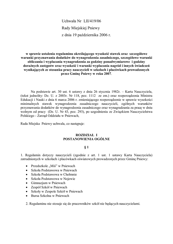 Uchwała Nr LII/419/06 Rady Miejskiej Pniewy z dnia 19 października 2006 r. w sprawie ustalenia regulaminu określającego wysokość stawek oraz szczegółowe warunki przyznawania dodatków do wynagrodzenia zasadniczego, szczegółowe warunki obliczania i wypłacania wynagrodzenia za godziny ponadwymiarowe i godziny doraźnych zastępstw oraz wysokość i warunki wypłacania nagród i innych świadczeń wynikających ze stosunku pracy nauczycieli w szkołach i placówkach prowadzonych przez Gminę Pniewy w roku 2007. Na podstawie art. 30 ust. 6 ustawy z dnia 26 stycznia 1982r. – Karta Nauczyciela, (tekst jednolity: Dz. U. z 2003r. Nr 118, poz. 1112 ze zm.) oraz rozporządzenia Ministra Edukacji i Nauki z dnia 6 marca 2006 r. zmieniającego rozporządzenie w sprawie wysokości minimalnych stawek wynagrodzenia zasadniczego nauczycieli, ogólnych warunków przyznawania dodatków do wynagrodzenia zasadniczego oraz wynagradzania za pracę w dniu wolnym od pracy (Dz. U. Nr 43, poz. 293), po uzgodnieniu ze Związkiem Nauczycielstwa Polskiego - Zarząd Oddziału w Pniewach, Rada Miejska Pniewy uchwala, co następuje: ROZDZIAŁ I POSTANOWIENIA OGÓLNE §1 1. Regulamin dotyczy nauczycieli (zgodnie z art. 1 ust. 1 ustawy Karta Nauczyciela) zatrudnionych w szkołach i placówkach oświatowych prowadzonych przez Gminę Pniewy: • • • • • • • • Przedszkole „Miś” w Pniewach Szkoła Podstawowa w Pniewach Szkoła Podstawowa w Chełmnie Szkoła Podstawowa w Nojewie Gimnazjum w Pniewach Zespół Szkół w Pniewach Szkoły w Zespole Szkół w Pniewach Bursa Szkolna w Pniewach 2. Regulaminu nie stosuje się do pracowników szkół nie będących nauczycielami. §2 Regulamin reguluje następujące dodatki do wynagrodzenia zasadniczego nauczycieli: 1. dodatek za wysługę lat 2. dodatek motywacyjny 3. dodatek funkcyjny 4. dodatek za warunki pracy 5. wynagrodzenie za godziny ponadwymiarowe i godziny doraźnych zastępstw 6. nagrody i inne świadczenia wynikające ze stosunku pracy, z wyłączeniem świadczeń z zakładowego funduszu świadczeń socjalnych i dodatków socjalnych określonych w art. 54 Karty Nauczyciela. §3 Do obliczenia średniej wynagrodzeń nauczycieli, uwzględniając przewidywaną strukturę zatrudnienia w roku 2007, przyjmuje się osoby zatrudnione w pełnym i niepełnym wymiarze godzin. §4 Minimalne stawki wynagrodzenia zasadniczego oraz tabelę zaszeregowania dla nauczycieli określa rozporządzenie Ministra Edukacji i Nauki z dnia 6 marca 2006 r. zmieniające rozporządzenie w sprawie wysokości minimalnych stawek wynagrodzenia zasadniczego nauczycieli, ogólnych warunków przyznawania dodatków do wynagrodzenia zasadniczego oraz wynagradzania za pracę w dniu wolnym od pracy. ROZDZIAŁ II DODATEK ZA WYSŁUGĘ LAT §5 1. Wysokość oraz warunki nabywania przez nauczyciela prawa do dodatku za wysługę lat określają przepisy art. 33 ust. 1 Karty Nauczyciela oraz § 7 rozporządzenia Ministra Edukacji Narodowej z dnia 11 maja 2000 r., o którym mowa w § 4 Regulaminu. 2. Dodatek za wysługę lat przysługuje: 1) począwszy od pierwszego dnia miesiąca kalendarzowego następującego po miesiącu, w którym nauczyciel nabył prawo do dodatku lub do wyższej stawki tego dodatku, jeżeli nabycie prawa nastąpiło w ciągu miesiąca, 2) za dany miesiąc, jeżeli nabycie prawa do dodatku lub wyższej jego stawki nastąpiło od pierwszego dnia miesiąca. 3. Dodatek za wysługę lat przysługuje nauczycielowi w pełnej wysokości także w okresie przebywania nauczyciela na urlopie dla poratowania zdrowia. ROZDZIAŁ III DODATEK MOTYWACYJNY §6 1. Warunkiem przyznania nauczycielowi dodatku motywacyjnego jest uzyskanie szczególnych osiągnięć dydaktycznych, wychowawczych i opiekuńczych, potwierdzonych sukcesami w konkursach, zawodach, olimpiadach, przeglądach, a także: 1) umiejętność rozwiązywania problemów wychowawczych uczniów we współpracy z ich rodzicami, 2) pełne rozpoznanie środowiska wychowawczego uczniów, aktywne i efektywne działanie na rzecz uczniów potrzebujących szczególnej opieki, 3) zaangażowanie w realizację czynności i zadań określonych w art. 42 ust. 2 Karty Nauczyciela oraz prowadzenie zajęć pozalekcyjnych. 2. Dla nauczyciela doradcy metodycznego oprócz kryteriów, o których mowa w ust. 1 Regulaminu, podstawą ustalenia dodatku motywacyjnego jest również: 1) prowadzenie konsultacji indywidualnych i zespołowych, organizowanie konferencji przedmiotowo metodycznych oraz prowadzenie warsztatów metodycznych, 2) opracowywanie i upowszechnianie materiałów metodycznych, 3) wspomaganie nauczycieli w zdobywaniu kolejnych stopni awansu zawodowego. 3. O wysokości dodatku motywacyjnego dla dyrektorów szkół decydują w szczególności następujące kryteria: 1) umiejętność racjonalnego gospodarowania środkami finansowymi szkoły (placówki), w tym: a) przestrzeganie dyscypliny budżetowej, b) pozyskiwanie środków pozabudżetowych oraz umiejętność ich właściwego wykorzystania na cele szkoły, c) podejmowanie działań zapewniających utrzymanie powierzonego mienia w stanie gwarantującym optymalne warunki do realizacji zadań dydaktyczno-wychowawczych; 2) sprawność organizacyjna w realizacji zadań szkoły, w tym: a) bezpieczeństwo, dyscyplina pracy, podział zadań, terminowość realizacji zadań i zarządzeń, b) podejmowanie działań motywujących nauczycieli do doskonalenia i podnoszenia kwalifikacji zawodowych, c) podejmowanie działań mających na celu promowanie szkoły; 3) wysokie efekty w pracy dydaktycznej i wychowawczej szkoły/placówki, w tym: a) osiągnięcia uczniów szkoły: naukowe, sportowe, artystyczne w skali regionu, województwa, kraju, b) dbałość o klimat wychowawczy szkoły poprzez rozwiązywanie konkretnych problemów wychowawczych, podejmowanie efektywnych działań profilaktycznych zapobiegających zagrożeniom społecznym, c) stwarzanie warunków sprzyjających rozwojowi samorządno