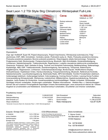 Numer zlecenia: 96108 Wydruk z: 08.03.2017 Seat Leon 1.2 TSI Style 5trg Climatronic Winterpaket Full-Link Cena: 14.999,00 Rodzaj nadwozia Kolor Moc Pojemność sko. Pierwsza rejestr. Przebieg Badanie techni. Przekładnia Paliwo CO2-Effizenzklasse Liczba drzwi Liczba foteli Limuzyna Szary metalik 81 kW (110 KM) 1.197 ccm 10/2016 4.500 km 10/2017 6-biegowa Benzyna B 5 5 Udokum. p. VAT Wyposażenie Zugr.-lgd. Kraftstoff: Super 95, Pojazd ekspozycyjny, Pojazd importowany, Klimatyzacja automatyczna, Felgi aluminiowe, ESP, ABS, Immobilizer, Centralny zamek, Podnośnik szyby el., Radio, Poduszka powietrzna kierowcy, Poduszka powietrzna pasażera, Boczne poduszki powietrzne, Wspomaganie układu kierowniczego, Tempomat, Podgrzewanie foteli, Bordcomputer, Freisprecheinrichtung, Bluetooth, Mp3-Schnittstelle, Kindersitzbefestigung, Lichtsensor, Nebelscheinwerfer, Traktionskontrolle, Regensensor, Lusterko zewnętrzne elektrycznie przestawiane, Gwarancja, Polsterart: Stoff, Getriebe 6-Gang Technik und Sicherheit Fahrerairbag, Beifahrerairbag, Seitenairbags, Kopfairbags, ABS, ESP, Traktionskontrolle, Zentralverriegelung, Servolenkung, Tempomat, Elektronische Wegfahrsperre, Regensensor, Lichtsensor, Außentemperaturanzeige, Bordcomputer, Multifunktions-Display, Drehzahlmesser, Kopfstützen hinten, Handyvorbereitung, Freisprecheinrichtung, Bluetooth, Reifendruck-Kontrolle, Nebelscheinwerfer, Leuchtweitenregulierung Multimedia Radio, MP3-Schnittstelle Komfort Fensterheber elektrisch, Außenspiegel elektrisch, Außenspiegel beheizt, Colorverglasung, Coming-Home-Funktion, Leaving-Home-Funktion Innenausstattung Klimaautomatik, Sitzheizung, Lederlenkrad, Mittelarmlehne, Gepäckraumabdeckung, Rücksitze klappbar, Isofix-System für Kindersitze Aussenausstattung Leichtmetallfelgen Pakete Lichtpaket, Winterpaket Sonstiges Irrtümer vorbehalten, Änderungen vorbehalten Weitere Informationen Weitere Neu- u. Gebrauchtwagen können Sie auf unserem Firmengelände besichtigen.Unsere Serviceleistungen: www.autozentrum-steiner.de ! Dieses Angebot ist unverbindlich und freibleibend Zwischenverkauf vorbehalten, Druckfehler und Irrtümer vorbehalten. Przykładowy kredyt* Zaliczka Nettokreditbetrag Soll-Zinssatz p.a. Stopa odsetkowa 5.249,65 EUR 9.749,35 EUR 4,88 % 4,99 % Soll-Zinssatzart Okres kredytowania Suma kredytu Gebunden 96 Miesięcy 11.795,22 EUR Rata miesięczna 122,87 EUR *Santander Consumer Bank AG, Santander-Platz 1, 41061 Mönchengladbach Zużycie / Emisja CO2* w mieście poza miastem kombinowany Emisja CO2 6,2 L/100 km 4,3 L/100 km 5,0 L/100 km 116 g/km * Dodatkowe oficjalne informacje o zużyciu paliwa i emisji CO2 nowych samochodów osobowych można znaleźć w przewodniku zużycia paliwa i emisji CO2 nowych samochodów osobowych, dostępnym bezpłatnie we wszystkich punktach sprzedaży oraz w Deutschen Automobil Treuhand GmbH pod adresem www.dat.de CO2-Effizenzklasse Dane kontaktowe Auf der Grundlage der gemessenen CO2-Emission unter Berücksichtigung der Masse des Fahrzeugs ermittelt. F. Steiner GmbH Am Bernstein 22-28 57250 Netphen Tel. 02738 6090 Fax 02738 609307 [email protected] http://www.autozentrum-steiner.de Numer zlecenia: 96108 Wydruk z: 08.03.2017 Seat Leon 1.2 TSI Style 5trg Climatronic Winterpaket Full-Link Numer zlecenia: 96108 Wydruk z: 08.03.2017 Seat Leon 1.2 TSI Style 5trg Climatronic Winterpaket Full-Link