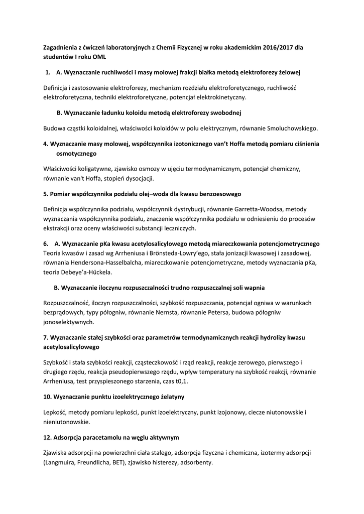 Zagadnienia z dwiczeo laboratoryjnych z Chemii Fizycznej w roku akademickim 2016/2017 dla studentów I roku OML 1. A. Wyznaczanie ruchliwości i masy molowej frakcji białka metodą elektroforezy żelowej Definicja i zastosowanie elektroforezy, mechanizm rozdziału elektroforetycznego, ruchliwośd elektroforetyczna, techniki elektroforetyczne, potencjał elektrokinetyczny. B. Wyznaczanie ładunku koloidu metodą elektroforezy swobodnej Budowa cząstki koloidalnej, właściwości koloidów w polu elektrycznym, równanie Smoluchowskiego. 4. Wyznaczanie masy molowej, współczynnika izotonicznego van’t Hoffa metodą pomiaru ciśnienia osmotycznego Właściwości koligatywne, zjawisko osmozy w ujęciu termodynamicznym, potencjał chemiczny, równanie van't Hoffa, stopieo dysocjacji. 5. Pomiar współczynnika podziału olej–woda dla kwasu benzoesowego Definicja współczynnika podziału, współczynnik dystrybucji, równanie Garretta-Woodsa, metody wyznaczania współczynnika podziału, znaczenie współczynnika podziału w odniesieniu do procesów ekstrakcji oraz oceny właściwości substancji leczniczych. 6. A. Wyznaczanie pKa kwasu acetylosalicylowego metodą miareczkowania potencjometrycznego Teoria kwasów i zasad wg Arrheniusa i Brönsteda-Lowry’ego, stała jonizacji kwasowej i zasadowej, równania Hendersona-Hasselbalcha, miareczkowanie potencjometryczne, metody wyznaczania pKa, teoria Debeye’a-Hückela. B. Wyznaczanie iloczynu rozpuszczalności trudno rozpuszczalnej soli wapnia Rozpuszczalnośd, iloczyn rozpuszczalności, szybkośd rozpuszczania, potencjał ogniwa w warunkach bezprądowych, typy półogniw, równanie Nernsta, równanie Petersa, budowa półogniw jonoselektywnych. 7. Wyznaczanie stałej szybkości oraz parametrów termodynamicznych reakcji hydrolizy kwasu acetylosalicylowego Szybkośd i stała szybkości reakcji, cząsteczkowośd i rząd reakcji, reakcje zerowego, pierwszego i drugiego rzędu, reakcja pseudopierwszego rzędu, wpływ temperatury na szybkośd reakcji, równanie Arrheniusa, test przyspieszonego starzenia, czas t0,1. 10. Wyznaczanie punktu izoelektrycznego żelatyny Lepkośd, metody pomiaru lepkości, punkt izoelektryczny, punkt izojonowy, ciecze niutonowskie i nieniutonowskie. 12. Adsorpcja paracetamolu na węglu aktywnym Zjawiska adsorpcji na powierzchni ciała stałego, adsorpcja fizyczna i chemiczna, izotermy adsorpcji (Langmuira, Freundlicha, BET), zjawisko histerezy, adsorbenty.