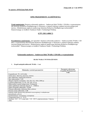 Załącznik nr 1 do SIWZ Nr sprawy: DYR.Zam.Publ.-03/10 OPIS PRZEDMIOTU ZAMÓWIENIA Tytuł zamówienia: Dostawa echosondy naukowo – badawczej blok 70 kHz i 120 kHz z wyposaŜeniem dla Instytutu Rybactwa Śródlądowego w Olsztynie w ramach realizacji zadania inwestycyjnego pod nazwą: „Modernizacja zaplecza naukowego Instytutu Rybactwa Śródlądowego (echosonda)”, finansowanego ze środków Funduszu Nauki i Technologii Polskiej. (CPV:3811-4000-7) Przedmiotem zamówienia: jest sprzedaŜ i dostawa echosondy naukowo – badawczej blok 70 kHz i 120 kHz z wyposaŜeniem dla Instytutu Rybactwa Śródlądowego w Olsztynie w ramach realizacji zadania inwestycyjnego pod nazwą: „Modernizacja zaplecza naukowego Instytutu Rybactwa Śródlądowego (echosonda)”, finansowanego ze środków Funduszu Nauki i Technologii Polskiej. Echosonda naukowo – badawcza blok 70 kHz i 120 kHz z wyposaŜeniem BLOK 70 kHz Z WYPOSAśENIEM 1. Zespół nadajnik/odbiornik 70 kHz – 1 szt. Minimalne wartości parametrów Parametry oferowane (wypełnia Wykonawca) TAK Częstotliwość: 70 ± 0,3% kHz Tryby pracy: aktywny, pasywny, testowy Moc nadawana: regulowana krokowo Moc maksymalna: 1 kW Długość impulsu nominalna: 128, 256, 512, 1024, 2048 µs Częstość pingowania: 32, 64, 128, 256, 512 µs Maksymalna częstość pingowania: 20 ping/sek Zakres głębokości zbierania danych: 0 – 15000 m Zakres dynamiki odbiornika: 150 dB Filtracja odbiornika: dobierane filtry cyfrowe Poziom szumu odbiornika: 4 dB Podział wiązki akustycznej (promień rozszczepiony): rozbudowana demodulacja cyfrowa Synchronizacja: wewnętrzna i zewnętrzna Temperatura pracy: 0 – 55 ºC Zasilanie: 10,5 - 14 V, prąd stały / 110 - 230 V, prąd przemienny 1-fazowy 50Hz 1 2. Przetworniki nadawczo – odbiorcze 70 kHz z wiązką rozszczepioną na 4 kwadranty a) przetwornik 11 x 11o -1 szt. Minimalne wartości parametrów Parametry oferowane (wypełnia Wykonawca) TAK Częstotliwość rezonansowa 70 kHz Szerokość wiązki: kołowa, 11 ± 1o Kierunkowość: D: 250 ± 20% DI=10logD: 24 ±1 dB Ekwiwalent dwudroŜnego kąta wiązki: Ψ: 0,022 ± 20% steradian 10 logΨ: -16,5 ± 1 dB Listki boczne: poniŜej -15 dB Emisja wsteczna: poniŜej -30 dB Czułość kątowa: Kąt fazowy / kąt do celu: 13,7 Impedancja Z: Znamionowa: Z = 60 Ώ Max odchylenie |Z|: 45 - 80 Ώ Max odchylenie dla kąta fazowego: ±30o Odpowiedź transmisji: 175 ± 2 dB re 1µPa na 1 V Czułość odbioru, obwód otwarty: -181 ± 2 dB re 1V na 1 µPa Sprawność elektroakustyczna: 0,50 ± 0,10 Max moc wejściowa impulsu: 800 W Max ciągła moc wejściowa: 40 W Max głębokość zanurzenia przetwornika: 150 m Długość przewodu połączeniowego: 20 m Wymiary gabarytowe (bez przewodu): - długość: 400 ± 10% mm - szerokość: 130 ± 10% mm - wysokość: 85 ± 10% mm Waga (bez przewodu): 12 ± 10% kG Temperatura przechowywania: od -20 do 70 °C b) przetwornik 7 x 7o – 1 szt. Minimalne wartości parametrów Parametry oferowane (wypełnia Wykonawca) TAK Częstotliwość rezonansowa: 70 kHz Szerokość wiązki: kołowa, 7 ± 1o Kierunkowość: D: 650 ± 20% DI=10logD: 28 ± 1 dB Ekwiwalent dwudroŜnego kąta wiązki: Ψ: 0,009 ± 20% steradian 10 logΨ: -21 ± 1 dB Listki boczne: poniŜej -23 dB Emisja wsteczna: poniŜej -40 dB Impedancja Z: Znamionowa: Z = 19 Ώ Odpowiedź transmisji: 185 ± 2 dB re 1µPa na 1 V Czułość odbioru, obwód otwarty: -190 ± 2 dB re 1V na 1 µPa Sprawność elektroakustyczna: 0,75 ± 0,10 Max moc wejściowa impulsu: 1000 W Max ciągła moc wejściowa: 10 W 2 Max głębokość zanurzenia przetwornika: 20 m Długość przewodu połączeniowego: 20 m Wymiary gabarytowe (bez przewodu): - średnica: 280 ± 10% mm - wysokość: 85 ± 10% mm Waga (bez przewodu): 6,5 ± 10% kG Temperatura przechowywania: od -20 do 70 °C 3. Multiplekser do przyłączenia minimum 2 przetworników 70 kHz z rozszczepioną wiązką wraz z przewodem przyłączeniowym do bloku nadajnika / odbiornika 70 kHz – 1 szt. BLOK 120 kHz Z WYPOSAśENIEM 1. Zespół nadajnik/odbiornik 120 kHz – 1 szt. Minimalne wartości parametrów Parametry oferowane (wypełnia Wykonawca) TAK Częstotliwość: 120 ± 1,5% kHz Tryby pracy: aktywny, pasywny, testowy Moc nadawana: regulowana krokowo Moc maksymalna: 1 kW Długość impulsu nominalna: 64, 128, 256, 512, 1024, µs Częstość pingowania: 16, 32, 64, 128, 256 µs Maksymalna częstość pingowania: 20 ping/sek Zakres głębokości zbierania danych: 0 – 15000 m Zakres dynamiki odbiornika: 150 dB Filtracja odbiornika: dobierane filtry cyfrowe Poziom szumu odbiornika: 4 dB Podział wiązki akustycznej (promień rozszczepiony): rozbudowana demodulacja cyfrowa Synchronizacja: wewnętrzna i zewnętrzna Temperatura pracy: 0 – 55 ºC Zasilanie: 10,5 - 14 V, prąd stały / 110 - 230 V, prąd przemienny 1-fazowy 50Hz 2. Przetworniki nadawczo – odbiorcze 120 kHz z wiązką rozszczepioną na 4 kwadranty a) przetwornik 4 x 10o – 1 szt. Minimalne wartości parametrów Parametry oferowane (wypełnia Wykonawca) TAK Częstotliwość rezonansowa: 120 kHz Szerokość wiązki: - pionowa: 4,4 ± 1o - pozioma: 9 ± 1o Kierunkowość: D: 850 ± 20% DI=10logD: 29,5 ± 1 dB Ekwiwalent dwudroŜnego kąta wiązki: Ψ: 0,007 ± 20% steradian 10 logΨ: -21,5 ± 1 dB Listki boczne: - pionowe: poniŜej -25 dB - poziome: poniŜej -18 dB Emisja wsteczna: poniŜej -25 dB Czułość kątowa: - pionowa: 36 - pozioma: 18 Impedancja Z: Znamionowa: Z = 19 Ώ 3 Max odchylenie |Z|: 15 - 24 Ώ Max odchylenie dla kąta fazowego: ±30o Odpowiedź transmisji: 184,5 ± 2 dB re 1µPa na 1 V Czułość odbioru, obwód otwarty: -186 ± 2 dB re 1V na 1 µPa Sprawność elektroakustyczna: 0,50 ± 0,10 Max moc wejściowa impulsu: 500 W Max ciągła moc wejściowa: 20 W Max głębokość zanurzenia przetwornika: 20 m Długość przewodu połączeniowego: 20 m Wymiary gabarytowe (bez przewodu): - długość: 400 ± 10% mm - szerokość: 130 ± 10% mm - wysokość: 85 ± 10% mm Waga 