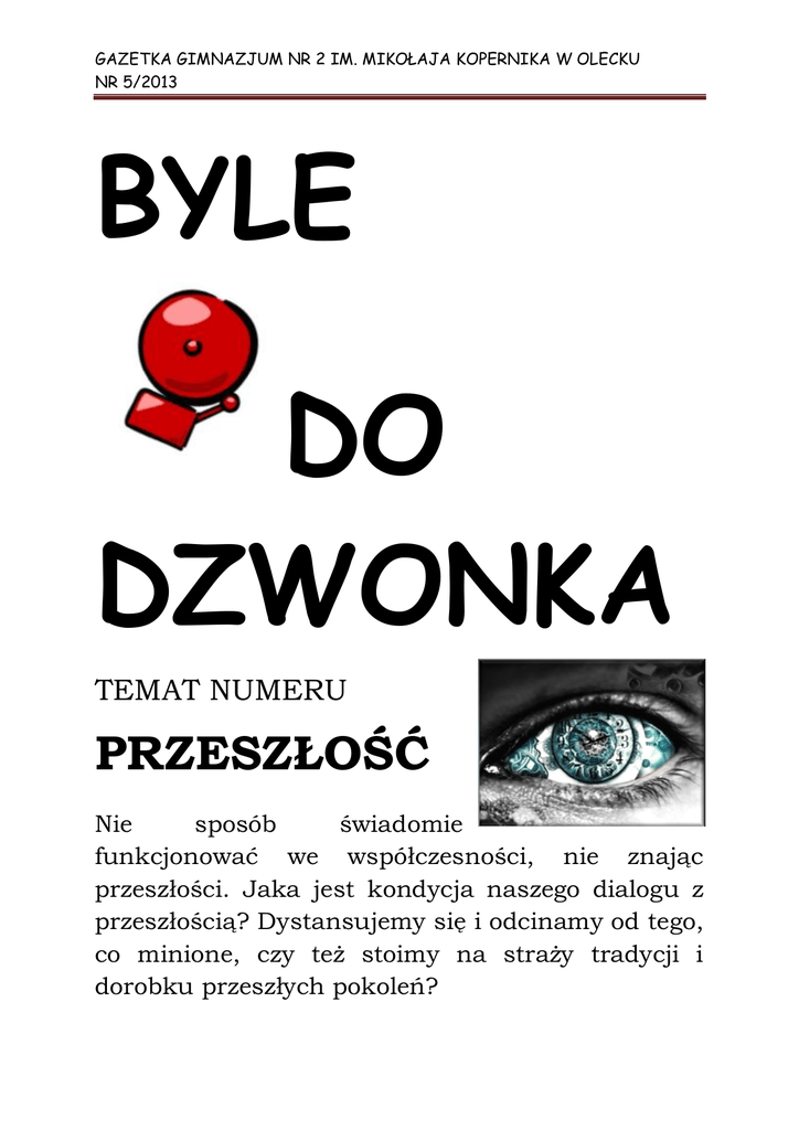 GAZETKA GIMNAZJUM NR 2 IM. MIKOŁAJA KOPERNIKA W OLECKU NR 5/2013 BYLE DO DZWONKA TEMAT NUMERU PRZESZŁOŚĆ Nie sposób świadomie funkcjonować we współczesności, nie znając przeszłości. Jaka jest kondycja naszego dialogu z przeszłością? Dystansujemy się i odcinamy od tego, co minione, czy też stoimy na straży tradycji i dorobku przeszłych pokoleń? GAZETKA GIMNAZJUM NR 2 IM. MIKOŁAJA KOPERNIKA W OLECKU NR 5/2013 Drodzy czytelnicy! Tożsamość miejsca – Jesteśmy o krok od wakacji. Mobilizując siły, by jak najlepiej wykorzystać ostatni miesiąc nauki, pamiętamy jednocześnie o ważnych dla nas datach. Wpisując się w atmosferę obchodów „Dnia Patrona Szkoły”, które przebiegają pod hasłem: „Pielęgnujmy dorobek Wielkiego Astronoma”, oddajemy w wasze ręce piąte wydanie szkolnego pisma, które poświęcone jest relacji łączącej teraźniejszość z przeszłością. rozmowa z Elizą Ptaszyńską, kustoszem Oleckiej Izby Historycznej Po co została stworzona w Olecku Izba Historyczna? Niezmiennie zachęcamy do współpracy wszystkich, pasjonujących się komentowaniem otaczającej nas, inspirującej, niosącej w sobie pamięć o przeszłości rzeczywistości! Miłej lektury życzy Zespół „Byle do Dzwonka”, Nikola Andrelczyk Anita Bagieciel Ania Chodnicka Joasia Cybulska Agata Ćwirko Ania Jackiewicz Magda Jurgielska Angelika Kamińska Justyna Kempisty Maria Motulewicz Monika Matelak Diana Niewiarowska Ania Szwędrys Oliwka Szyłak Marta Turowska Magdalena Nyga opiekun Koła Dziennikarskiego – Izba historyczna została stworzona głównie dlatego, żeby upamiętnić dzieje miasta. Jest to miejsce uniwersalne, symboliczne – żeby historia przetrwała, musimy o niej mówić. Dopóki społeczeństwo nie zmieni stosunku do przeszłości, to nic się w tej kwestii nie poprawi. Cenimy bardzo osoby, które są w stanie przynieść do nas jakiś eksponat lub dawne dokumenty, pamiętniki. Chciałabym, aby ludzie nie wyrzucali starych rzeczy, nie traktowali ich jako nieważnych staroci. Często odcinamy się od przeszłości, myślimy, że to, co się zdarzyło jest już za nami, stawiamy granice, przestajemy pamiętać. Ludzie często używają słów „było, minęło”, a przecież wielka historia to daleka historia. Teraźniejszość przeszłością, a mądrość jest to spójna z umiejętność korzystania z dorobku przeszłych pokoleń, dlatego chcemy kształtować świadomość ludzi, oswajać ich z tym, że mogą tu przychodzić i współtworzyć miejsce, które wpływa na naszą tożsamość. 2 GAZETKA GIMNAZJUM NR 2 IM. MIKOŁAJA KOPERNIKA W OLECKU NR 5/2013 inaczej rozumie słowo „wyjazd”. W czasie wojny Niemcy zmuszali do opuszczenia miasta, ludzie nie mieli wyboru. Dziś, młodzi ludzie coraz częściej wyjeżdżają na stałe z Olecka, nie chcą wracać, ponieważ większe miasto to większe możliwości. A chodzi przecież o to, żeby chętnie stąd wyjeżdżać i chętnie wracać. Trzeba młodym zapewnić warunki rozwoju, natomiast turystom przyjazne – czyste, pachnące dobrą kuchnią miejsca, w których znajdą rozrywkę adekwatną Czy Izbę odwiedza dużo osób? do swoich potrzeb. – Niestety nie, ale mam ogromną nadzieję, że w najbliższym czasie to się zmieni. Najczęściej Czy jest Pani zadowolona ze swojej odwiedzają nas przyjezdni bądź turyści. Bardzo pracy? często goszczą u nas Niemcy, są dociekliwi i chcą powracać do przeszłości, ponieważ byli – To jest bardziej moje hobby niż praca, niezwykle związani z tym miastem. Po 70 latach ponieważ mam też inne źródło dochodu. od zakończenia wojny pamiętają każdą uliczkę, Uważam, że zawód kustosza jest bardzo każdy dom, dzielą się swoimi wspomnieniami, co fascynujący, z perspektywami i rozwijający, a to bardzo nas cieszy. rzadkie cechy pracy. Jedynym minusem jest to, że ciągle musimy zabiegać o gości, nieustannie Czy według Pani ludzie chętnie wracają edukować społeczeństwo, że wiedza na temat do Olecka? przeszłość jest niezwykle cennym i nieodzownym elementem współczesności. – Ja osobiście jako jedyna z moich rówieśników z ławki szkolnej wróciłam tutaj po studiach. Przyciągnęli mnie bliscy, sentymenty, bardzo chciałam kontynuować tradycje rodzinne, Dziękujemy za rozmowę. Angelika Kamińska Nikola Andrelczyk pielęgnować swoje korzenie. Starsze pokolenie 3 GAZETKA GIMNAZJUM NR 2 IM. MIKOŁAJA KOPERNIKA W OLECKU NR 5/2013 sukces w dziedzinie astronomii, mimo braku Czy Mikołaj Kopernik może być akceptacji wzorem dla współczesnej w czasach współczesnych duchownemu. młodzieży? W kolejnych latach patron naszego gimnazjum napisał książkę „O biciu monety”, Każdy z nas powinien mieć osobę, która go inspiruje, autorytet, idola. Czy która zawierała Mikołaj Prawo Kopernika-Geshama Kopernik może być taką postacią dla (pieniądz współczesnych nastolatków? Uważam, że pieniądz lepszy) co oznacza, ten mężczyzna to osoba gorszy wypiera że w efekcie obiegu na rynku naprawdę godna naśladowania. pozostaje głównie ten „mniej Pokazuje nam, że czasami wartościowy” warto się buntować i postawić „bardziej wartościowy” jest coraz mniej Teoria ta pieniądz zagwarantowała a na swoim, mimo różnych dostępny. mu przeciwności. W dzisiejszych czasach zaistnienie w kolejnej dziedzinie – ekonomii. większość nastolatków buntuje się wobec Dzięki swoim osiągnięciom przez wiele lat rodziców, zupełnie jak Kopernik wobec całego widniał na monetach i banknotach złotych świata. Oby i w naszym przypadku infantylny polskich. bunt przerodził się w walkę o siebie i własne przekonania, ponieważ, gdy jesteśmy pracowici i Wielki Astronom odniósł sukces również w pewni swojego stanowiska, tak jak astronom, geometrii, tworząc twierdzenie Kopernika, które możemy osiągnąć upragniony sukces. brzmi następująco: „Jeśli wewnątrz dużego okręgu toczy się bez poślizgu