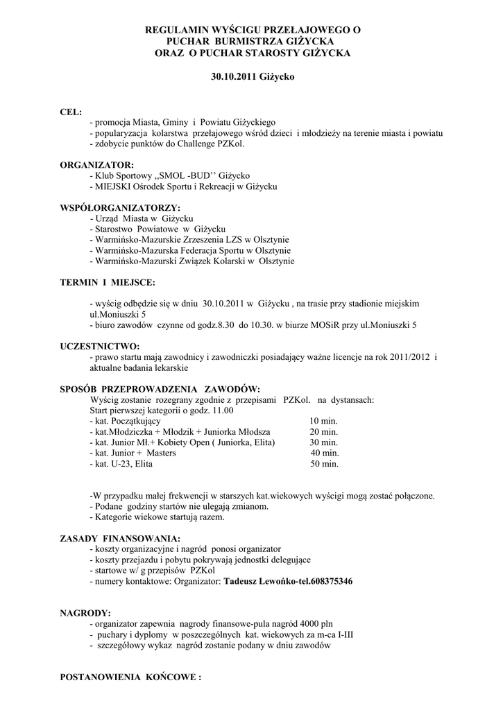 REGULAMIN WYŚCIGU PRZEŁAJOWEGO O PUCHAR BURMISTRZA GIŻYCKA ORAZ O PUCHAR STAROSTY GIŻYCKA 30.10.2011 Giżycko CEL: - promocja Miasta, Gminy i Powiatu Giżyckiego - popularyzacja kolarstwa przełajowego wśród dzieci i młodzieży na terenie miasta i powiatu - zdobycie punktów do Challenge PZKol. ORGANIZATOR: - Klub Sportowy ,,SMOL -BUD’’ Giżycko - MIEJSKI Ośrodek Sportu i Rekreacji w Giżycku WSPÓŁORGANIZATORZY: - Urząd Miasta w Giżycku - Starostwo Powiatowe w Giżycku - Warmińsko-Mazurskie Zrzeszenia LZS w Olsztynie - Warmińsko-Mazurska Federacja Sportu w Olsztynie - Warmińsko-Mazurski Związek Kolarski w Olsztynie TERMIN I MIEJSCE: - wyścig odbędzie się w dniu 30.10.2011 w Giżycku , na trasie przy stadionie miejskim ul.Moniuszki 5 - biuro zawodów czynne od godz.8.30 do 10.30. w biurze MOSiR przy ul.Moniuszki 5 UCZESTNICTWO: - prawo startu mają zawodnicy i zawodniczki posiadający ważne licencje na rok 2011/2012 i aktualne badania lekarskie SPOSÓB PRZEPROWADZENIA ZAWODÓW: Wyścig zostanie rozegrany zgodnie z przepisami PZKol. na dystansach: Start pierwszej kategorii o godz. 11.00 - kat. Początkujący 10 min. - kat.Młodziczka + Młodzik + Juniorka Młodsza 20 min. - kat. Junior Mł.+ Kobiety Open ( Juniorka, Elita) 30 min. - kat. Junior + Masters 40 min. - kat. U-23, Elita 50 min. -W przypadku małej frekwencji w starszych kat.wiekowych wyścigi mogą zostać połączone. - Podane godziny startów nie ulegają zmianom. - Kategorie wiekowe startują razem. ZASADY FINANSOWANIA: - koszty organizacyjne i nagród ponosi organizator - koszty przejazdu i pobytu pokrywają jednostki delegujące - startowe w/ g przepisów PZKol - numery kontaktowe: Organizator: Tadeusz Lewońko-tel.608375346 NAGRODY: - organizator zapewnia nagrody finansowe-pula nagród 4000 pln - puchary i dyplomy w poszczególnych kat. wiekowych za m-ca I-III - szczegółowy wykaz nagród zostanie podany w dniu zawodów POSTANOWIENIA KOŃCOWE : - każdy zawodnik startuje na własną odpowiedzialność - organizator nie bierze odpowiedzialności za rzeczy zagubione i skradzione podczas trwania zawodów - wszyscy zawodnicy powinni być ubezpieczeni przez macierzyste kluby - organizator nie ponosi odpowiedzialności za wypadki powstałe w czasie zawodów - organizator zapewnia opiekę medyczną - skład komisji sędziowskiej wyznaczy organizator wspólnie z zarządem W-MZKol. w Olsztynie - w sprawach sportowych nie objętych niniejszym regulaminem i przepisami PZKol decyduje organizator w porozumieniu z sędzią głównym. -odpowiedzialnym za przeprowadzenie imprez jest Pan Tadeusz Lewońko-tel. 608375346 - dyżur pełni Szpital Miejski w Giżycku ul.Warszawska 41 Tel. 874296666 PROGRAM MINUTOWY: 30.10.2011 r. Godz. 8.30 – 10.30 weryfikacja dokumentów zawodników w biurze zawodów Godz. 11.00 – Start:młodziczka + młodzik + juniorka młodsza Godz. 11.30 - Start: junior młodszy + kobiety open Godz. 12.20 - Start: junior, masters Godz. 13.10 - Start: U-23, elita Godz. 14.15 - dekoracja zawodników wszystkich kategorii ORGANIZATOR: Zarząd Klubu Sportowego,, SMOL-BUD ‘’Giżycko