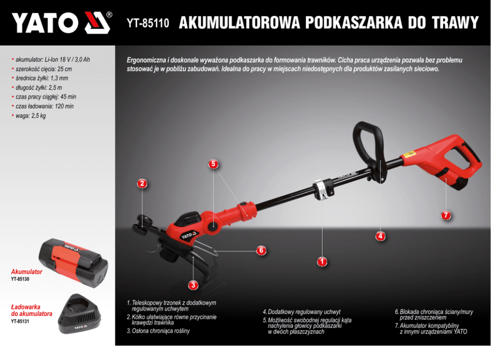 YT-85110 • akumulator: Li-Ion 18 V / 3,0 Ah • szerokość cięcia: 25 cm • średnica żyłki: 1,3 mm • długość żyłki: 2,5 m • czas pracy ciągłej: 45 min • czas ładowania: 120 min • waga: 2,5 kg AKUMULATOROWA PODKASZARKA DO TRAWY Ergonomiczna i doskonale wyważona podkaszarka do formowania trawników. Cicha praca urządzenia pozwala bez problemu stosować je w pobliżu zabudowań. Idealna do pracy w miejscach niedostępnych dla produktów zasilanych sieciowo. 5 2 7 4 6 1 Akumulator YT-85130 Ładowarka do akumulatora YT-85131 3 1.Teleskopowy trzonek z dodatkowym regulowanym uchwytem 2.Kółko ułatwiające równe przycinanie krawędzi trawnika 3.Osłona chroniąca rośliny 4.Dodatkowy regulowany uchwyt 5.Możliwość swobodnej regulacji kąta nachylenia głowicy podkaszarki w dwóch płaszczyznach 6.Blokada chroniąca ściany/mury przed zniszczeniem 7.Akumulator kompatybilny z innymi urządzeniami YATO