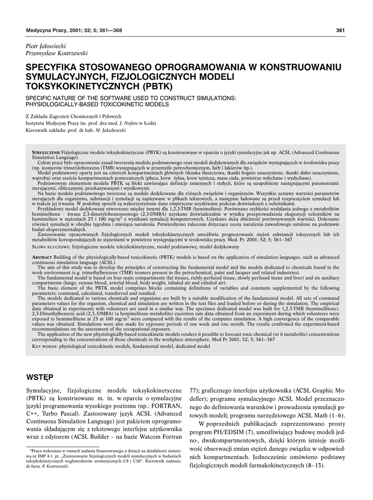 Medycyna Pracy, 2001; 52; 5; 361—368 361 Piotr Jałowiecki Przemysław Kostrzewski SPECYFIKA STOSOWANEGO OPROGRAMOWANIA W KONSTRUOWANIU SYMULACYJNYCH, FIZJOLOGICZNYCH MODELI TOKSYKOKINETYCZNYCH (PBTK) SPECIFIC NATURE OF THE SOFTWARE USED TO CONSTRUCT SIMULATIONS: PHYSIOLOGICALLY-BASED TOXICOKINETIC MODELS Z Zakładu Zagrożeń Chemicznych i Pyłowych Instytutu Medycyny Pracy im. prof. dra med. J. Nofera w Łodzi Kierownik zakładu: prof. dr hab. M. Jakubowski STRESZCZENIE Fizjologiczne modele toksykokinetyczne (PBTK) są konstruowane w oparciu o języki symulacyjne jak np. ACSL (Advanced Continuous Simulation Language). Celem pracy było opracowanie zasad tworzenia modelu podstawowego oraz modeli dedykowanych dla związków występujących w środowisku pracy (np. izomerów trimetylobenzenu (TMB) występujących w przemyśle petrochemicznym, farb i lakierów itp.). Model podstawowy oparty jest na czterech kompartmentach głównych (tkanka tłuszczowa, tkanki bogato unaczynione, tkanki słabo unaczynione, wątroba) oraz sześciu kompartmentach pomocniczych (płuca, krew żylna, krew tętnicza, masa ciała, powietrze wdychane i wydychane). Podstawowym elementem modelu PBTK są bloki zawierające definicje zmiennych i stałych, które są uzupełnione następującymi parametrami: sterującymi, obliczanymi, przekazywanymi i wynikowymi. Na bazie modelu podstawowego tworzone są modele dedykowane dla różnych związków i organizmów. Wszystkie zestawy wartości parametrów sterujących dla organizmu, substancji i symulacji są zapisywane w plikach tekstowych, a następnie ładowane są przed rozpoczęciem symulacji lub w trakcie jej trwania. W podobny sposób są wykorzystywane dane empiryczne uzyskiwane podczas doświadczeń z ochotnikami. Przykładowy model dedykowany utworzono między innymi dla 1,2,3-TMB (hemimeliten). Porównano szybkości wydalania jednego z metabolitów hemimelitenu – kwasu 2,3-dimetylobenzoesowego (2,3-DMBA) uzyskane doświadczalnie w wyniku przeprowadzenia ekspozycji ochotników na hemimeliten w stężeniach 25 i 100 mg/m3 z wynikami symulacji komputerowych. Uzyskano dużą zbieżność porównywanych wartości. Dokonano również symulacji w obrębie tygodnia i miesiąca narażenia. Potwierdzono zalecenia dotyczące oceny narażenia zawodowego ustalone na podstawie badań eksperymentalnych. Zastosowanie opracowanych fizjologicznych modeli toksykokinetycznych umożliwia prognozowanie stężeń substancji toksycznych lub ich metabolitów korespondujących ze stężeniami w powietrzu występującymi w środowisku pracy. Med. Pr. 2001; 52; 5; 361—367 Słowa kluczowe: fizjologiczne modele toksykokinetyczne, model podstawowy, model dedykowany ABSTRACT Building of the physiologically-based toxicokinetic (PBTK) models is based on the application of simulation languages, such as advanced continuous simulation language (ACSL). The aim of this study was to develop the principles of constructing the fundamental model and the models dedicated to chemicals found in the work environment (e.g. trimethylbenzene (TMB) isomers present in the petrochemical, paint and lacquer and related industries). The fundamental model is based on four main compartments (fat tissues, richly perfused tissue, slowly perfused tissue and liver) and six auxiliary compartments (lungs, venous blood, arterial blood, body weight, inhaled air and exhaled air). The basic element of the PBTK model comprises blocks containing definitions of variables and constants supplemented by the following parameters: command, calculated, transferred and resulted. The models dedicated to various chemicals and organisms are built by a suitable modification of the fundamental model. All sets of command parameters values for the organism, chemical and simulation are written in the text files and loaded before or during the simulation. The empirical data obtained in experiments with volunteers are used in a similar way. The specimen dedicated model was built for 1,2,3-TMB (hemimellitene). 2,3-Dimethylbenzoic acid (2,3,-DMBA) (a hemimelitene metabolite) excretion rate data obtained from an experiment during which volunteers were exposed to hemimellitene at 25 at 100 mg/m3 were compared with the results of the computer simulation. A high convergence of the comparable values was obtained. Simulations were also made for exposure periods of one week and one month. The results confirmed the experiment-based recommendations on the assessment of the occupational exposure. The application of the new physiologically-based toxicokinetic models renders it possible to forecast toxic chemical (or it metabolite) concentrations corresponding to the concentrations of those chemicals in the workplace atmosphere. Med Pr 2001; 52; 5; 361—367 Key words: physiological toxicokinetic models, fundamental model, dedicated model WSTÊP Symulacyjne, fizjologiczne modele toksykokinetyczne (PBTK) są konstruowane m. in. w oparciu o symulacyjne języki programowania wysokiego poziomu (np.: FORTRAN, C++, Turbo Pascal). Zastosowany język ACSL (Advanced Continuous Simulation Language) jest pakietem oprogramowania składającym się z tekstowego interfejsu użytkownika wraz z edytorem (ACSL Builder – na bazie Watcom Fortran *Praca wykonana w ramach zadania finansowanego z dotacji na działalność statutową nr IMP 4.1. pt. „Zastosowanie fizjologicznych modeli symulacyjnych w badaniach toksykokinetycznych węglowodorów aromatycznych C9 i C10”. Kierownik zadania: dr farm. P. Kostrzewski. 77); graficznego interfejsu użytkownika (ACSL Graphic Modeller); programu symulacyjnego ACSL Model przeznaczonego do definiowania warunków i prowadzenia symulacji gotowych modeli; programu narzędziowego ACSL Math (1–6). W poprzednich publikacjach zaprezentowano prosty program PH/EDSIM (7), umożliwiający budowę modeli jedno-, dwukompartmentowych, dzięki którym istnieje możliwość obserwacji zmian stężeń danego związku w odpowiednich kompartmentach. J