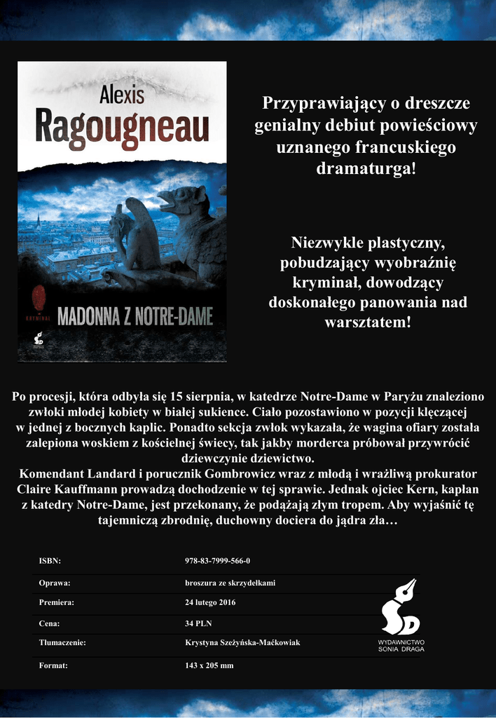 Przyprawiający o dreszcze genialny debiut powieściowy uznanego francuskiego dramaturga! Niezwykle plastyczny, pobudzający wyobraźnię kryminał, dowodzący doskonałego panowania nad warsztatem! Po procesji, która odbyła się 15 sierpnia, w katedrze Notre-Dame w Paryżu znaleziono zwłoki młodej kobiety w białej sukience. Ciało pozostawiono w pozycji klęczącej w jednej z bocznych kaplic. Ponadto sekcja zwłok wykazała, że wagina ofiary została zalepiona woskiem z kościelnej świecy, tak jakby morderca próbował przywrócić dziewczynie dziewictwo. Komendant Landard i porucznik Gombrowicz wraz z młodą i wrażliwą prokurator Claire Kauffmann prowadzą dochodzenie w tej sprawie. Jednak ojciec Kern, kapłan z katedry Notre-Dame, jest przekonany, że podążają złym tropem. Aby wyjaśnić tę tajemniczą zbrodnię, duchowny dociera do jądra zła… ISBN: 978-83-7999-566-0 Oprawa: broszura ze skrzydełkami Premiera: 24 lutego 2016 Cena: 34 PLN Tłumaczenie: Krystyna Szeżyńska-Maćkowiak Format: 143 x 205 mm Alexis Ragougneau jest dramaturgiem. Madonna z Notre-Dame to jego powieściowy debiut. Przez kilka miesięcy pracował w katedrze Notre-Dame, co pozwoliło mu poznać mentalność ludzi systematycznie ją odwiedzających. Francuska prasa o książce „Powieść kryminalna, która nie trzyma się sztywno reguł gatunku. [...] Jej oryginalność wzbudza zainteresowanie. Autor po mistrzowsku zaciera ślady, myli tropy, kreuje bohaterów z krwi i kości, a jego opowieść jest wciągająca i pełna swoistego czaru. [...] Tę książkę trzeba przeczytać, ponieważ Alexis Ragougneau dowiódł swojego wielkiego talentu i jako autor kryminałów, i jako pisarz”. Jean-Louis Debré, Le Point „Śledztwo odkrywa bolesną przeszłość bohaterów, zrzuca z ich twarzy maski, odrzuca pozory, rozprasza mroki, by ukazać prawdę w pełnym świetle. Subtelne poczucie humoru podkreśla celność stylu. Jedna z tych wyjątkowych powieści kryminalnych, do jakich przyzwyczaiła nas seria Viviane Hamy”. Christine Ferniot, Cercle Polar – Télérama „Alexis Ragougneau po mistrzowsku prowadzi śledztwo, ale przede wszystkim kreuje grupę postaci niejako symbolicznych, prawdziwych, wyrazistych, radzących sobie jak mogą z własną przeszłością i ułomnościami”. Librairie Vaux Livres „W swej pierwszej powieści Alexis Ragougneau, autor wielu sztuk teatralnych, posługuje się plastycznym, żywym językiem, który nabiera mocy, zwłaszcza gdy przemawiają bohaterowie”. Librairie Des Cordeliers „Niezwykły talent! […]Alexis Ragougneau odważnie wybrał paryską katedrę Notre-Dame na teatr zbrodni i miejsce, w którym rozgrywa się intryga kryminalna. […] Jej zadziwiający bieg do ostatnich chwil trzyma czytelnika w napięciu. […] Możliwe, że francuska powieść kryminalna ma nowego króla”. Bernard Lehut Sonia Draga Sp. z o.o., Pl. Grunwaldzki 8-10, 40-127 Katowice, Tel.: 32 7826477, 7826037, Fax: 032 2537728 Dział handlowy: Danuta Czarnowska, Tel.: 693420384, [email protected] Promocja: Agnieszka Jedlińska, Tel.: 695672067, [email protected] Redakcja: [email protected]