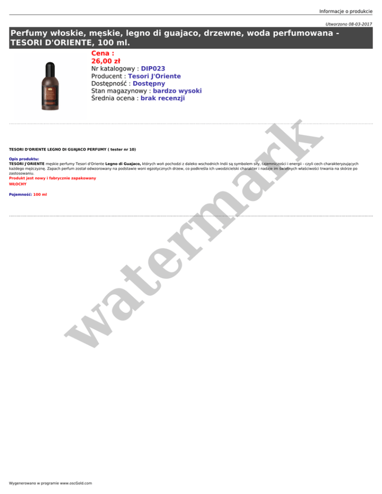 Informacje o produkcie Utworzono 08-03-2017 Perfumy włoskie, męskie, legno di guajaco, drzewne, woda perfumowana TESORI D'ORIENTE, 100 ml. Cena : 26,00 zł er m ar k Nr katalogowy : DIP023 Producent : Tesori J'Oriente Dostępność : Dostępny Stan magazynowy : bardzo wysoki Średnia ocena : brak recenzji TESORI D'ORIENTE LEGNO DI GUAJACO PERFUMY ( tester nr 10) Opis produktu: TESORI J'ORIENTE męskie perfumy Tesori d'Oriente Legno di Guajaco, których woń pochodzi z daleko wschodnich Indii są symbolem siły, tajemniczości i energii - czyli cech charakteryzujących każdego mężczyznę. Zapach perfum został odwzorowany na podstawie woni egzotycznych drzew, co podkreśla ich uwodzicielski charakter i nadaje im świetnych właściwości trwania na skórze po zastosowaniu. Produkt jest nowy i fabrycznie zapakowany WŁOCHY w at Pojemność: 100 ml Wygenerowano w programie www.oscGold.com