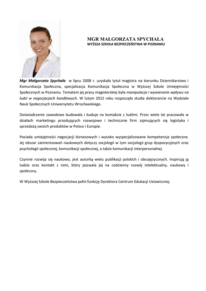 MGR MAŁGORZATA SPYCHAŁA WYŻSZA SZKOŁA BEZPIECZEŃSTWA W POZNANIU Mgr Małgorzata Spychała w lipcu 2008 r. uzyskała tytuł magistra na kierunku Dziennikarstwo i Komunikacja Społeczna, specjalizacja Komunikacja Społeczna w Wyższej Szkole Umiejętności Społecznych w Poznaniu. Tematem jej pracy magisterskiej była manipulacja i wywieranie wpływu na ludzi w negocjacjach handlowych. W lutym 2012 roku rozpoczęła studia doktorancie na Wydziale Nauk Społecznych Uniwersytetu Wrocławskiego. Doświadczenie zawodowe budowała i buduje na kontakcie z ludźmi. Przez wiele lat pracowała w działach marketingu przodujących rozwojowo i technicznie firm zajmujących się logistyka i sprzedażą swoich produktów w Polsce i Europie. Posiada umiejętności negocjacji biznesowych i wysoko wyspecjalizowane kompetencje społeczne. Jej obszar zainteresowań naukowych dotyczy socjologii w tym socjologii grup dyspozycyjnych oraz psychologii społecznej, komunikacji społecznej, a także komunikacji interpersonalnej. Czynnie rozwija się naukowo, jest autorką wielu publikacji polskich i obcojęzycznych. Inspirują ją ludzie oraz kontakt z nimi, który pozwala jej na codzienny rozwój intelektualny, naukowy i społeczny. W Wyższej Szkole Bezpieczeństwa pełni funkcję Dyrektora Centrum Edukacji Ustawicznej.