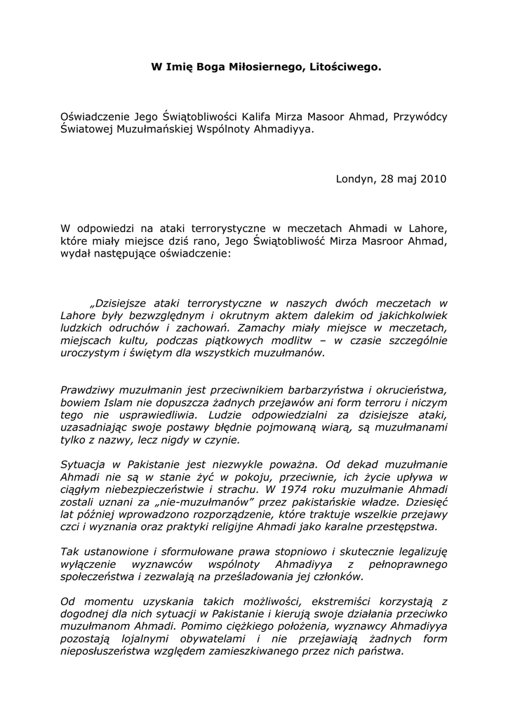 W Imię Boga Miłosiernego, Litościwego. Oświadczenie Jego Świątobliwości Kalifa Mirza Masoor Ahmad, Przywódcy Światowej Muzułmańskiej Wspólnoty Ahmadiyya. Londyn, 28 maj 2010 W odpowiedzi na ataki terrorystyczne w meczetach Ahmadi w Lahore, które miały miejsce dziś rano, Jego Świątobliwość Mirza Masroor Ahmad, wydał następujące oświadczenie: „Dzisiejsze ataki terrorystyczne w naszych dwóch meczetach w Lahore były bezwzględnym i okrutnym aktem dalekim od jakichkolwiek ludzkich odruchów i zachowań. Zamachy miały miejsce w meczetach, miejscach kultu, podczas piątkowych modlitw – w czasie szczególnie uroczystym i świętym dla wszystkich muzułmanów. Prawdziwy muzułmanin jest przeciwnikiem barbarzyństwa i okrucieństwa, bowiem Islam nie dopuszcza Ŝadnych przejawów ani form terroru i niczym tego nie usprawiedliwia. Ludzie odpowiedzialni za dzisiejsze ataki, uzasadniając swoje postawy błędnie pojmowaną wiarą, są muzułmanami tylko z nazwy, lecz nigdy w czynie. Sytuacja w Pakistanie jest niezwykle powaŜna. Od dekad muzułmanie Ahmadi nie są w stanie Ŝyć w pokoju, przeciwnie, ich Ŝycie upływa w ciągłym niebezpieczeństwie i strachu. W 1974 roku muzułmanie Ahmadi zostali uznani za „nie-muzułmanów” przez pakistańskie władze. Dziesięć lat później wprowadzono rozporządzenie, które traktuje wszelkie przejawy czci i wyznania oraz praktyki religijne Ahmadi jako karalne przestępstwa. Tak ustanowione i sformułowane prawa stopniowo i skutecznie legalizuję wyłączenie wyznawców wspólnoty Ahmadiyya z pełnoprawnego społeczeństwa i zezwalają na prześladowania jej członków. Od momentu uzyskania takich moŜliwości, ekstremiści korzystają z dogodnej dla nich sytuacji w Pakistanie i kierują swoje działania przeciwko muzułmanom Ahmadi. Pomimo cięŜkiego połoŜenia, wyznawcy Ahmadiyya pozostają lojalnymi obywatelami i nie przejawiają Ŝadnych form nieposłuszeństwa względem zamieszkiwanego przez nich państwa. Na tę chwilę nie znamy jeszcze wszystkich szczegółów tragedii. Jest jednak wiadomym, Ŝe wielu muzułmanów Ahmadi zostało zabitych, a wielu innych jest cięŜko rannych. Modlę się by Bóg obdarzył wielką cierpliwością pogrąŜone w smutku rodziny ofiar dzisiejszych zamachów oraz by umoŜliwił doświadczenie raju zamordowanym. Niech Bóg przywróci do zdrowia tych, którzy zostali ranni w zamachach. Muzułmańska Wspólnota Ahmadiyya jest kochającym pokój, prawdziwym religijnym ruchem wyznaniowym w Islamie. Tak, więc, nie będzie Ŝadnej niewłaściwej reakcji ze strony jej wyznawców. Nasze zbawienie leŜy w naszych błaganiach do Boga Wszechmogącego, który tak samo jak było dotychczas, w tej sytuacji równieŜ nas nie opuści. śaden terror i Ŝadne rządowe rozporządzenia nie są w stanie zatrzymać rozwoju naszej Wspólnoty, poniewaŜ Ahmadiyya jest ustanowioną przez Boga i przez Niego kierowaną organizacją. Niech Bóg ma w swojej opiece wszystkich ludzi dobrej woli i chroni ich przez złem tych, którzy sprzeciwiają się pokojowi.”
