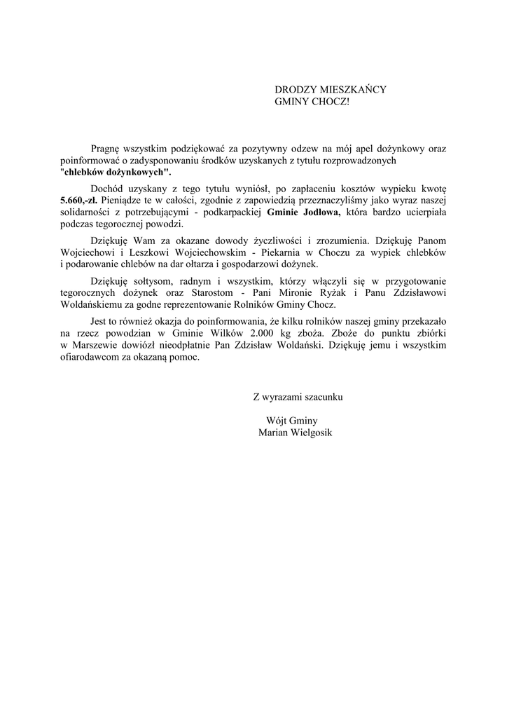 DRODZY MIESZKAŃCY GMINY CHOCZ! Pragnę wszystkim podziękować za pozytywny odzew na mój apel dożynkowy oraz poinformować o zadysponowaniu środków uzyskanych z tytułu rozprowadzonych "chlebków dożynkowych". Dochód uzyskany z tego tytułu wyniósł, po zapłaceniu kosztów wypieku kwotę 5.660,-zł. Pieniądze te w całości, zgodnie z zapowiedzią przeznaczyliśmy jako wyraz naszej solidarności z potrzebującymi - podkarpackiej Gminie Jodłowa, która bardzo ucierpiała podczas tegorocznej powodzi. Dziękuję Wam za okazane dowody życzliwości i zrozumienia. Dziękuję Panom Wojciechowi i Leszkowi Wojciechowskim - Piekarnia w Choczu za wypiek chlebków i podarowanie chlebów na dar ołtarza i gospodarzowi dożynek. Dziękuję sołtysom, radnym i wszystkim, którzy włączyli się w przygotowanie tegorocznych dożynek oraz Starostom - Pani Mironie Ryżak i Panu Zdzisławowi Woldańskiemu za godne reprezentowanie Rolników Gminy Chocz. Jest to również okazja do poinformowania, że kilku rolników naszej gminy przekazało na rzecz powodzian w Gminie Wilków 2.000 kg zboża. Zboże do punktu zbiórki w Marszewie dowiózł nieodpłatnie Pan Zdzisław Woldański. Dziękuję jemu i wszystkim ofiarodawcom za okazaną pomoc. Z wyrazami szacunku Wójt Gminy Marian Wielgosik