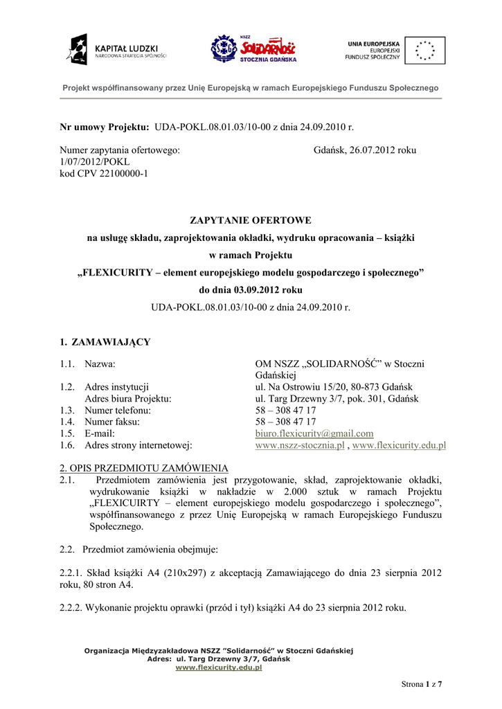 Projekt współfinansowany przez Unię Europejską w ramach Europejskiego Funduszu Społecznego Nr umowy Projektu: UDA-POKL.08.01.03/10-00 z dnia 24.09.2010 r. Gdańsk, 26.07.2012 roku Numer zapytania ofertowego: 1/07/2012/POKL kod CPV 22100000-1 ZAPYTANIE OFERTOWE na usługę składu, zaprojektowania okładki, wydruku opracowania – książki w ramach Projektu „FLEXICURITY – element europejskiego modelu gospodarczego i społecznego” do dnia 03.09.2012 roku UDA-POKL.08.01.03/10-00 z dnia 24.09.2010 r. 1. ZAMAWIAJĄCY 1.1. Nazwa: 1.2. Adres instytucji Adres biura Projektu: 1.3. Numer telefonu: 1.4. Numer faksu: 1.5. E-mail: 1.6. Adres strony internetowej: OM NSZZ „SOLIDARNOŚĆ” w Stoczni Gdańskiej ul. Na Ostrowiu 15/20, 80-873 Gdańsk ul. Targ Drzewny 3/7, pok. 301, Gdańsk 58 – 308 47 17 58 – 308 47 17 [email protected] www.nszz-stocznia.pl , www.flexicurity.edu.pl 2. OPIS PRZEDMIOTU ZAMÓWIENIA 2.1. Przedmiotem zamówienia jest przygotowanie, skład, zaprojektowanie okładki, wydrukowanie książki w nakładzie w 2.000 sztuk w ramach Projektu „FLEXICUIRTY – element europejskiego modelu gospodarczego i społecznego”, współfinansowanego z przez Unię Europejską w ramach Europejskiego Funduszu Społecznego. 2.2. Przedmiot zamówienia obejmuje: 2.2.1. Skład książki A4 (210x297) z akceptacją Zamawiającego do dnia 23 sierpnia 2012 roku, 80 stron A4. 2.2.2. Wykonanie projektu oprawki (przód i tył) książki A4 do 23 sierpnia 2012 roku. Organizacja Międzyzakładowa NSZZ ”Solidarność” w Stoczni Gdańskiej Adres: ul. Targ Drzewny 3/7, Gdańsk www.flexicurity.edu.pl Strona 1 z 7 Projekt współfinansowany przez Unię Europejską w ramach Europejskiego Funduszu Społecznego 2.2.3. Papier druku wkładu kreda gramatura papieru 90g, okładki kreda gramatura papieru 350g. 2.2.4. Zadruk wkładu i okładki 4+4. 2.2.5. Uszlachetnienie – zadruk okładki: lakier UV punktowy, lakier dyspersyjny, folia błysk lub mat, tłoczenia, hot stamping. 2.2.6. Wydrukowanie 2.000 sztuk książki format A4 (210x297) i dostarczenie do biura Projektu Zamawiającego do dnia 03.09.2012 roku. WARUNKI UDZIAŁU WYKONAWCÓW W POSTĘPOWANIU. SPOSÓB DOKONYWANIA OCENY SPEŁNIENIA TYCH WARUNKÓW. 2.3. 3. O udzielenie zamówienia mogą ubiegać się Wykonawcy, którzy: 3.1.posiadają uprawnienia do wykonywania określonej działalności lub czynności, jeżeli ustawy nakładają obowiązek posiadania takich uprawnień, 3.2.posiadają niezbędny potencjał techniczny do wykonania przedmiotu zamówienia, 3.3.znajdują się w sytuacji ekonomicznej i finansowej zapewniającej wykonanie przedmiotu zamówienia, 3.4.nie podlegają wykluczeniu z postępowania Z niniejszego postępowania wyklucza się: a) Zamawiający nie może udzielać zamówienia podmiotom powiązanym z nim osobowo lub kapitałowo. Przez powiązania kapitałowe lub osobowe rozumie się wzajemne powiązania między Zamawiającym lub osobami upoważnionymi do zaciągania zobowiązań w imieniu Zamawiającego lub osobami wykonującymi w imieniu Zamawiającego czynności związane z przygotowaniem i przeprowadzeniem procedury wyboru wykonawcy a wykonawcą, polegające w szczególności na: - uczestniczeniu w spółce, jako wspólnik spółki cywilnej lub spółki osobowej; - posiadaniu, co najmniej 10 % udziałów lub akcji; - pełnieniu funkcji członka organu nadzorczego lub zarządzającego, prokurenta, pełnomocnika; - pozostawaniu w związku małżeńskim, w stosunku pokrewieństwa lub powinowactwa w linii prostej, pokrewieństwa lub powinowactwa w linii bocznej do drugiego stopnia lub w stosunku przysposobienia, opieki lub kurateli. b) wykonawców, w stosunku do których otwarto likwidację lub których upadłość ogłoszono, c) osoby fizyczne, które prawomocnie skazano za przestępstwo popełnione w związku z postępowaniem o udzielenie zamówienia, przestępstwo przekupstwa, przestępstwo Organizacja Międzyzakładowa NSZZ ”Solidarność” w Stoczni Gdańskiej Adres: ul. Targ Drzewny 3/7, Gdańsk www.flexicurity.edu.pl Strona 2 z 7 Projekt współfinansowany przez Unię Europejską w ramach Europejskiego Funduszu Społecznego przeciwko obrotowi gospodarczemu lub inne przestępstwo popełnione w celu osiągnięcia korzyści majątkowych, d) spółki jawne, których wspólnika prawomocnie skazano za przestępstwo popełnione w związku z postępowaniem o udzielenie zamówienia, przestępstwo przekupstwa, przestępstwo przeciwko obrotowi gospodarczemu lub inne przestępstwo popełnione w celu osiągnięcia korzyści majątkowych, e) spółki partnerskie, których partnera lub członka zarządu prawomocnie skazano za przestępstwo popełnione w związku z postępowaniem o udzielenie zamówienia, przestępstwo przekupstwa, przestępstwo przeciwko obrotowi gospodarczemu lub inne przestępstwo popełnione w celu osiągnięcia korzyści majątkowych, f) spółki komandytowe oraz spółki komandytowo-akcyjne, których komplementariusza prawomocnie skazano za przestępstwo popełnione w związku z postępowaniem o udzielenie zamówienia, przestępstwo przekupstwa, przestępstwo przeciwko obrotowi gospodarczemu lub inne przestępstwo popełnione w celu osiągnięcia korzyści majątkowych, g) osoby prawne, których urzędującego członka organu zarządzającego prawomocnie skazano za przestępstwo popełnione w związku z postępowaniem o udzielenie zamówienia, przestępstwo przekupstwa, przestępstwo przeciwko obrotowi gospodarczemu lub inne przestępstwo popełnione w celu osiągnięcia korzyści majątkowych, h) Wykonawców, którzy nie spełniają warunków udziału w postępowaniu, i) Wykonawców, którzy złożyli nieprawdziwe informacje mające wpływ na wynik prowadzonego postępowania, j) Wykonawców, którzy nie złożyli oświadczenia o spełnieniu warunków udziału w postępowaniu lub dokumentów potwierdzających spełnienie tych warunków. Ocena spełnienia warunków – zgodnie z formułą spełnia-nie spełnia - 