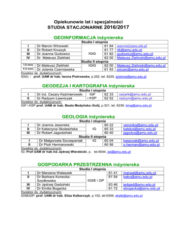 Opiekunowie lat i specjalności STUDIA STACJONARNE 2016/2017 GEOINFORMACJA inżynierska I II III IV I (3 sem) II (3 sem) Dr Marcin Winowski Dr Robert Kruszyk Dr Joanna Gudowicz Dr Mateusz Zieliński Dr Mateusz Zieliński Dr Jolanta Czerniawska Studia I stopnia 61 84 61 77 IGiG 61 82 62 00 Studia II stopnia IGIG 62 00 61 93 [email protected] [email protected] [email protected] [email protected] [email protected] [email protected] Dyrektor ds. dydaktycznych: IGiG: : prof. UAM dr hab. Iwona Piotrowska, p.252, tel. 6225, [email protected] GEODEZJA I KARTOGRAFIA inżynierska I II Studia I stopnia Dr inż. Cezary Kaźmierowski IGF 62 33 i KSP Dr Radzym Ławniczak 62 52 [email protected] [email protected] Dyrektor ds. dydaktycznych: IGF i KSP prof. UAM dr hab. Beata Medyńska–Gulij, p.321, tel. 6239, [email protected] GEOLOGIA inżynierska I II III I II Studia I stopnia Dr Joanna Jaworska 60 22 IG Dr Katarzyna Skolasińska 60 33 Dr Robert Jagodziński 60 40 Studia II stopnia Dr Małgorzata Szczepaniak IG 60 04 Dr Piotr Hermanowski 60 56 [email protected] [email protected] [email protected] [email protected] [email protected] Dyrektor ds. dydaktycznych: IG: Prof UAM dr hab inż Jędrzej Wierzbicki, p. tel.6044, [email protected] GOSPODARKA PRZESTRZENNA inżynierska Studia I stopnia I II III IV Dr Marzena Walaszek Dr Barbara KoneckaSzydłowska Dr Jędrzej Gadziński Dr Emilia Bogacka 61 41 61 54 [email protected] [email protected] 63 46 61 72 [email protected] [email protected] IGSE i GP Dyrektor ds. dydaktycznych: IGSEiGP: prof. UAM dr hab. Eliza Kalbarczyk, p.152, tel 6309, [email protected] GEOGRAFIA I II III I II Dr Henryk Maćkowiak Dr Bartosz Czernecki Dr Magdalena RatajczakSzczerba Dr Artur Bajerski Dr Damian Łowicki Studia I stopnia IGSEiGP 63 25 IGF i KSP 62 70 IGiG 62 07 [email protected] [email protected] [email protected] Studia II stopnia IGSEiGP 61 71 IGF i KSP 62 27 [email protected] [email protected] Dyrektorzy ds. dydaktycznych: IGiG: prof. UAM dr hab. Iwona Piotrowska, p.252, tel. 6225, [email protected] IGFiKŚP: prof. UAM dr hab. Beata Medyńska–Gulij, p.321, tel. 6239, [email protected] IGSEiGP: prof. UAM dr hab. Eliza Kalbarczyk, p.152, tel 6309, [email protected] GEOGRAFIA-specjalność: EKOLOGIA MIAST I II III Studia I stopnia Prof. UAM dr hab. Iwona 61 99 Hildebrandt-Radke IGiG Dr Michał Woszczyk 61 94 Dr Monika Rzodkiewicz 61 95 [email protected] [email protected] [email protected] Dyrektor ds. dydaktycznych: IGiG: prof. UAM dr hab. Iwona Piotrowska, p.252, tel. 6225, [email protected] GEOGRAFIA-specjalność: GEOINFORMACJA I II III I II Studia I stopnia 60 44 IGiG 62 11 61 78 Studia II stopnia Dr Beata Janczak-Kostecka 61 98 Prof. UAM dr hab. Maciej IGiG 61 86 Dr Michał Jakubowicz Dr Piotr Kołaczek Dr Jakub Małecki [email protected] [email protected] [email protected] [email protected] [email protected] Major Dyrektor ds. dydaktycznych: IGiG: prof. UAM dr hab. Iwona Piotrowska, p.252, tel. 6225, [email protected] GEOGRAFIA-specjalność: HMiK I II III I II Studia I stopnia Dr Mariusz Ptak 62 55 IGF i KSP 62 63 Dr Katarzyna Szyga-Pluta Dr Monika Okońska 62 53 Studia II stopnia Dr Marek Półrolniczak IGF i KSP 62 65 Dr Filip Wolny 63 28 [email protected] [email protected] [email protected] [email protected] [email protected] Dyrektor ds. dydaktycznych: IGFiKŚP: prof. UAM dr hab. Beata Medyńska–Gulij, p.321, tel. 6239, [email protected] GEOGRAFIA-specjalność:geoanaliza społeczno-ekonomiczna I Dr Beata Łodyga Studia I stopnia IGSEiGP 61 41 [email protected] Dyrektor ds. dydaktycznych: IGSEiGP: prof. UAM dr hab. Eliza Kalbarczyk, p.152, tel 6309, [email protected] ZARZĄDZANIE ŚRODOWISKIEM I II III I II Studia I stopnia Dr Małgorzata Stępniewska IGF 62 26 [email protected] i KSP Dr Sylwia Bródka 62 40 [email protected] Dr Marta Kubacka 62 43 [email protected] Studia II stopnia Dr Iwona Zwierzchowska IGF 62 37 [email protected] i KSP Dr Jarosław Kubiak 62 50 [email protected] Dyrektor ds. dydaktycznych: IGFiKŚP: prof. UAM dr hab. Beata Medyńska–Gulij, p.321, tel. 6239, [email protected] GOSPODARKA PRZESTRZENNA I II III Dr Radosław Bul Dr Małgorzata Polna Mgr inż. Anna Siniecka Studia I stopnia IGSE i GP 6144 61 63 61 43 [email protected] [email protected] [email protected] 61 56 63 46 61 52 61 67 [email protected] [email protected] [email protected] [email protected] Studia II stopnia I II I (3 sem) II(3 sem) Dr Joanna Dominiak Dr Robert Kudłak Dr Bogusz Modrzewski Dr Ewa Kacprzak IGSE i GP Dyrektor ds. dydaktycznych: IGSEiGP: prof. UAM dr hab. Eliza Kalbarczyk, p.152, tel 6309, [email protected] TURYSTYKA i REKREACJA Poznań, Piła I II III Dr Adam Marciniak Dr Dorota Matuszewska Dr Anna Przybylska I II Dr Krzysztof Piotrowski Dr Anna Przybylska Studia I stopnia KTiR 61 29 KTiR 63 11 KTiR 61 29 Studia II stopnia KTiR 62 22 KTiR 61 29 [email protected] [email protected] [email protected] [email protected] [email protected] Kierownik KTiR: prof. dr hab. Zygmunt Młynarczyk, L-311, tel. 6218, [email protected] GOSPODARKA WODNA Piła I II III Dr Szymon Łukasiewicz Dr Paweł Owsianny Dr Anna Szczucińska I Dr Grażyna Głosińska Studia I stopnia OZ Piła 34 65 [email protected] IGiG 34 55 [email protected] IGFiKŚP 63 34 [email protected] Studia II stopnia 957592423 OZ Piła [email protected] Dyrektor ds. dydaktycznych: IGFiKŚP: prof. UAM dr hab. Beata Medyńska–Gulij, p.321, tel. 6239, [email protected] IGiG: prof. UAM dr hab. Iwona Piotrowska, p.252, tel. 6225, [email protected] PRODZIEKAN ds. studiów stacjonarnych: prof. UAM dr hab. Andrzej Macias p.322, tel.6241, pok. 010C Tel. 6114, [email protected]