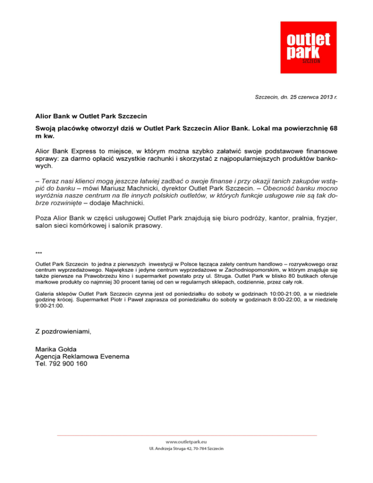 Szczecin, dn. 25 czerwca 2013 r. Alior Bank w Outlet Park Szczecin Swoją placówkę otworzył dziś w Outlet Park Szczecin Alior Bank. Lokal ma powierzchnię 68 m kw. Alior Bank Express to miejsce, w którym można szybko załatwić swoje podstawowe finansowe sprawy: za darmo opłacić wszystkie rachunki i skorzystać z najpopularniejszych produktów bankowych. – Teraz nasi klienci mogą jeszcze łatwiej zadbać o swoje finanse i przy okazji tanich zakupów wstąpić do banku – mówi Mariusz Machnicki, dyrektor Outlet Park Szczecin. – Obecność banku mocno wyróżnia nasze centrum na tle innych polskich outletów, w których funkcje usługowe nie są tak dobrze rozwinięte – dodaje Machnicki. Poza Alior Bank w części usługowej Outlet Park znajdują się biuro podróży, kantor, pralnia, fryzjer, salon sieci komórkowej i salonik prasowy. *** Outlet Park Szczecin to jedna z pierwszych inwestycji w Polsce łącząca zalety centrum handlowo – rozrywkowego oraz centrum wyprzedażowego. Największe i jedyne centrum wyprzedażowe w Zachodniopomorskim, w którym znajduje się także pierwsze na Prawobrzeżu kino i supermarket powstało przy ul. Struga. Outlet Park w blisko 80 butikach oferuje markowe produkty co najmniej 30 procent taniej od cen w regularnych sklepach, codziennie, przez cały rok. Galeria sklepów Outlet Park Szczecin czynna jest od poniedziałku do soboty w godzinach 10:00-21:00, a w niedziele godzinę krócej. Supermarket Piotr i Paweł zaprasza od poniedziałku do soboty w godzinach 8:00-22:00, a w niedzielę 9:00-21:00. Z pozdrowieniami, Marika Gołda Agencja Reklamowa Evenema Tel. 792 900 160
