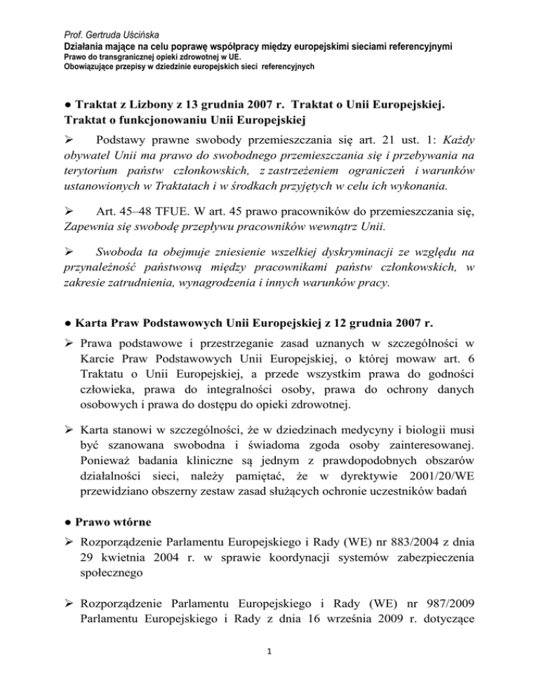Prof. Gertruda Uścińska Działania mające na celu poprawę współpracy między europejskimi sieciami referencyjnymi Prawo do transgranicznej opieki zdrowotnej w UE. Obowiązujące przepisy w dziedzinie europejskich sieci referencyjnych ● Traktat z Lizbony z 13 grudnia 2007 r. Traktat o Unii Europejskiej. Traktat o funkcjonowaniu Unii Europejskiej Podstawy prawne swobody przemieszczania się art. 21 ust. 1: Każdy obywatel Unii ma prawo do swobodnego przemieszczania się i przebywania na terytorium państw członkowskich, z zastrzeżeniem ograniczeń i warunków ustanowionych w Traktatach i w środkach przyjętych w celu ich wykonania. Art. 45–48 TFUE. W art. 45 prawo pracowników do przemieszczania się, Zapewnia się swobodę przepływu pracowników wewnątrz Unii. Swoboda ta obejmuje zniesienie wszelkiej dyskryminacji ze względu na przynależność państwową między pracownikami państw członkowskich, w zakresie zatrudnienia, wynagrodzenia i innych warunków pracy. ● Karta Praw Podstawowych Unii Europejskiej z 12 grudnia 2007 r. Prawa podstawowe i przestrzeganie zasad uznanych w szczególności w Karcie Praw Podstawowych Unii Europejskiej, o której mowaw art. 6 Traktatu o Unii Europejskiej, a przede wszystkim prawa do godności człowieka, prawa do integralności osoby, prawa do ochrony danych osobowych i prawa do dostępu do opieki zdrowotnej. Karta stanowi w szczególności, że w dziedzinach medycyny i biologii musi być szanowana swobodna i świadoma zgoda osoby zainteresowanej. Ponieważ badania kliniczne są jednym z prawdopodobnych obszarów działalności sieci, należy pamiętać, że w dyrektywie 2001/20/WE przewidziano obszerny zestaw zasad służących ochronie uczestników badań ● Prawo wtórne Rozporządzenie Parlamentu Europejskiego i Rady (WE) nr 883/2004 z dnia 29 kwietnia 2004 r. w sprawie koordynacji systemów zabezpieczenia społecznego Rozporządzenie Parlamentu Europejskiego i Rady (WE) nr 987/2009 Parlamentu Europejskiego i Rady z dnia 16 września 2009 r. dotyczące 1 Prof. Gertruda Uścińska Działania mające na celu poprawę współpracy między europejskimi sieciami referencyjnymi Prawo do transgranicznej opieki zdrowotnej w UE. Obowiązujące przepisy w dziedzinie europejskich sieci referencyjnych wykonywania rozporządzenia (WE) nr 883/2004 w sprawie koordynacji systemów zabezpieczenia społecznego Rozporządzenia Parlamentu Europejskiego i Rady (UE) nr 492/2011 z dnia 5 kwietnia 2011 r. w sprawie swobodnego przepływu pracowników wewnątrz Unii Dyrektywa 2004/38/WE Parlamentu Europejskiego i Rady z dnia 29 kwietnia 2004 r. w sprawie prawa obywateli Unii i członków ich rodzin do swobodnego przemieszczania się i pobytu na terytorium państw członkowskich, zmieniająca rozporządzenie (EWG) nr 1612/68 i uchylająca dyrektywy 64/221/EWG, 68/360/EWG, 72/194/EWG, 73/148/EWG, 75/34/EWG, 75/35/EWG, 90/364/EWG, 90/365/EWG i 93/96/EWG Dyrektywa Parlamentu Europejskiego i Rady 2011/24/UE z dnia 9 marca 2011 r. w sprawie stosowania praw pacjentów w transgranicznej opiece zdrowotnej W art. 12 ust. 4 lit. a) dyrektywy Parlamentu Europejskiego i Rady 2011/24/UE z dnia 9 marca 2011 r. w sprawie stosowania praw pacjentów w transgranicznej opiece zdrowotnej nałożono na Komisję obowiązek wspierania rozwoju europejskich sieci referencyjnych poprzez przyjęcie wykazu kryteriów i warunków, które muszą spełniać europejskie sieci referencyjne oraz warunków i kryteriów, których spełnienia wymaga się od świadczeniodawców chcących wstąpić do europejskiej sieci referencyjnej. Członkowie europejskiej sieci referencyjnej będą współpracować ze sobą w określonych dziedzinach wiedzy specjalistycznej. Dyrektywa stanowi, że każdy świadczeniodawca działający na terenie państwa członkowskiego może ubiegać się o status członka europejskiej sieci referencyjnej zgodnie z prawodawstwem państwa członkowskiego, w którym ma siedzibę, i otrzyma taki status, jeśli spełnione zostaną wszystkie ustalone uprzednio kryteria i warunki. Dyrektywa 95/46/WE Parlamentu Europejskiego i Rady z dnia 24 października 1995 r. w sprawie ochrony osób fizycznych w zakresie przetwarzania danych osobowych i swobodnego przepływu tych danych 2 Prof. Gertruda Uścińska Działania mające na celu poprawę współpracy między europejskimi sieciami referencyjnymi Prawo do transgranicznej opieki zdrowotnej w UE. Obowiązujące przepisy w dziedzinie europejskich sieci referencyjnych Dyrektywa 2001/20/WE Parlamentu Europejskiego i Rady z dnia 4 kwietnia 2001 r. w sprawie zbliżania przepisów ustawowych, wykonawczych i administracyjnych państw członkowskich, odnoszących się do wdrożenia zasady dobrej praktyki klinicznej w prowadzeniu badań klinicznych produktów leczniczych, przeznaczonych do stosowania przez człowieka Konkluzje Rady z dnia 22 czerwca 2006 r. w sprawie wspólnych wartości i zasad systemów opieki zdrowotnej Unii Europejskiej Zalecenie Rady z dnia 8 czerwca 2009 r. w sprawie działań w dziedzinie rzadkich chorób Zalecenie Rady dnia 9 czerwca 2009 r. w sprawie bezpieczeństwa pacjentów, w tym profilaktyki i kontroli zakażeń związanych z opieką zdrowotną ● Decyzje Komisji Europejskiej dotyczące europejskich sieci referencyjnych Decyzja delegowana Komisji z dnia 10 marca 2014 r. ustanawiająca kryteria i warunki, które muszą spełniać europejskie sieci referencyjne i świadczeniodawcy chcący wstąpić do europejskiej sieci referencyjnej (tekst mający znaczenie dla EOG) (2014/286/UE) – realizacja art. 12 ust. 4 lit. a Decyzja wykonawcza Komisji z dnia 10 marca 2014 r. w sprawie kryteriów tworzenia i oceny europejskich sieci referencyjnych i ich członków oraz ułatwienia wymiany informacji i wiedzy specjalistycznej w odniesieniu do tworzenia i oceny takich sieci (tekst mający znaczenie dla EOG) (2014/287/UE) – realizacja art. 12 ust. 4 lit. b i c 3