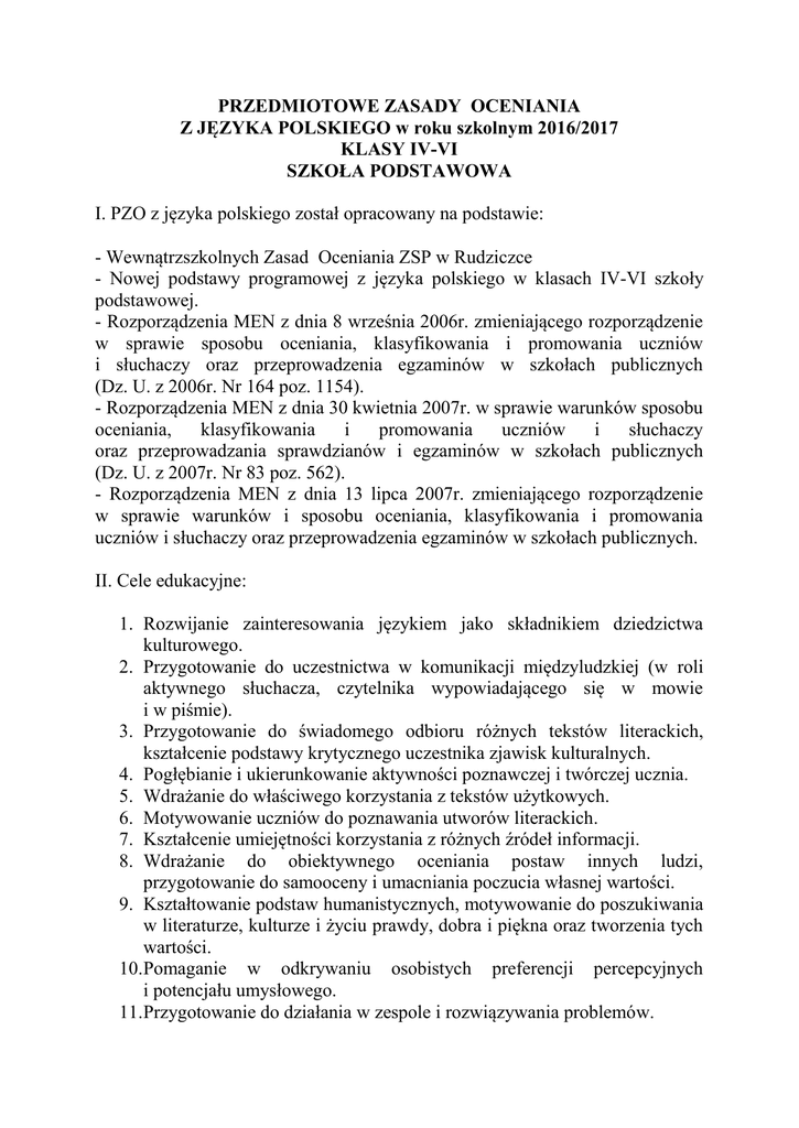 PRZEDMIOTOWE ZASADY OCENIANIA Z JĘZYKA POLSKIEGO w roku szkolnym 2016/2017 KLASY IV-VI SZKOŁA PODSTAWOWA I. PZO z języka polskiego został opracowany na podstawie: - Wewnątrzszkolnych Zasad Oceniania ZSP w Rudziczce - Nowej podstawy programowej z języka polskiego w klasach IV-VI szkoły podstawowej. - Rozporządzenia MEN z dnia 8 września 2006r. zmieniającego rozporządzenie w sprawie sposobu oceniania, klasyfikowania i promowania uczniów i słuchaczy oraz przeprowadzenia egzaminów w szkołach publicznych (Dz. U. z 2006r. Nr 164 poz. 1154). - Rozporządzenia MEN z dnia 30 kwietnia 2007r. w sprawie warunków sposobu oceniania, klasyfikowania i promowania uczniów i słuchaczy oraz przeprowadzania sprawdzianów i egzaminów w szkołach publicznych (Dz. U. z 2007r. Nr 83 poz. 562). - Rozporządzenia MEN z dnia 13 lipca 2007r. zmieniającego rozporządzenie w sprawie warunków i sposobu oceniania, klasyfikowania i promowania uczniów i słuchaczy oraz przeprowadzenia egzaminów w szkołach publicznych. II. Cele edukacyjne: 1. Rozwijanie zainteresowania językiem jako składnikiem dziedzictwa kulturowego. 2. Przygotowanie do uczestnictwa w komunikacji międzyludzkiej (w roli aktywnego słuchacza, czytelnika wypowiadającego się w mowie i w piśmie). 3. Przygotowanie do świadomego odbioru różnych tekstów literackich, kształcenie podstawy krytycznego uczestnika zjawisk kulturalnych. 4. Pogłębianie i ukierunkowanie aktywności poznawczej i twórczej ucznia. 5. Wdrażanie do właściwego korzystania z tekstów użytkowych. 6. Motywowanie uczniów do poznawania utworów literackich. 7. Kształcenie umiejętności korzystania z różnych źródeł informacji. 8. Wdrażanie do obiektywnego oceniania postaw innych ludzi, przygotowanie do samooceny i umacniania poczucia własnej wartości. 9. Kształtowanie podstaw humanistycznych, motywowanie do poszukiwania w literaturze, kulturze i życiu prawdy, dobra i piękna oraz tworzenia tych wartości. 10.Pomaganie w odkrywaniu osobistych preferencji percepcyjnych i potencjału umysłowego. 11.Przygotowanie do działania w zespole i rozwiązywania problemów. III. Sposoby sprawdzania wiadomości i umiejętności uczniów: 1. Uczeń otrzymuje oceny w skali 1-6; wartość oceny cząstkowej może podwyższać „+” lub obniżać „-”. 2. Oceny będą wystawiane za następujące formy sprawdzania wiadomości i umiejętności: - zadania klasowe, - testy, sprawdziany językowe i gramatyczne, - prace domowe, - wypowiedzi ustne, - czytanie, - recytację - dyktanda, - kartkówki, - prowadzenie zeszytu przedmiotowego, - prace dodatkowe, prace dla chętnych, - udział w konkursach, - pracę w grupach. 3. Prace klasowe i pisemne na jednej lub dwóch godzinach lekcyjnych obejmują prace twórcze i sprawdzają stopień opanowania poznanych form wypowiedzi pisemnych. 4. Testy i sprawdziany wiadomości (językowych i gramatycznych) przeprowadzane są po omówieniu określonej partii materiału. Są zapowiadane i wpisywane do dziennika z tygodniowym uprzedzeniem i poprzedzone powtórzeniem. 5. Sprawdziany i testy oceniane są według systemu punktowego: cel – 100% sumy punktów bdb – 100%-90% db – 89%-75% dst – 74%-51% dop – 50%-40% ndst – 39%-0% 6. Dyktanda przeprowadza się po wprowadzeniu określonych ortograficznych i interpunkcyjnych . Oceniane są następująco: bdb – brak błędów, ewentualnie 1 błąd drugorzędny db – 1-2 błędy dst – 3-4 błędy zasad dop – 5-6 błędów ndst. – 7 i więcej błędów Błąd ort. I stopnia (u, ó, rz, ż, h, ch, wielkie i małe litery, nie z czasownikami) – 3 punkty. Błąd ort. II stopnia (łączna i rozdzielna pisownia nie z innymi częściami mowy, pisownia przyimków złożonych i wyrażeń przyimkowych ,pisownia cząstek bym, -byś, -by…, pisownia ą, ę, on, en, om, em, pisownia -ii, -i, -ji ,inne) b – 2 punkty. Błąd ort .III stopnia (interpunkcja, literówki) – 1 punkt. Może zaistnieć sytuacja, że nauczyciel zmieni kryteria oceniania dyktanda, np. w związku ze stopniem jego trudności. Uczniowie zostaną o tym poinformowani. 7. Kartkówki dotyczą materiału z trzech ostatnich lekcji lub sprawdzają pracę domową. Mogą, ale nie muszą być zapowiedziane. 8. Zadania domowe: prace literackie, ćwiczenia językowe, wyszukiwanie materiałów i pomocy, korzystanie ze słownika, encyklopedii i innych źródeł kontrolowane są na bieżąco. Prace domowe mogą być krótkie i długoterminowe. Nauczyciel nie usprawiedliwia braku pracy domowej, na przygotowanie której uczeń miał dłuższy okres czasu. 9. Prace domowe ucznia podlegają sprawdzeniu, ale nie zawsze ocenie w formie stopnia. 10. Prowadzenie zeszytu przedmiotowego jest obowiązkowe. Dwa razy w trakcie roku szkolnego (raz w semestrze), za prowadzenie zeszytu uczeń otrzymuje ocenę. Przy ocenianiu bierze się pod uwagę: estetykę zeszytu, staranność i poprawność zapisu oraz systematyczność w zapisach lekcyjnych. 11. Wypowiedzi pisemne twórcze oceniane są według następujących kryteriów: - zgodność z tematem, - zachowanie formy, - bogactwo językowe, - poprawność językowa, - poprawność ortograficzna i interpunkcyjna, - szata graficzna wypowiedzi. 12. Wypowiedzi ustne to udział i przygotowanie ucznia do zajęć oraz spójna odpowiedź na pytanie nauczyciela. W odpowiedzi ustnej ocenie podlega: - znajomość zagadnienia, - samodzielność wypowiedzi, - zasób słownictwa, - stylistyka wypowiedzi. 13. W trakcie roku szkolnego uczniowie przygotowują przynajmniej dwie recytacje fragmentów prozy lub utworu poetyckiego w zależności od wymagań. Kryteria recytacji utworu z pamięci: - zgodność tekstu, - płynność recytacji, - dostosowanie tempa recytacji i barwy głosu do treści oraz nastroju wybranego fragmentu, - postawa, gesty i mimika recytatora. 14.Przynajmiej raz w półroczu każdy uczeń otrzyma ocenę za czytanie tekstu literackiego. Kryteria czytania: -głośność, wyrazistość, 