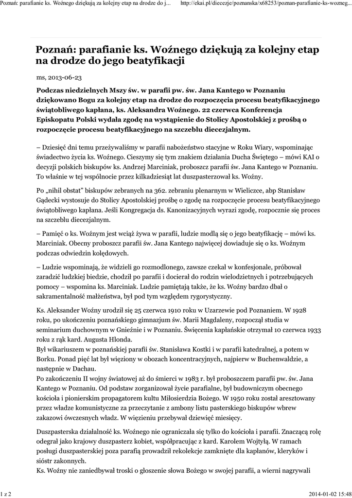 Poznań: parafianie ks. Woźnego dziękują za kolejny etap na drodze do j... 1z2 http://ekai.pl/diecezje/poznanska/x68253/poznan-parafianie-ks-wozneg... Poznań: parafianie ks. Woźnego dziękują za kolejny etap na drodze do jego beatyfikacji ms, 2013-06-23 Podczas niedzielnych Mszy św. w parafii pw. św. Jana Kantego w Poznaniu dziękowano Bogu za kolejny etap na drodze do rozpoczęcia procesu beatyfikacyjnego świątobliwego kapłana, ks. Aleksandra Woźnego. 22 czerwca Konferencja Episkopatu Polski wydała zgodę na wystąpienie do Stolicy Apostolskiej z prośbą o rozpoczęcie procesu beatyfikacyjnego na szczeblu diecezjalnym. – Dziesięć dni temu przeżywaliśmy w parafii nabożeństwo stacyjne w Roku Wiary, wspominając świadectwo życia ks. Woźnego. Cieszymy się tym znakiem działania Ducha Świętego – mówi KAI o decyzji polskich biskupów ks. Andrzej Marciniak, proboszcz parafii św. Jana Kantego w Poznaniu. To właśnie w tej wspólnocie przez kilkadziesiąt lat duszpasterzował ks. Woźny. Po „nihil obstat” biskupów zebranych na 362. zebraniu plenarnym w Wieliczce, abp Stanisław Gądecki wystosuje do Stolicy Apostolskiej prośbę o zgodę na rozpoczęcie procesu beatyfikacyjnego świątobliwego kapłana. Jeśli Kongregacja ds. Kanonizacyjnych wyrazi zgodę, rozpocznie się proces na szczeblu diecezjalnym. – Pamięć o ks. Woźnym jest wciąż żywa w parafii, ludzie modlą się o jego beatyfikację – mówi ks. Marciniak. Obecny proboszcz parafii św. Jana Kantego najwięcej dowiaduje się o ks. Woźnym podczas odwiedzin kolędowych. – Ludzie wspominają, że widzieli go rozmodlonego, zawsze czekał w konfesjonale, próbował zaradzić ludzkiej biedzie, chodził po parafii i docierał do rodzin wielodzietnych i potrzebujących pomocy – wspomina ks. Marciniak. Ludzie pamiętają także, że ks. Woźny bardzo dbał o sakramentalność małżeństwa, był pod tym względem rygorystyczny. Ks. Aleksander Woźny urodził się 25 czerwca 1910 roku w Uzarzewie pod Poznaniem. W 1928 roku, po ukończeniu poznańskiego gimnazjum św. Marii Magdaleny, rozpoczął studia w seminarium duchownym w Gnieźnie i w Poznaniu. Święcenia kapłańskie otrzymał 10 czerwca 1933 roku z rąk kard. Augusta Hlonda. Był wikariuszem w poznańskiej parafii św. Stanisława Kostki i w parafii katedralnej, a potem w Borku. Ponad pięć lat był więziony w obozach koncentracyjnych, najpierw w Buchenwaldzie, a następnie w Dachau. Po zakończeniu II wojny światowej aż do śmierci w 1983 r. był proboszczem parafii pw. św. Jana Kantego w Poznaniu. Od podstaw zorganizował życie parafialne, był budowniczym obecnego kościoła i pionierskim propagatorem kultu Miłosierdzia Bożego. W 1950 roku został aresztowany przez władze komunistyczne za przeczytanie z ambony listu pasterskiego biskupów wbrew zakazowi ówczesnych władz. W więzieniu przebywał dziewięć miesięcy. Duszpasterska działalność ks. Woźnego nie ograniczała się tylko do kościoła i parafii. Znaczącą rolę odegrał jako krajowy duszpasterz kobiet, współpracując z kard. Karolem Wojtyłą. W ramach posługi duszpasterskiej poza parafią prowadził rekolekcje zamknięte dla kapłanów, kleryków i sióstr zakonnych. Ks. Woźny nie zaniedbywał troski o głoszenie słowa Bożego w swojej parafii, a wierni nagrywali 2014-01-02 15:48 Poznań: parafianie ks. Woźnego dziękują za kolejny etap na drodze do j... 2z2 http://ekai.pl/diecezje/poznanska/x68253/poznan-parafianie-ks-wozneg... jego kazania, przepisywali je na maszynie i powielali w wielu egzemplarzach. Był cenionym rekolekcjonistą i kaznodzieją. Mimo licznych obowiązków przez wszystkie lata swojego kapłaństwa był gorliwym spowiednikiem. Posługę w konfesjonale postrzegał jako jeden z najważniejszych darów zadanych mu przez Pana Boga. Często wieczorami otwierał kościół, żeby spowiadać przybywających do świątyni penitentów. Trzydzieści lat temu jako przedstawiciel złotych jubilatów koncelebrował z Janem Pawłem II Mszę św. podczas pierwszej papieskiej pielgrzymki do Poznania połączonej z beatyfikacją matki Urszuli Ledóchowskiej. 2014-01-02 15:48