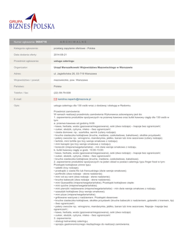 Numer ogłoszenia: 9684716 A RCHI WA L N E Kategoria ogłoszenia: przetarg zapytanie ofertowe - Polska Data dodania oferty: 2014-08-21 Przedmiot ogłoszenia: usługa cateringu Organizator: Urząd Marszałkowski Województwa Mazowieckiego w Warszawie Adres: ul. Jagiellońska 26, 03-719 Warszawa Województwo / powiat: mazowieckie, pow. Warszawa Państwo: Polska Telefon / fax: (22) 59-79-508 E-mail: Opis: [email protected] usługa cateringu dla 130 osób wraz z dostawą i obsługą w Radomiu. Przedmiot zamówienia: W ramach realizacji przedmiotu zamówienia Wykonawca zobowiązany jest do: 1. zapewnienia produktów spożywczych na przerwę kawowa oraz bufet kawowy ciągły dla 130 osób w tym: a. przerwa kawowa od godziny 9:00: • kawa, herbata, woda (gazowana/niegazowana), soki (dwa rodzaje) - /napoje bez ograniczeń/; • cukier, słodzik, cytryna, mleko - /bez ograniczeń/; • ciasta domowe: np.: szarlotka, sernik (cztery rodzaje); • kruche ciasteczka koktajlowe (kruche, maślane, czekoladowe, bakaliowe), słodkie przystawki; • patery owoców np.: winogrono, mandarynka, jabłko, banan lub inne sezonowe (cztery rodzaje); • tartinki, mini tortille (po trzy wersje smakowe z rodzaju); • mini kanapki (po trzy wersje smakowe z rodzaju); • koreczki (mięsne/wegetariańskie) - min dwie wersje smakowe z rodzaju. b. bufet kawowy ciągły w godz. 10:00-13:00: • kawa, herbata, woda (gazowana/niegazowana), soki (dwa rodzaje) - /napoje bez ograniczeń/; • cukier, słodzik, cytryna, mleko - /bez ograniczeń/; • kruche ciasteczka koktajlowe (kruche, maślane, czekoladowe, bakaliowe). 2. zapewnienie produktów spożywczych na jeden obiad w postaci cateringu typu finger food w tym: Przekąski koktajlowe zimne typu: • sałatki (trzy rodzaje); • przekąski z ciasta filo lub francuskiego (dwie wersje smakowe); • porfitrolki (dwa rodzaje - słone nadzienie); • mini vol-au-vent (dwa rodzaje - słone nadzienie); • kruche babeczki (dwa rodzaje - słone nadzienie); • mini Quesadilla (mięsne/wegetariańskie); Przekąski koktajlowe ciepłe: • mini quiche (mięsne/wegetariańskie); • mini pierożki nadziewane (mięsne/wegetariańskie) - min dwie wersje smakowe z rodzaju; • szaszłyki koktajlowe (trzy wersje smakowe); • mini pizze (mięsne/wegetariańskie); • grillowane warzywa z nadzieniem. Przekąski deserowe: • kruche ciasteczka koktajlowe, słodkie przystawki (kruche babeczki z nadzieniem, galaretki z kremem, itp) - /bez ograniczeń/; • patery owoców np.: winogrono, mandarynka, jabłko, banan lub inne sezonowe. Napoje- /napoje bez ograniczeń/;: • kawa, herbata, woda (gazowana/niegazowana), soki (dwa rodzaje) • cukier, słodzik, cytryna, mleko - /bez ograniczeń/. 3. zapewnienia: • obsługi kelnerskiej cateringu; • sprzętu gastronomicznego niezbędnego do realizacji zamówienia; • zastawy wielorazowej w ilości zapewniającej komfortową obsługę 130 osób w przerwach kawowych jak również podczas obiadu; • serwetek oraz niezbędnych sztućców wielorazowych/przerwy kawowe oraz sztućce do sałatek/; • eleganckich dekoracji oraz estetycznej ekspozycji pożywienia; • spakowania pozostałej żywności w pojemniki. Miejsce i termin składania ofert: Miejsce i termin złożenia ofert: ofertę należy złożyć do dnia 26 sierpnia 2014 r. do godziny 16.0 o — drogą elektroniczną: e-mail [email protected] Termin składania: 2014-08-26 Miejsce i termin realizacji: Termin realizacji zamówienia: - W terminie 25 września 2014 r. - Lokalizacja: Mazowieckie Centrum Sztuki Współczesnej „Elektrownia" w Radomiu, ul. Kopernika 1 - Przerwy kawowej od godz 9:00 - Ciągłego bufetu kawowego od godz 10:00 -13:00 - Obiad godzina 13:00 - 14:00 Wymagania: Oferta powinna zawierać (określić wymagania jakie powinni spełniać wykonawcy w zakresie uprawnień, doświadczenia, kwalifikacji osób oraz wymienić dokumenty i oświadczenia jakie powinni złożyć wykonawcy): Szczegółowe menu wraz z podaniem ceny za jedną osobę. Uwagi: Kryteria oceny ofert (opis kryteriów i zasad przyznawania punktów): 100 % - cena - koszt osobowy cateringu Kontakt: Miejsce lub sposób uzyskania informacji oraz dodatkowej dokumentacji określającej szczegółowe wymogi dotyczące przedmiotu zamówienia: Karolina Naperty-Nasiłowska, Wydział Marketingu Terytorialnego, tel. (22) 59-79-508; e-mail: [email protected] Numer dokumentu: KP-TP-I.5040.12.2014.KN Źródło: Internet i własne Załączniki: ZIP załącznik