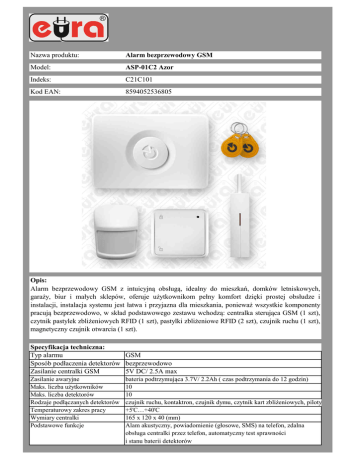 Nazwa produktu: Alarm bezprzewodowy GSM Model: ASP-01C2 Azor Indeks: C21C101 Kod EAN: 8594052536805 Opis: Alarm bezprzewodowy GSM z intuicyjną obsługą, idealny do mieszkań, domków letniskowych, garaży, biur i małych sklepów, oferuje użytkownikom pełny komfort dzięki prostej obsłudze i instalacji, instalacja systemu jest łatwa i przyjazna dla mieszkania, ponieważ wszystkie komponenty pracują bezprzewodowo, w skład podstawowego zestawu wchodzą: centralka sterująca GSM (1 szt), czytnik pastylek zbliżeniowych RFID (1 szt), pastylki zbliżeniowe RFID (2 szt), czujnik ruchu (1 szt), magnetyczny czujnik otwarcia (1 szt). Specyfikacja techniczna: Typ alarmu GSM Sposób podłaczenia detektorów bezprzewodowo Zasilanie centralki GSM 5V DC/ 2.5A max Zasilanie awaryjne Maks. liczba użytkowników Maks. liczba detektorów Rodzaje podłączanych detektorów Temperaturowy zakres pracy Wymiary centralki Podstawowe funkcje bateria podtrzymująca 3.7V/ 2.2Ah ( czas podtrzymania do 12 godzin) 10 10 czujnik ruchu, kontaktron, czujnik dymu, czytnik kart zbliżeniowych, piloty +5'C…+40'C 165 x 120 x 40 (mm) Alam akustyczny, powiadomienie (głosowe, SMS) na telefon, zdalna obsługa centralki przez telefon, automatyczny test sprawności i stanu baterii detektorów