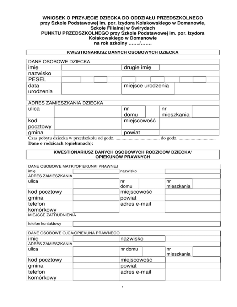 WNIOSEK O PRZYJĘCIE DZIECKA DO ODDZIAŁU PRZEDSZKOLNEGO przy Szkole Podstawowej im. por. Izydora Kołakowskiego w Domanowie, Szkole Filialnej w Świrydach PUNKTU PRZEDSZKOLNEGO przy Szkole Podstawowej im. por. Izydora Kołakowskiego w Domanowie na rok szkolny ……./……. KWESTIONARIUSZ DANYCH OSOBOWYCH DZIECKA DANE OSOBOWE DZIECKA imię nazwisko PESEL data urodzenia drugie imię miejsce urodzenia ADRES ZAMIESZKANIA DZIECKA ulica nr domu miejscowość kod pocztowy gmina nr mieszkania powiat Czas pobytu dziecka w przedszkolu od godz. ..................................... do godz. ............................... Dane o rodzicach (opiekunach): KWESTIONARIUSZ DANYCH OSOBOWYCH RODZICÓW DZIECKA/ OPIEKUNÓW PRAWNYCH DANE OSOBOWE MATKI/OPIEKUNKI PRAWNEJ imię nazwisko ADRES ZAMIESZKANIA ulica nr domu kod pocztowy gmina telefon komórkowy miejscowość powiat adres e-mail nr mieszkania MIEJSCE ZATRUDNIENIA telefon kontaktowy DANE OSOBOWE OJCA/OPIEKUNA PRAWNEGO imię nazwisko ADRES ZAMIESZKANIA ulica nr domu kod pocztowy gmina telefon komórkowy miejscowość powiat adres e-mail 1 nr mieszkania MIEJSCE ZATRUDNIENIA telefon kontaktowy KRYTERIA PRZYJĘĆ (w przypadku spełniania danego kryterium proszę postawić znak „X”) Kryteria obowiązkowe opracowane zgodnie z nowelizacją Ustawy o Systemie Oświaty z dnia 18.01.2014r. (Dz. U. 2014r., poz.7) w zakresie zasad i kryteriów rekrutacji do przedszkola i placówek oświatowych 1. Wielodzietność rodziny kandydata 2. załącznik: oświadczenie o wielodzietności rodziny kandydata. Niepełnosprawność kandydata 3. załącznik: orzeczenie o potrzebie kształcenia specjalnego wydane ze względu na niepełnosprawność, orzeczenie o niepełnosprawności lub o stopniu niepełnosprawności lub orzeczenie równoważne w rozumieniu przepisów ustawy z dnia 27 sierpnia 1997 r. rehabilitacji zawodowej i społecznej oraz zatrudnianiu osób niepełnosprawnych (Dz.U. z 2011 r. nr 127, poz. 721 ze zm.). Niepełnosprawność jednego z rodziców kandydata 4. Załącznik: orzeczenie o niepełnosprawności lub o stopniu niepełnosprawności lub orzeczenie równoważne w rozumieniu przepisów ustawy z dnia 27 sierpnia 1997 r. rehabilitacji zawodowej i społecznej oraz zatrudnianiu osób niepełnosprawnych (Dz.U. z 2011 r. nr 127, poz. 721 ze zm.). Niepełnosprawność obojga rodziców kandydata 5. załącznik: orzeczenie o niepełnosprawności lub o stopniu niepełnosprawności lub orzeczenie równoważne w rozumieniu przepisów ustawy z dnia 27 sierpnia 1997 r. rehabilitacji zawodowej i społecznej oraz zatrudnianiu osób niepełnosprawnych (Dz.U. z 2011 r. nr 127, poz. 721 ze zm.). Niepełnosprawność rodzeństwa kandydata 6. załącznik: orzeczenie o potrzebie kształcenia specjalnego wydane ze względu na niepełnosprawność, orzeczenie o niepełnosprawności lub o stopniu niepełnosprawności lub orzeczenie równoważne w rozumieniu przepisów ustawy z dnia 27 sierpnia 1997 r. rehabilitacji zawodowej i społecznej oraz zatrudnianiu osób niepełnosprawnych (Dz.U. z 2011 r. nr 127, poz. 721 ze zm.). Samotne wychowywanie kandydata w rodzinie 7. załącznik: prawomocny wyrok sądu rodzinnego orzekający rozwód lub separację lub akt zgonu oraz oświadczenie o samotnym wychowywaniu dziecka oraz niewychowywaniu żadnego dziecka wspólnie z jego rodzicem). Objęcie kandydata pieczą zastępczą załącznik: dokument potwierdzający objęcie dziecka pieczą zastępczą zgodnie z ustawą z dnia 9 czerwca 2011 r. o wspieraniu rodziny i systemie pieczy zastępczej (Dz.U. z 2013 r. poz.135). Kryteria dodatkowe 1. 2. Uczęszczanie starszego rodzeństwo kandydata w roku szkolnym 2014/2015 przedszkola, do którego został złożony wniosek Aktywność zawodowa obu rodziców kandydata (oboje rodzice pracujący/ uczący się) załącznik: zaświadczenia o zatrudnieniu/ zaświadczenie z uczelni do INFORMACJE O DZIECKU Informacje o stanie zdrowia dziecka mogące mieć znaczenie podczas pobytu dziecka w przedszkolu 2 Czy akceptuje Pani/Pan przebywanie dziecka w grupie z udziałem dzieci niepełnosprawnych ? tak/nie ( właściwe proszę podkreślić) OŚWIADCZENIE: podane przeze mnie informacje w niniejszej karcie są zgodne ze stanem faktycznym, zobowiązuję się do aktualizowania powyższych danych. OŚWIADCZENIE : w przypadku niemożliwości skontaktowania się ze mną wyrażam/ nie wyrażam( właściwe podkreślić) zgody na udzielenie dziecku pomocy lekarskiej ( dotyczy nagłych wypadków). ………………………………………………….. (podpis rodzica lub opiekuna prawnego) Zgodnie z art. 23 Ustawy z dnia 29 sierpnia 1997 r. o ochronie danych osobowych (Dz. U. z 2002 r. Nr 101, poz. 926 ze zm.) wyrażam zgodę na przetwarzanie danych osobowych zawartych w niniejszym formularzu w celu przyjęcia dziecka do oddziału przedszkolnego w roku 2014/2015. Administratorem danych jest dyrektor Szkoły Podstawowej im. por. Izydora Kołakowskiego w Domanowie do, którego został złożona karta zgłoszenia dziecka. Wyrażam zgodę na zbieranie, przetwarzanie i wykorzystywanie danych osobowych w celach związanych z pobytem dziecka w oddziale przedszkolnym. Mam świadomość przysługującego mi prawa wglądu do treści danych oraz ich poprawiania. Dane podaję dobrowolnie. Domanowo, dnia ............................................... ………………………...................................... (podpis rodziców/ prawnych opiekunów dziecka) . DECYZJA KOMISJI KWALIFIKACYJNEJ: Na posiedzeniu w dniu ............................. zakwalifikowano - nie zakwalifikowano dziecko/a do oddziału przedszkolnego . Uzasadnienie nie zakwalifikowania: …………………………………………………………………………………………………… Podpis przewodniczącego Komisji Podpisy członków komisji Dane o szkole: Adres: Szkoła Podstawowa im. por. Izydora Kołakowskiego w Domanowie Domanowo 19a, 17-120 Brańsk Tel: 857377001 Adres internetowy szko