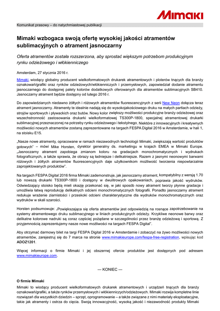 Komunikat prasowy – do natychmiastowej publikacji Mimaki wzbogaca swoją ofertę wysokiej jakości atramentów sublimacyjnych o atrament jasnoczarny Oferta atramentów została rozszerzona, aby sprostać większym potrzebom produkcyjnym rynku odzieżowego i włókienniczego Amsterdam, 27 stycznia 2016 r. Mimaki, wiodący globalny producent wielkoformatowych drukarek atramentowych i ploterów tnących dla branży oznakowań/grafiki oraz rynków odzieżowych/włókienniczych i przemysłowych, zapowiedział dodanie atramentu jasnoczarnego do dostępnej palety kolorów dodatkowych oferowanych dla atramentów sublimacyjnych SB410. Jasnoczarny atrament będzie dostępny od lutego 2016 r. Do zapowiedzianych niedawno żółtych i różowych atramentów fluorescencyjnych z serii New Neon dołącza teraz atrament jasnoczarny. Atramenty te idealnie nadają się do wysokojakościowego druku na małych partiach odzieży, strojów sportowych i pływackich oraz butów. Nowy kolor zwiększy możliwości produkcyjne branży odzieżowej oraz wszechstronność zastosowania drukarki wielkoformatowej TS300P-1800, specjalnej atramentowej drukarki sublimacyjnej przeznaczonej na potrzeby rynku odzieżowego i tekstylnego. Niektóre z innowacyjnych i kreatywnych możliwości nowych atramentów zostaną zaprezentowane na targach FESPA Digital 2016 w Amsterdamie, w hali 1, na stoisku E15. „Nasze nowe atramenty, opracowane w ramach niezawodnych technologii Mimaki, zwiększają wartość produktów gotowych” – mówi Mike Horsten, dyrektor generalny ds. marketingu w krajach EMEA w Mimaki Europe. „Jasnoczarny atrament zapobiega zmianom koloru na gradacjach monochromatycznych i wydrukach fotograficznych, a także sprawia, że obrazy są ładniejsze i delikatniejsze. Razem z jasnymi neonowymi barwami różowych i żółtych atramentów fluorescencyjnych daje użytkownikom możliwość tworzenia niepowtarzalnie zaprojektowanych produktów”. Na targach FESPA Digital 2016 firma Mimaki zademonstruje, jak jasnoczarny atrament, kompatybilny z wersją 1.70 lub nowszą drukarki TS300P-1800 i dostępny w dwulitrowych opakowaniach, poprawia jakość wydruków. Odwiedzający stoisko będą mieli okazję przekonać się, w jaki sposób nowy atrament tworzy płynne gradacje i umożliwia łatwą reprodukcję delikatnych odcieni monochromatycznych fotografii. Ponadto jasnoczarny atrament redukuje wrażenie ziarnistości i przeskoki odcieni charakterystyczne dla wydruków monochromatycznych oraz wydruków w skali szarości. Horsten podsumowuje: „Powiększająca się oferta atramentów jest odpowiedzią na rosnące zapotrzebowanie na systemy atramentowego druku sublimacyjnego w liniach produkcyjnych odzieży. Krzykliwe neonowe barwy oraz delikatne kolorowe nadruki są coraz częściej pożądane w szczególności przez branżę odzieżową i sportową. Z przyjemnością zaprezentujemy nasze nowe możliwości na targach FESPA Digital”. Aby otrzymać darmowy bilet na targi FESPA Digital 2016 w Amsterdamie i zobaczyć na żywo możliwości nowych atramentów, zarejestruj się do 7 marca na stronie www.mimakieurope.com/fespa-free-registration, wpisując kod ADOZ1201. Więcej informacji o firmie Mimaki i jej obszernej ofercie produktów jest dostępnych pod adresem www.mimakieurope.com. --- KONIEC --O firmie Mimaki Mimaki to wiodący producent wielkoformatowych drukarek atramentowych i urządzeń tnących dla branży oznakowań/grafiki, a także rynków przemysłowych i włókienniczych/odzieżowych. Mimaki rozwija kompletne linie rozwiązań dla wszystkich dziedzin – sprzęt, oprogramowanie – a także związane z nimi materiały eksploatacyjne, takie jak atramenty i ostrza do cięcia. Swoją innowacyjność, wysoką jakość i niezawodność produkty Mimaki zawdzięczają technologii wodnych, lateksowych, solwentowych atramentów utrwalanych diodami UV. Aby odpowiedzieć na różnorodne zapotrzebowania rynku, firma Mimaki pracuje nad rozwojem zaawansowanych rozwiązań druku cyfrowego na żądanie. Firma Mimaki Engineering Co. Ltd., (Prezes: Hisayuki Kobayashi) Nagano (Japonia) jest oficjalnie notowana na Giełdzie Papierów Wartościowych Tokyo Stock Exchange, Inc. Śledź Mimaki EMEA na . Dane kontaktowe: Ivan Lesmana, menedżer ds. komunikacji marketingowej, Mimaki Europe B.V., Tel.: +31 20 462 76 42, E-mail: [email protected] Mike Horsten, główny menedżer ds. marketingu w EMEA, Mimaki Europe B.V., Tel.: +31 20 462 76 42, E-mail: [email protected] Kontakt z prasą: Maya Staels, duomedia Tel.: +32 487 98 21 61, E-mail: [email protected]